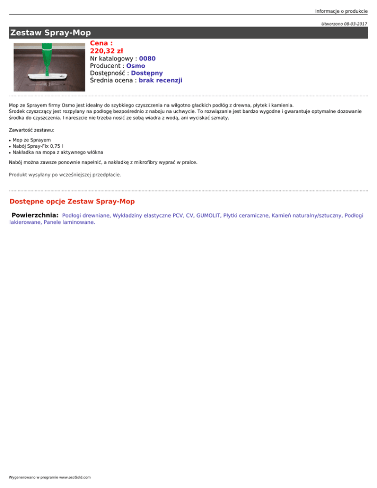 Informacje o produkcie Utworzono 08-03-2017 Zestaw Spray-Mop Cena : 220,32 zł Nr katalogowy : 0080 Producent : Osmo Dostępność : Dostępny Średnia ocena : brak recenzji Mop ze Sprayem firmy Osmo jest idealny do szybkiego czyszczenia na wilgotno gładkich podłóg z drewna, płytek i kamienia. Środek czyszczący jest rozpylany na podłogę bezpośrednio z naboju na uchwycie. To rozwiązanie jest bardzo wygodne i gwarantuje optymalne dozowanie środka do czyszczenia. I nareszcie nie trzeba nosić ze sobą wiadra z wodą, ani wyciskać szmaty. Zawartość zestawu: ● ● ● Mop ze Sprayem Nabój Spray-Fix 0,75 l Nakładka na mopa z aktywnego włókna Nabój można zawsze ponownie napełnić, a nakładkę z mikrofibry wyprać w pralce. Produkt wysyłany po wcześniejszej przedpłacie. Dostępne opcje Zestaw Spray-Mop Powierzchnia: Podłogi drewniane, Wykładziny elastyczne PCV, CV, GUMOLIT, Płytki ceramiczne, Kamień naturalny/sztuczny, Podłogi lakierowane, Panele laminowane. Wygenerowano w programie www.oscGold.com