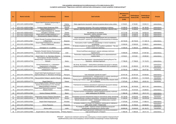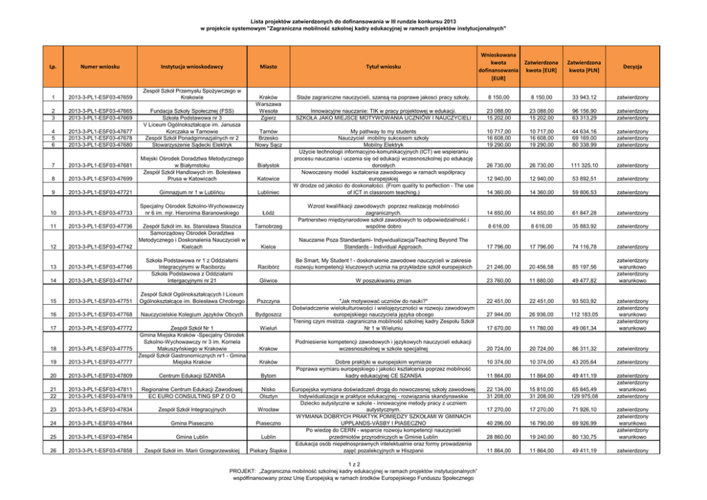 Lista projektów zatwierdzonych do dofinansowania w III rundzie konkursu 2013 w projekcie systemowym "Zagraniczna mobilność szkolnej kadry edukacyjnej w ramach projektów instytucjonalnych" Lp. Numer wniosku Instytucja wnioskodawcy 1 2013-3-PL1-ESF03-47659 Zespół Szkół Przemysłu Spożywczego w Krakowie 2 3 2013-3-PL1-ESF03-47665 2013-3-PL1-ESF03-47669 4 5 6 2013-3-PL1-ESF03-47677 2013-3-PL1-ESF03-47678 2013-3-PL1-ESF03-47680 7 2013-3-PL1-ESF03-47681 8 Fundacja Szkoły Społecznej (FSS) Szkoła Podstawowa nr 3 V Liceum Ogólnokształcące im. Janusza Korczaka w Tarnowie Zespół Szkół Ponadgimnazjalnych nr 2 Stowarzyszenie Sądecki Elektryk Miasto Tytuł wniosku Wnioskowana kwota dofinansowania [EUR] Kraków Warszawa Wesoła Zgierz Staże zagraniczne nauczycieli, szansą na poprawe jakosci pracy szkoły. 8 150,00 8 150,00 33 943,12 zatwierdzony Innowacyjne nauczanie: TIK w pracy projektowej w edukacji. SZKOŁA JAKO MIEJSCE MOTYWOWANIA UCZNIÓW I NAUCZYCIELI 23 088,00 15 202,00 23 088,00 15 202,00 96 156,90 63 313,29 zatwierdzony zatwierdzony My pathway to my students Nauczyciel mobilny sukcesem szkoły Mobilny Elektryk Użycie technologii informacyjno-komunikacyjnych (ICT) we wspieraniu procesu nauczania i uczenia się od edukacji wczesnoszkolnej po edukację dorosłych Nowoczesny model kształcenia zawodowego w ramach współpracy europejskiej W drodze od jakości do doskonałości. (From quality to perfection - The use of ICT in classroom teaching.) 10 717,00 16 608,00 19 290,00 10 717,00 16 608,00 19 290,00 44 634,16 69 169,00 80 338,99 zatwierdzony zatwierdzony zatwierdzony 26 730,00 26 730,00 111 325,10 zatwierdzony 12 940,00 12 940,00 53 892,51 zatwierdzony 14 360,00 14 360,00 59 806,53 zatwierdzony 14 850,00 14 850,00 61 847,28 zatwierdzony 8 616,00 8 616,00 35 883,92 zatwierdzony zatwierdzony Tarnów Brzesko Nowy Sącz 2013-3-PL1-ESF03-47699 Miejski Ośrodek Doradztwa Metodycznego w Białymstoku Zespół Szkół Handlowych im. Bolesława Prusa w Katowicach Katowice 9 2013-3-PL1-ESF03-47721 Gimnazjum nr 1 w Lublińcu Lubliniec 10 2013-3-PL1-ESF03-47733 Specjalny Ośrodek Szkolno-Wychowawczy nr 6 im. mjr. Hieronima Baranowskiego Łódź 11 2013-3-PL1-ESF03-47736 12 2013-3-PL1-ESF03-47742 13 2013-3-PL1-ESF03-47746 14 2013-3-PL1-ESF03-47747 Szkoła Podstawowa nr 1 z Oddziałami Integracyjnymi w Raciborzu Szkoła Podstawowa z Oddziałami Intergacyjnymi nr 21 15 2013-3-PL1-ESF03-47751 16 Białystok Zatwierdzona kwota [EUR] Zatwierdzona kwota [PLN] Decyzja Tarnobrzeg Wzrost kwalifikacji zawodowych poprzez realizację mobilności zagranicznych. Partnerstwo międzynarodowe szkół zawodowych to odpowiedzialność i wspólne dobro Kielce Nauczanie Poza Standardami- Indywidualizacja/Teaching Beyond The Standards - Individual Approach. 17 796,00 17 796,00 74 116,78 Racibórz Be Smart, My Student ! - doskonalenie zawodowe nauczycieli w zakresie rozwoju kompetencji kluczowych ucznia na przykładzie szkół europejskich 21 246,00 20 456,58 85 197,56 Gliwice W poszukiwaniu zmian 23 760,00 11 880,00 49 477,82 Zespół Szkół Ogólnokształcących I Liceum Ogólnokształcące im. Bolesława Chrobrego Pszczyna 22 451,00 22 451,00 93 503,92 2013-3-PL1-ESF03-47768 Nauczycielskie Kolegium Języków Obcych Bydgoszcz 27 944,00 26 936,00 112 183,05 17 2013-3-PL1-ESF03-47772 Wieluń 17 670,00 11 780,00 49 061,34 zatwierdzony zatwierdzony warunkowo zatwierdzony warunkowo 18 2013-3-PL1-ESF03-47775 Krakow Podniesienie kompetencji zawodowych i językowych nauczycieli edukacji wczesnoszkolnej w szkole specjalnej 20 724,00 20 724,00 86 311,32 zatwierdzony 19 2013-3-PL1-ESF03-47777 Zespół Szkół Nr 1 Gmina Miejska Kraków -Specjalny Ośrodek Szkolno-Wychowawczy nr 3 im. Kornela Makuszyńskiego w Krakowie Zespół Szkół Gastronomicznych nr1 - Gmina Miejska Kraków "Jak motywować uczniów do nauki?" Doświadczenie wielokulturowości i wielojęzyczności w rozwoju zawodowym europejskiego nauczyciela języka obcego Trening czyni mistrza -zagraniczna mobilność szkolnej kadry Zespołu Szkół Nr 1 w Wieluniu 10 374,00 10 374,00 43 205,64 zatwierdzony 20 2013-3-PL1-ESF03-47809 Centrum Edukacji SZANSA 11 864,00 11 864,00 49 411,19 21 22 2013-3-PL1-ESF03-47811 2013-3-PL1-ESF03-47819 Regionalne Centrum Edukacji Zawodowej EC EURO CONSULTING SP Z O O 22 134,00 31 208,00 15 810,00 31 208,00 65 845,49 129 975,08 zatwierdzony zatwierdzony warunkowo zatwierdzony 23 2013-3-PL1-ESF03-47834 Zespół Szkół Integracyjnych 17 270,00 17 270,00 71 926,10 24 2013-3-PL1-ESF03-47844 Gmina Piaseczno 40 296,00 16 790,00 69 926,99 25 2013-3-PL1-ESF03-47854 Gmina Lublin 28 860,00 19 240,00 80 130,75 zatwierdzony zatwierdzony warunkowo zatwierdzony warunkowo 26 2013-3-PL1-ESF03-47858 Zespół Szkół im. Marii Grzegorzewskiej 11 864,00 11 864,00 49 411,19 zatwierdzony Zespół Szkół im. ks. Stanisława Staszica Samorządowy Ośrodek Doradztwa Metodycznego i Doskonalenia Nauczycieli w Kielcach Kraków Bytom Dobre praktyki w europejskim wymiarze Poprawa wymiaru europejskiego i jakości kształcenia poprzez mobilność kadry edukacyjnej CE SZANSA Europejska wymiana doświadczeń drogą do nowoczesnej szkoły zawodowej Indywidualizacja w praktyce edukacyjnej - rozwiązania skandynawskie Dziecko autystyczne w szkole - innowacyjne metody pracy z uczniem Wrocław autystycznym. WYMIANA DOBRYCH PRAKTYK POMIĘDZY SZKOŁAMI W GMINACH Piaseczno UPPLANDS-VÄSBY I PIASECZNO Po wiedzę do CERN - wsparcie rozwoju kompetencji nauczycieli Lublin przedmiotów przyrodniczych w Gminie Lublin Edukacja osób niepełnosprawnych intelektualnie oraz formy prowadzenia Piekary Śląskie zajęć pozalekcyjnych w Hiszpanii Nisko Olsztyn 1z2 PROJEKT: „Zagraniczna mobilność szkolnej kadry edukacyjnej w ramach projektów instytucjonalnych” współfinansowany przez Unię Europejską w ramach środków Europejskiego Funduszu Społecznego zatwierdzony warunkowo zatwierdzony warunkowo Lista projektów zatwierdzonych do dofinansowania w III rundzie konku