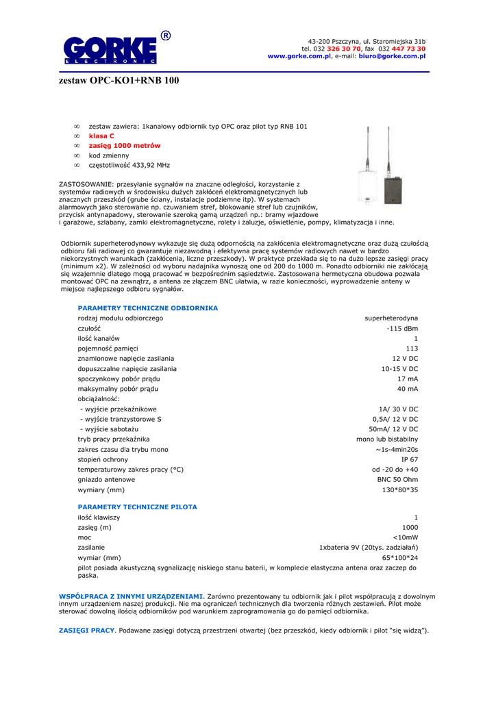 zestaw OPC-KO1+RNB 100 • • • • • zestaw zawiera: 1kanałowy odbiornik typ OPC oraz pilot typ RNB 101 klasa C zasięg 1000 metrów kod zmienny częstotliwość 433,92 MHz ZASTOSOWANIE: przesyłanie sygnałów na znaczne odległości, korzystanie z systemów radiowych w środowisku dużych zakłóceń elektromagnetycznych lub znacznych przeszkód (grube ściany, instalacje podziemne itp). W systemach alarmowych jako sterowanie np. czuwaniem stref, blokowanie stref lub czujników, przycisk antynapadowy, sterowanie szeroką gamą urządzeń np.: bramy wjazdowe i garażowe, szlabany, zamki elektromagnetyczne, rolety i żaluzje, oświetlenie, pompy, klimatyzacja i inne. Odbiornik superheterodynowy wykazuje się dużą odpornością na zakłócenia elektromagnetyczne oraz dużą czułością odbioru fali radiowej co gwarantuje niezawodną i efektywna pracę systemów radiowych nawet w bardzo niekorzystnych warunkach (zakłócenia, liczne przeszkody). W praktyce przekłada się to na dużo lepsze zasięgi pracy (minimum x2). W zależności od wyboru nadajnika wynoszą one od 200 do 1000 m. Ponadto odbiorniki nie zakłócają się wzajemnie dlatego mogą pracować w bezpośrednim sąsiedztwie. Zastosowana hermetyczna obudowa pozwala montować OPC na zewnątrz, a antena ze złączem BNC ułatwia, w razie konieczności, wyprowadzenie anteny w miejsce najlepszego odbioru sygnałów. PARAMETRY TECHNICZNE ODBIORNIKA rodzaj modułu odbiorczego czułość ilość kanałów pojemność pamięci znamionowe napięcie zasilania dopuszczalne napięcie zasilania superheterodyna -115 dBm 1 113 12 V DC 10-15 V DC spoczynkowy pobór prądu 17 mA maksymalny pobór prądu 40 mA obciążalność: - wyjście przekaźnikowe - wyjście tranzystorowe S - wyjście sabotażu tryb pracy przekaźnika zakres czasu dla trybu mono stopień ochrony temperaturowy zakres pracy (°C) gniazdo antenowe wymiary (mm) . 1A/ 30 V DC 0,5A/ 12 V DC 50mA/ 12 V DC mono lub bistabilny ~1s-4min20s IP 67 od -20 do +40 BNC 50 Ohm 130*80*35 PARAMETRY TECHNICZNE PILOTA ilość klawiszy zasięg (m) moc zasilanie wymiar (mm) 1 1000 <10mW 1xbateria 9V (20tys. zadziałań) 65*100*24 pilot posiada akustyczną sygnalizację niskiego stanu baterii, w komplecie elastyczna antena oraz zaczep do paska. WSPÓŁPRACA Z INNYMI URZĄDZENIAMI. Zarówno prezentowany tu odbiornik jak i pilot współpracują z dowolnym innym urządzeniem naszej produkcji. Nie ma ograniczeń technicznych dla tworzenia różnych zestawień. Pilot może sterować dowolną ilością odbiorników pod warunkiem zaprogramowania go do pamięci odbiornika. ZASIĘGI PRACY. Podawane zasięgi dotyczą przestrzeni otwartej (bez przeszkód, kiedy odbiornik i pilot “się widzą”). Jeżeli pomiędzy odbiornikiem a nadajnikiem znajdują się przeszkody, należy przewidzieć zmniejszenie zasięgu pracy odpowiednio dla: drewna i gipsu o 5-20% * cegły o 20-40 % * betonu zbrojonego o 40 - 80%. Przy dużej ilości przeszkód zalecamy konfigurowanie zestawów na bazie odbiorników klasy SH, stosowanie retransmiterów lub pilotów dużej mocy. Przy przeszkodach metalowych stosowanie systemów radiowych nie jest zalecane. Należy rozważyć zainstalowanie modułu WLC201, który pozwala na ominięcie tego typu przeszkód. POJEMNOŚĆ PAMIĘCI ODBIORNIKA. Odbiornik OPC posiada pamięć dużą (113 nadajników). Należy pamiętać, że wykasowanie z pamięci nawet jednego pilota wiąże się z koniecznością ponownego zaprogramowania pilotów, które mają pozostać w systemie. Z tego względu dla systemów dużych (kilkadziesiąt, kilkaset pilotów) zalecamy stosowanie odbiorników identyfikacyjnych np. IDO 500, które posiadają możliwość indywidualnego kasowania nadajników z pamięci odbiornika. TRYBY PRACY. Tryb monostabilny czyli naciśnięcie klawisza pilota powoduje załączenie przekaźnika na ustawiony czas. Tryb bistabilny - każdorazowe naciśnięcie klawisza, powoduje zmianę stanu przekaźnika na przeciwny. KOD ZMIENNY. Transmisja pomiędzy nadajnikiem i odbiornikiem oparta jest na kodzie zmiennym (KEELOQ® firmy Microchip Technology Inc.), który zapewnia wysokie bezpieczeństwo użytkowania oraz odporność na sygnały radiowe pochodzące z innych urządzeń. Każdy nadajnik posiada swój indywidualny kod. Odbiornik reaguje tylko na te transmisje, które pochodzą z nadajników zaprogramowanych do jego pamięci. CZĘSTOTLIWOŚĆ 433,92 MHz. Pasmo nie wymagające specjalnych zezwoleń i koncesji na użytkowanie. Montaż urządzeń nie wymaga zgłaszania do URTIP.