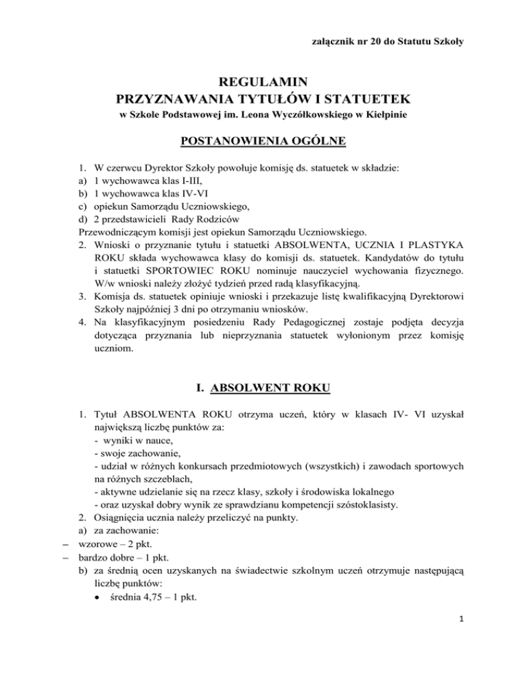 załącznik nr 20 do Statutu Szkoły REGULAMIN PRZYZNAWANIA TYTUŁÓW I STATUETEK w Szkole Podstawowej im. Leona Wyczółkowskiego w Kiełpinie POSTANOWIENIA OGÓLNE 1. W czerwcu Dyrektor Szkoły powołuje komisję ds. statuetek w składzie: a) 1 wychowawca klas I-III, b) 1 wychowawca klas IV-VI c) opiekun Samorządu Uczniowskiego, d) 2 przedstawicieli Rady Rodziców Przewodniczącym komisji jest opiekun Samorządu Uczniowskiego. 2. Wnioski o przyznanie tytułu i statuetki ABSOLWENTA, UCZNIA I PLASTYKA ROKU składa wychowawca klasy do komisji ds. statuetek. Kandydatów do tytułu i statuetki SPORTOWIEC ROKU nominuje nauczyciel wychowania fizycznego. W/w wnioski należy złożyć tydzień przed radą klasyfikacyjną. 3. Komisja ds. statuetek opiniuje wnioski i przekazuje listę kwalifikacyjną Dyrektorowi Szkoły najpóźniej 3 dni po otrzymaniu wniosków. 4. Na klasyfikacyjnym posiedzeniu Rady Pedagogicznej zostaje podjęta decyzja dotycząca przyznania lub nieprzyznania statuetek wyłonionym przez komisję uczniom. I. ABSOLWENT ROKU 1. Tytuł ABSOLWENTA ROKU otrzyma uczeń, który w klasach IV- VI uzyskał największą liczbę punktów za: - wyniki w nauce, - swoje zachowanie, - udział w różnych konkursach przedmiotowych (wszystkich) i zawodach sportowych na różnych szczeblach, - aktywne udzielanie się na rzecz klasy, szkoły i środowiska lokalnego - oraz uzyskał dobry wynik ze sprawdzianu kompetencji szóstoklasisty. 2. Osiągnięcia ucznia należy przeliczyć na punkty. a) za zachowanie: wzorowe – 2 pkt. bardzo dobre – 1 pkt. b) za średnią ocen uzyskanych na świadectwie szkolnym uczeń otrzymuje następującą liczbę punktów: średnia 4,75 – 1 pkt. 1 4,9 – 2 pkt. 5,0 – 3 pkt. 5,1 – 4 pkt. 5,2 – 5 pkt. 5,3 – 6 pkt. 5,4 – 7 pkt. 5,5 – 8 pkt. 5,6 – 9 pkt. 5,7 – 10 pkt. (…….) c) za zdobycie wyróżnienia lub nagrody/miejsca w konkursie: etap szkolny – 1 pkt. etap gminny – 2 pkt. powiatowy – 3 pkt. wojewódzki – 4 pkt. ogólnopolski – 5 pkt. międzynarodowy – 6 pkt. Jeżeli dany konkurs lub zawody składały się z kilku etapów, to punkty należy przyznać tylko za ten najwyższy, w którym uczeń osiągnął wysoki wynik (indywidualny lub zespołowy). d) Osiągnięcie przez ucznia wyniku bardzo dobrego lub laureata w Międzynarodowym Konkursie Matematycznym „Kangur” oznacza przyznanie - 6 pkt., a wyróżnienia– 5 pkt., e) punkty za pozostałą działalność: pracę w samorządzie szkolnym - 2 pkt., działalność w samorządzie klasowym – 1pkt., aktywny udział ucznia w życiu szkoły – 1 pkt., aktywny udział ucznia w życiu klasy - 1 pkt., aktywny udział ucznia w życiu środowiska lokalnego – 1 pkt. f) wynik uzyskany na sprawdzianie szóstoklasisty (średnia z obu części) przelicza się w następujący sposób: 0-74% – 0 pkt. 75-77% – 1 pkt. 78-80% – 2 pkt. 81-83% – 3 pkt. 84-85% – 4 pkt. 86-88% – 5 pkt. 89-90% – 6 pkt. 91-93% – 7 pkt. 94-95% – 8 pkt. 96-98% – 9 pkt. 99%-100% – 10 pkt. 3. Uczeń z najwyższą liczbą punktów, pozytywnie zaopiniowany przez komisję ds. statuetek, otrzymuje tytuł oraz statuetkę ABSOLWENT ROKU, która zostanie mu wręczona na uroczystości zakończenia danego roku szkolnego przez Dyrektora Szkoły Podstawowej w Kiełpinie. 2 Osiągnięcia kandydata do tytułu „ABSOLWENT ROKU” Imię i nazwisko ucznia: ………………………………………………… klasa: VI Lp. 1 2 3 4 5 Kryteria Klasa IV Klasa V Klasa VI Suma punktów Zachowanie Średnia ocen na świadectwie Udział w konkursach: - międzynarodowe - ogólnopolskie - wojewódzkie - powiatowe - gminne - szkolne Sprawdzian szóstoklasisty Praca na rzecz klasy, szkoły i środowiska RAZEM II. UCZEŃ ROKU 1. Tytuł UCZEŃ ROKU otrzyma uczeń z klas IV-VI, który w danym roku szkolnym uzyskał największą liczbę punktów za: wyniki w nauce (minimum 4,5 średnia ocen), zachowanie (co najmniej bardzo dobre), reprezentowanie szkoły w konkursach przedmiotowych na różnych szczeblach (z wyłączeniem konkursów plastycznych i sportowych!). W razie wątpliwości dotyczących konkursów mieszanych (np. przyrodniczo-plastycznych) decyzję podejmuje szkolny koordynator danego konkursu. udzielanie się na rzecz klasy, szkoły i środowiska lokalnego. 2. Osiągnięcia ucznia należy przeliczyć na punkty. a) za zachowanie: wzorowe – 2 pkt. bardzo dobre – 1 pkt. b) za średnią ocen uzyskanych na świadectwie szkolnym uczeń otrzymuje następującą liczbę punktów: średnia 4,5 – 1 pkt. 4,6 – 2 pkt. 4,7 – 3 pkt. 4,8 – 4 pkt. 4,9 – 5 pkt. 3 5,0 – 6 pkt. 5,1 – 7 pkt. 5,2 – 8 pkt. 5,3 – 9 pkt. 5,4 – 10 pkt. (…….) c) za zdobycie wyróżnienia lub nagrody/miejsca w konkursie: etap szkolny – 1 pkt. etap gminny – 2 pkt. powiatowy – 3 pkt. wojewódzki – 4 pkt. ogólnopolski – 5 pkt. międzynarodowy – 6 pkt. Jeżeli dany konkurs lub zawody składały się z kilku etapów, to punkty należy przyznać tylko za ten najwyższy, w którym uczeń osiągnął wysoki wynik (indywidualny lub zespołowy). d) Osiągnięcie przez ucznia wyniku bardzo dobrego lub laureata w Międzynarodowym Konkursie Matematycznym „Kangur” oznacza przyznanie - 6 pkt., a wyróżnienia– 5 pkt., e) punkty za pozostałą działalność: pracę w samorządzie szkolnym - 2 pkt., działalność w samorządzie klasowym – 1pkt., aktywny udział ucznia w życiu szkoły – 1 pkt., aktywny udział ucznia w życiu klasy - 1 pkt., aktywny udział ucznia w życiu środowiska lokalnego – 1 pkt. 3. Uczeń z najwyższą liczbą punktów, pozytywnie zaopiniowany przez komisję ds. statuetek, otrzymuje tytuł oraz statuetkę UCZEŃ ROKU, która zostanie mu wręczona na uroczystości zakończenia danego roku szkolnego przez Dyrektora Szkoły Podstawowej w Kiełpinie. Osiągnięcia kandydata do tytułu „UCZEŃ ROKU” Imię i nazwisko: …………………………………………………. Klasa: ……… Lp. Kr
