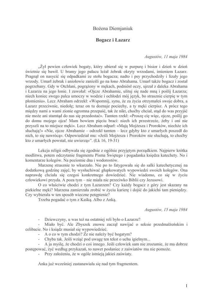 Bożena Diemjaniuk Bogacz i Łazarz Augustów, 11 maja 1984 „Żył pewien człowiek bogaty, który ubierał się w purpurę i bisior i dzień w dzień świetnie się bawił. U bramy jego pałacu leżał żebrak okryty wrzodami, imieniem Łazarz. Pragnął on nasycić się odpadkami ze stołu bogacza; nadto i psy przychodziły i lizały jego wrzody. Umarł żebrak i aniołowie zanieśli go na łono Abrahama. Umarł także bogacz i został pogrzebany. Gdy w Otchłani, pogrążony w mękach, podniósł oczy, ujrzał z daleka Abrahama i Łazarza na jego łonie. I zawołał: «Ojcze Abrahamie, ulituj się nade mną i poślij Łazarza; niech koniec swego palca umoczy w wodzie i ochłodzi mój język, bo strasznie cierpię w tym płomieniu». Lecz Abraham odrzekł: «Wspomnij, synu, że za życia otrzymałeś swoje dobra, a Łazarz przeciwnie, niedolę; teraz on tu doznaje pociechy, a ty męki cierpisz. A prócz tego między nami a wami zionie ogromna przepaść, tak że nikt, choćby chciał, stąd do was przyjść nie może ani stamtąd do nas się przedostać». Tamten rzekł: «Proszę cię więc, ojcze, poślij go do domu mojego ojca! Mam bowiem pięciu braci: niech ich przestrzeże, żeby i oni nie przyszli na to miejsce męki». Lecz Abraham odparł: «Mają Mojżesza i Proroków, niechże ich słuchają!» «Nie, ojcze Abrahamie – odrzekł tamten – lecz gdyby kto z umarłych poszedł do nich, to się nawrócą». Odpowiedział mu: «Jeśli Mojżesza i Proroków nie słuchają, to choćby kto z umarłych powstał, nie uwierzą»”. (Łk 16, 19-31) Lekcja religii odbywała się zgodnie z ogólnie przyjętym porządkiem. Najpierw krótka modlitwa, potem odczytanie fragmentu Pisma Świętego i pogadanka księdza katechety. No i komentarze kolegów. Na poziomie dna i wodorostów. Marzenę strasznie to wkurzało. Nie po to fatygowała się do salki katechetycznej na dodatkową godzinę zajęć, by wysłuchiwać głupkowatych wypowiedzi swoich kolegów. Ona naprawdę chciała się czegoś konkretnego dowiedzieć. Nie wiadomo, co się w życiu człowiekowi przyda. A poza tym – nie miała nic przeciwko Biblii czy Jezusowi. O co właściwie chodzi z tym Łazarzem? Czy każdy bogacz z góry jest skazany na piekielne męki? Marzena zamierzała zrobić w życiu karierę i dojść do jakichś tam pieniędzy. Czy wybierała w ten sposób wieczne potępienie? Trzeba pogadać o tym z Kaśką. Albo z Anką. Augustów, 15 maja 1984 - Dziewczyny, u was też na ostatniej reli było o Łazarzu? - Miało być. Ale Zbyszek znowu zaczął nawijać o seksie przedmałżeńskim i celibacie. No i ksiądz musiał się wypowiedzieć. - A o co w tym chodzi? Że nie należy być bogatym? - Chyba tak. Jeśli wziąć pod uwagę ten tekst o uchu igielnym... - A ja myślę, że chodzi o coś innego. Jeśli człowiek sam nie zrozumie, że ma dobrze postępować, żyć według przykazań, to nawet posłaniec z zaświatów mu nie pomoże. - Przy założeniu, że w ogóle istnieją jakieś zaświaty. Anka już wcześniej zastanawiała się nad tym fragmentem. 1 Niedawno usłyszała rozmowę swego brata z mamą. Oboje byli ciężko chorzy. Mama wstawała tylko do łazienki, a Sylwek coraz częściej trafiał do szpitala. Rokowania nie były najlepsze. Chyba wtedy myśleli, że zdrzemnęła się w swoim pokoju. Albo zapomnieli o jej istnieniu. Rozmawiali dość głośno. Obiecywali sobie, że kto pierwszy umrze, skontaktuje się z tym drugim, żyjącym. I będzie się starał przygotować drogę na tamten świat. Oni mówili całkiem serio. Anka była przerażona. Kaśka niezbyt chętnie przyszła na to dzisiejsze spotkanie. Umówiła się z Markiem. A tu Marzena dorwała ją na długiej przerwie i mówi, że ma coś ważnego. Jeśli jej chodziło tylko o tego Łazarza, to porządnie przesadziła. Na szczęście, Łazarz był tylko pretekstem. Anka, jak zwykle, szybko musiała iść do domu. Mogły więc spokojnie obgadać jej osiemnastkę. Augustów, 17 lutego 1985 - Anka, po co ty zasuszyłaś te róże. Nie wiesz, że to przynosi nieszczęście. Wrzos! Czyś ty zgłupiała?! - Przestań, Marzena. W ciągu pół roku pochowałam mamę i brata. A ty mi z takimi pierdołami wyjeżdżasz! Co gorszego może mnie jeszcze spotkać? - Anka, to prawda, że wtedy mama do ciebie przyszła? - No przecież ci mówiłam. Siedziałam w wannie. I nagle odwróciłam się, bo poczułam, że mama stoi za mną. Nie widziałam jej. Ale wiem, że to była ona. Tej nocy nie rzucałam się, nie budziłam bez przerwy, spokojnie spałam. Rano wstałam i zaczęłam prasować ubranie do trumny. Obiecałam, że pochowam mamę w tej bordowej sukience, którą zresztą sama sobie uszyła. Augustów, 19 maja 1985 - Cześć, Marzena! - Dzięki, że przyszłyście. Siadajcie. - Miałaś nam o czymś powiedzieć. - W zasadzie... Chciałam się z wami pożegnać przed egzaminami. - Coś ty. Egzaminy dopiero za miesiąc. Zresztą nie jedziesz na koniec świata! - Wiecie co, chodźmy nad Sajno. Anka wyraźnie się ożywiła. Kaśce było wszystko jedno. Marzena zaś czuła się idiotycznie. Nie chciała oszukiwać przyjaciółek, ale jak ona ma im powiedzieć o swojej decyzji. Że co? Że zmieniła światopogląd o sto osiemdziesiąt stopni? Teraz tego nie zrozumieją. W milczeniu pokonały całą trasę. Gdy doszły nad Sajno, Anka nieoczekiwanie wyciągnęła trzy świeczki, wetknęła je w piasek tuż przy brzegu i powoli zapalała. Przepływający turyści z wrażenia omal nie wywrócili się razem z kajakiem. - Za naszą przyjaźń, oby trwała wiecznie! - Anka, co ty? - Cicho! Zaśpiewaj lepiej jakąś pobożną piosenkę. Kaśka zaśpiewała. Anka z przejęciem prowadziła dalej swoją ceremonię. - A teraz obiecajmy coś sobie. Obiecajmy, że równo za dwadzieścia dwa lata, niezależnie od tego, co w życiu będziemy robić, spotkamy się właśnie w tym miejscu. Zgoda? - Zgoda. - Zgoda. 2 - Jakoś nie słyszę w waszych głosach entuzjazmu. Chc
