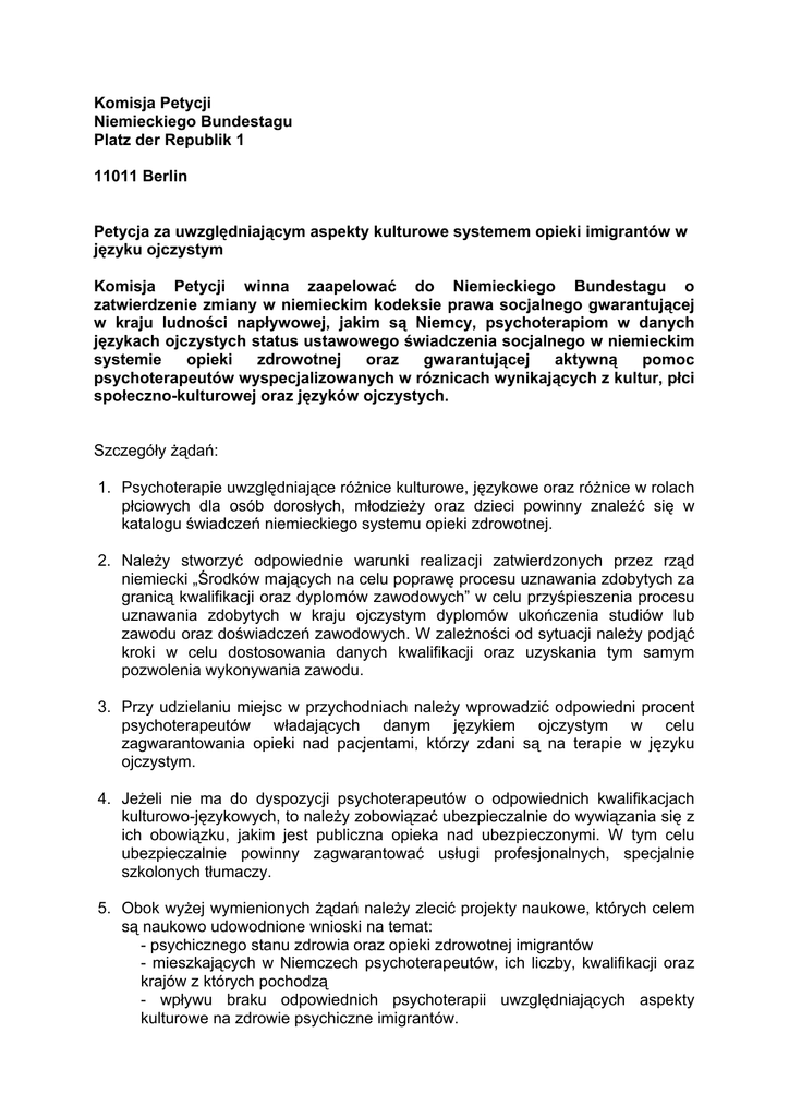 Komisja Petycji Niemieckiego Bundestagu Platz der Republik 1 11011 Berlin Petycja za uwzględniającym aspekty kulturowe systemem opieki imigrantów w języku ojczystym Komisja Petycji winna zaapelować do Niemieckiego Bundestagu o zatwierdzenie zmiany w niemieckim kodeksie prawa socjalnego gwarantującej w kraju ludności napływowej, jakim są Niemcy, psychoterapiom w danych językach ojczystych status ustawowego świadczenia socjalnego w niemieckim systemie opieki zdrowotnej oraz gwarantującej aktywną pomoc psychoterapeutów wyspecjalizowanych w róznicach wynikających z kultur, płci społeczno-kulturowej oraz języków ojczystych. Szczegóły żądań: 1. Psychoterapie uwzględniające różnice kulturowe, językowe oraz różnice w rolach płciowych dla osób dorosłych, młodzieży oraz dzieci powinny znaleźć się w katalogu świadczeń niemieckiego systemu opieki zdrowotnej. 2. Należy stworzyć odpowiednie warunki realizacji zatwierdzonych przez rząd niemiecki „Środków mających na celu poprawę procesu uznawania zdobytych za granicą kwalifikacji oraz dyplomów zawodowych” w celu przyśpieszenia procesu uznawania zdobytych w kraju ojczystym dyplomów ukończenia studiów lub zawodu oraz doświadczeń zawodowych. W zależności od sytuacji należy podjąć kroki w celu dostosowania danych kwalifikacji oraz uzyskania tym samym pozwolenia wykonywania zawodu. 3. Przy udzielaniu miejsc w przychodniach należy wprowadzić odpowiedni procent psychoterapeutów władających danym językiem ojczystym w celu zagwarantowania opieki nad pacjentami, którzy zdani są na terapie w języku ojczystym. 4. Jeżeli nie ma do dyspozycji psychoterapeutów o odpowiednich kwalifikacjach kulturowo-językowych, to należy zobowiązać ubezpieczalnie do wywiązania się z ich obowiązku, jakim jest publiczna opieka nad ubezpieczonymi. W tym celu ubezpieczalnie powinny zagwarantować usługi profesjonalnych, specjalnie szkolonych tłumaczy. 5. Obok wyżej wymienionych żądań należy zlecić projekty naukowe, których celem są naukowo udowodnione wnioski na temat: - psychicznego stanu zdrowia oraz opieki zdrowotnej imigrantów - mieszkających w Niemczech psychoterapeutów, ich liczby, kwalifikacji oraz krajów z których pochodzą - wpływu braku odpowiednich psychoterapii uwzględniających aspekty kulturowe na zdrowie psychiczne imigrantów. Uzasadnienie Eksperci, psychoterapeuci w danych krajach związkowych, służby podstawowe publicznego systemu opieki zdrowotnej, różne stowarzyszenia specjalistów stwierdzają, że mieszkający w Niemczech imigranci i uchodźcy nie podlegają w dostatecznym stopniu odpowiedniej opiece zdrowotnej w postaci psychoterapii o wysokiej jakości. Opieka ta była jednym z żądań autorów zbioru tez (tzw. Sonneberger Leitlinien) z 2002 1 r. Sytuacja ta wpływa niekorzystnie w szczególności na znajdujące się w socjalnie i finansowo gorszej sytucaji dzieci oraz osoby dorosłe, które przybyły do Niemiec jako imigranci lub uchodźcy. Służba zdrowia nie dysponuje odpowiednimi, przeznaczonymi dla tej grupy psychoterapiami uzględniającymi apsekty kulturowe i płciowe. 2 Brak ten odczuwają w silnym stopniu również imigrantki, które doświadczyły przemocy. Psychoterapia w języku ojczystym prowadzona przez psychoterapeutki jest dla nich z reguły nieodzowna. Przeważnie pomoc oferowana w tej dziedzinie nie jest odpowiednia i wystarczająca. Ponadto brak jest „bezpiecznych” ofert psychoterapii również dla imigrantów, żyjących w Niemczech bez dokumentów lub starających się o azyl. Sprawozdanie Komisji Europejskiej z dnia 26.11.2007 r. potwierdza, że w kwestii tej sytuacja w Niemczech narusza prawo UE! Prawo UE zobowiązuje kraje przyjmujące imigrantów, a więc również Niemcy, do terapii oraz opieki 3 nad osobami, które w szczególnej mierze potrzebują pomocy 4 / 5 . Zgodnie z prawem UE do grona tych osób należą osoby, które „...doświadczyły tortur, gwałtu lub innych ciężkich form przemocy psychicznej, fizycznej lub seksualnej”. 6 / 3 Ze względu na niewystarczającą ofertę pomocy liczyć się trzeba z długim okresem oczekiwania na pomoc, a często nawet z odmowami. (Pracownicy instytucji tureckojęzycznych w Berlinie informują, że okres oczekiwania na pomoc wynosi z reguły dwa lata.) Nieodpowiednia opieka psychoterapeutyczna może prowadzić do przewlekłości, która obciążać może nie tylko pacjenta, ale i całą rodzinę, w szczególności dzieci oraz do powstawania niekoniecznych kosztów dla niemieckiej służby zdrowia. Oferta pomocy w Niemczech jest więc niewystarczalna. Sytuacji tej należy jednakże przeciwstawić fakt, iż Niemcy dysponują psychoterapeutami z najróżniejszych krajów, którzy byliby w stanie przeprowadzać profesjonalne terapie uwzględniające aspekty kulturowe, płciowe oraz językowe. Jak dotąd z najróżniejszych powodów (np. trudności z powodu nieczłonkostwa danego kraju ojczystego w UE) sporej części 1 Machleidt, W., Die 12 Sonnenberger Leitlinien zur psychiatrisch-psychotherapeutischen Versorgung von MigrantInnen in Deutschland. Der Nervenarzt 2002, 73: 1208-1209 und http://www.migration-boell.de/web/integration/47_2105.asp 2 patrz: Berliner Erklärung: Zur Notlage bei der psychologischen und psychotherapeutischen Versorgung von Menschen mit Migrations- und Fluchthintergrund, http://www.berlin.de/imperia/md/content/batempelhofschoeneberg/abtgesstadtqm/ges/planleit/berliner_erklaerung _migration_pdf.pdf 3 EU Richtlinie zur „Festlegung von Mindestnormen für die Aufnahme von Flüchtlingen“ 2003/9/EG Art. 20 4 2003/9/EG vom 27.10.2003, Amtsblatt der Europäischen Kommission 2003 L 31 5 2004/83/EG vom 29.04.2004, Amtsblatt der Europäischen Kommission 2004 L 304 6 Thüringer Erklärung: Sicherung der Rehabilitation von besonders schutzbedürftigen Flüchtlingen. Baff, IPPNW, Bundesärztekammer, DTPPP, DeGPT, Diakonie, Pro Asyl etc. http://www.baff-zentren.org/index.ph