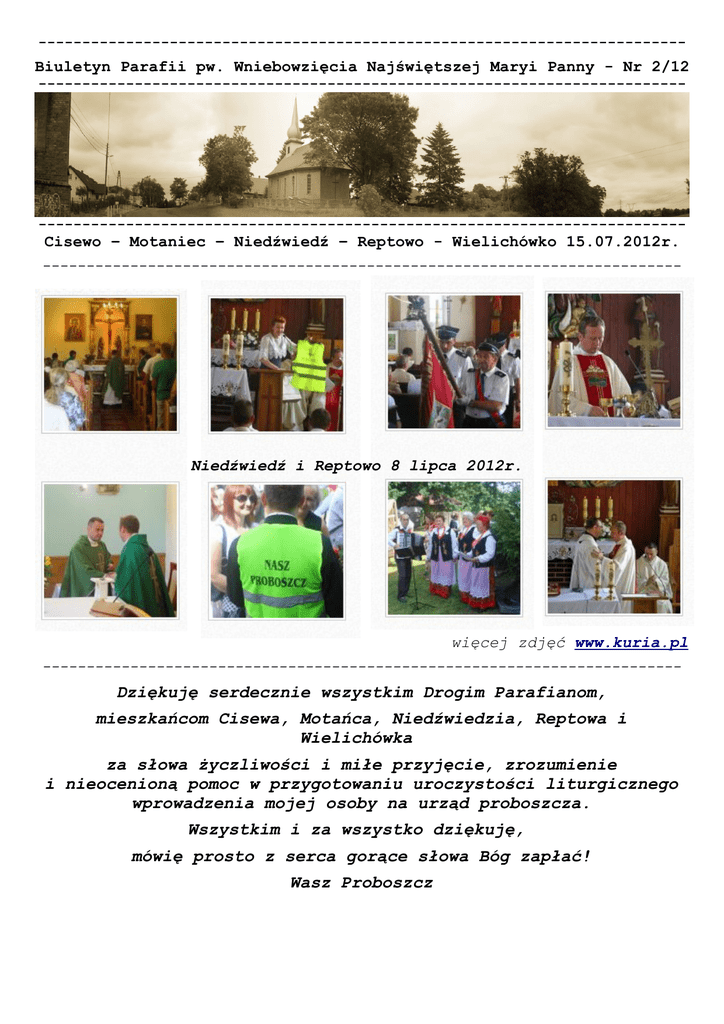 -------------------------------------------------------------------------- Biuletyn Parafii pw. Wniebowzięcia Najświętszej Maryi Panny - Nr 2/12 -------------------------------------------------------------------------- -------------------------------------------------------------------------- Cisewo – Motaniec – Niedźwiedź – Reptowo - Wielichówko 15.07.2012r. -------------------------------------------------------------------------------------------------------------------------------------------------- Niedźwiedź i Reptowo 8 lipca 2012r. więcej zdjęć www.kuria.pl ------------------------------------------------------------------------- Dziękuję serdecznie wszystkim Drogim Parafianom, mieszkańcom Cisewa, Motańca, Niedźwiedzia, Reptowa i Wielichówka za słowa życzliwości i miłe przyjęcie, zrozumienie i nieocenioną pomoc w przygotowaniu uroczystości liturgicznego wprowadzenia mojej osoby na urząd proboszcza. Wszystkim i za wszystko dziękuję, mówię prosto z serca gorące słowa Bóg zapłać! Wasz Proboszcz XV niedziela zwykła PIERWSZE CZYTANIE [Am 7,12-15] Amazjasz, kapłan w Betel, rzekł do Amosa: Widzący, idź, uciekaj sobie do ziemi Judy! I tam jedz chleb, i tam prorokuj! A w Betel więcej nie prorokuj, bo jest ono królewską świątynią i królewską budowlą. I odpowiedział Amos Amazjaszowi: Nie jestem ja prorokiem ani nie jestem uczniem proroków, gdyż jestem pasterzem i tym, który nacina sykomory. Od trzody bowiem wziął mnie Pan i rzekł do mnie Pan: Idź, prorokuj do narodu mego, izraelskiego! PSALM RESPONSORYJNY [Ps 85,9-14] REFREN: Okaż swą łaskę i daj nam zbawienie Będę słuchał tego, co mówi Pan Bóg: oto ogłasza pokój ludowi i świętym swoim. Zaprawdę bliskie jest Jego zbawienie dla tych, którzy się Go Boją, i chwała zamieszka w naszej ziemi. Spotkają się ze sobą łaska i wierność, ucałują się sprawiedliwość i pokój. Wierność z ziemi wyrośnie, a sprawiedliwość spojrzy z nieba. Pan sam obdarzy szczęściem, a nasza ziemia wyda swój owoc. Przed Nim będzie kroczyć sprawiedliwość, a śladami Jego kroków zbawienie. DRUGIE CZYTANIE [Ef 1,3-14] Niech będzie błogosławiony Bóg i Ojciec Pana naszego Jezusa Chrystusa; który napełnił nas wszelkim błogosławieństwem duchowym na wyżynach niebieskich - w Chrystusie. W Nim bowiem wybrał nas przez założeniem świata, abyśmy byli święci i nieskalani przed Jego obliczem. Z miłości przeznaczył nas dla siebie jako przybranych synów przez Jezusa Chrystusa, według postanowienia swej woli, ku chwale majestatu swej łaski, którą obdarzył nas w Umiłowanym. W Nim mamy odkupienie przez Jego krew - odpuszczenie występków, według bogactwa Jego łaski. Szczodrze ją na nas wylał w postaci wszelkiej mądrości i zrozumienia, przez to, że nam oznajmił tajemnicę swej woli według swego postanowienia, które przedtem w Nim powziął dla dokonania pełni czasów, aby wszystko na nowo zjednoczyć w Chrystusie jako Głowie: to, co w niebiosach, i to, co na ziemi. W Nim dostąpiliśmy udziału my również, z góry przeznaczeni zamiarem Tego, który dokonuje wszystkiego zgodnie z zamysłem swej woli po to, byśmy istnieli ku chwale Jego majestatu - my, którzyśmy już przedtem nadzieję złożyli w Chrystusie. W Nim także i wy usłyszeliście słowo prawdy, Dobrą Nowinę o waszym zbawieniu. W Nim również uwierzyliście i zostaliście opatrzeni pieczęcią Ducha Świętego, który był obiecany. On jest zadatkiem naszego dziedzictwa w oczekiwaniu na odkupienie, które nas uczyni własnością [Boga], ku chwale Jego majestatu. AKLAMACJA [Ef 1,17-18] Niech Ojciec naszego Pana Jezusa Chrystusa, przeniknie nasze serca swoim światłem, abyśmy wiedzieli, czym jest nadzieja naszego powołania. EWANGELIA [Mk 6,7-13] Jezus przywołał do siebie Dwunastu i zaczął rozsyłać ich po dwóch. Dał im też władzę nad duchami nieczystymi i przykazał im, żeby nic z sobą nie brali na drogę prócz laski: ani chleba, ani torby, ani pieniędzy w trzosie. Ale idźcie obuci w sandały i nie wdziewajcie dwóch sukien. I mówił do nich: Gdy do jakiego domu wejdziecie, zostańcie tam, aż stamtąd wyjdziecie. Jeśli w jakim miejscu was nie przyjmą i nie będą słuchać, wychodząc stamtąd strząśnijcie proch z nóg waszych na świadectwo dla nich. Oni więc wyszli i wzywali do nawrócenia. Wyrzucali też wiele złych duchów oraz wielu chorych namaszczali olejem i uzdrawiali. -------------------------------------------------------------------------Informacje Parafialne 1. Uprzejmie informuję, że nasza parafia otrzymała powiadomienie z Zachodniopomorskiego Urzędu Wojewódzkiego o uzyskaniu osobowości prawnej, uznanej przez Rzeczypospolitą Polską na podstawie art. 4 ust. 2 Konkordatu. - pismo znak SO-1.6140,52.2012.AK z dn. 10 lipca 2012r. Z chwilą otrzymania takiego powiadomienia, Parafia Rzymskokatolicka pw. Wniebowzięcia Najświętszej Maryi Panny w Reptowie stała się pełnoprawną jednostką terytorialną Kościoła Rzymskokatolickiego. 2. Dzisiaj o godzinie 13:00 Mszę Świętą będzie sprawował ks. Łukasz Mróz wikariusz z parafii pw. Św. Klary w Dobrej Nowogardzkiej, który podzieli się z nami osobistym świadectwem z Szczecińskiej Pieszej Pielgrzymki na Jasną Górę -------------------------------------------------------------------------Msze Święte w kościele parafialnym w Reptowie w kaplicy w Niedźwiedziu niedziela godz. 08:30 i 13:00 niedziela godz. 10:30 środa godz. 18:00 piątek godz. 19:00 piątek godz. 18:00 -------------------------------------------------------------------------Kontakt z księdzem proboszczem Pawłem Ostrowskim po Mszach Świętych lub po umówieniu telefonicznym – kom.: 507 025 850. -------------------------------------------------------------------------Intencje Mszalne 15 lipca 2012r - niedziela (R) 8:30 - + rodziców Dominikę i Stefana, teściów Rozalię i Tomasza, brata Stanisława (N) 10:30 – 
