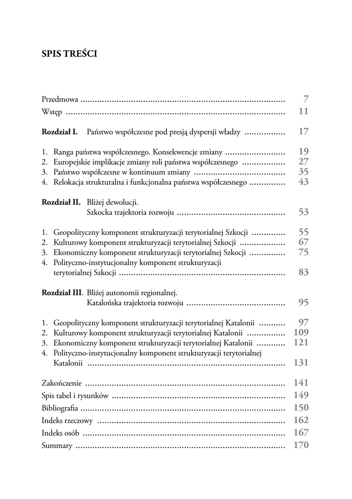 SPIS TREŚCI Przedmowa ...................................................................................... Wstęp ............................................................................................ 7 11 Rozdział I. Państwo współczesne pod presją dyspersji władzy .................. 17 Ranga państwa współczesnego. Konsekwencje zmiany .......................... Europejskie implikacje zmiany roli państwa współczesnego ................... Państwo współczesne w kontinuum zmiany ....................................... Relokacja strukturalna i funkcjonalna państwa współczesnego ................ 19 27 35 43 Rozdział II. Bliżej dewolucji. Szkocka trajektoria rozwoju .............................................. 53 1. 2. 3. 4. 1. 2. 3. 4. Geopolityczny komponent strukturyzacji terytorialnej Szkocji ............... Kulturowy komponent strukturyzacji terytorialnej Szkocji .................... Ekonomiczny komponent strukturyzacji terytorialnej Szkocji ................ Polityczno-instytucjonalny komponent strukturyzacji terytorialnej Szkocji ...................................................................... Rozdział III. Bliżej autonomii regionalnej. Katalońska trajektoria rozwoju .......................................... 55 67 75 83 95 Geopolityczny komponent strukturyzacji terytorialnej Katalonii ............ Kulturowy komponent strukturyzacji terytorialnej Katalonii ................. Ekonomiczny komponent strukturyzacji terytorialnej Katalonii ............. Polityczno-instytucjonalny komponent strukturyzacji terytorialnej Katalonii ................................................................................... 131 Zakończenie .................................................................................... Spis tabel i rysunków ......................................................................... Bibliografia ...................................................................................... Indeks rzeczowy ............................................................................... Indeks osób ..................................................................................... Summary ........................................................................................ 141 149 150 162 167 170 1. 2. 3. 4. 97 109 121 TABLE OF CONTENTS Preface ........................................................................................... Introduction .................................................................................... 7 11 Chapter I. Modern state under pressure to disperse power ...................... 17 Significance of the modern state. Consequences of the change ............... European implications for changing the role of the modern state ............ Modern state in the continuum of changes ........................................ Structural and functional relocation of the modern state ....................... 19 27 35 43 Chapter II. Closer to devolution. Scottish development trajectory .......................................... 53 1. 2. 3. 4. Geopolitical component of territorial structuring of Scotland ................ Cultural component of territorial structuring of Scotland ..................... Economic component of territorial structuring of Scotland ................... Political and institutional component of territorial structuring of Scotland ................................................................................. 83 Chapter III.Closer to regional autonomy. Catalan development trajectory .......................................... 95 1. 2. 3. 4. 55 67 75 Geopolitical component of territorial structuring of Catalonia ............... Cultural component of territorial structuring of Catalonia .................... Economic component of territorial structuring of Catalonia .................. Political and institutional component of territorial structuring of Catalonia ................................................................................ 131 Conclusion ...................................................................................... List of tables and figures ..................................................................... Bibliography .................................................................................... Subject index ................................................................................... Name index ..................................................................................... Summary ........................................................................................ 141 149 150 162 167 170 1. 2. 3. 4. 97 109 121 PRZEDMOWA Przedmowa ta ma na celu ukazanie w szkicowym ujęciu problematyki podjętej przez autora, motywacji i pobudek, którymi się kierował, a także zaprezentowanie własnej perspektywy i interpretacji rzeczywistości w czasach dynamicznych przeobrażeń społeczno-politycznych. Od zarania państwa pojawia się i nie słabnie dyskusja nad jego istotą, funkcjami i rolą. Dodatkowo piętrzą się kontrowersje, gdy weźmie się pod uwagę nieuniknione, a często nieprzewidywalne okoliczności polityczno-społeczno-gospodarcze w postaci modernizacji, deregulacji, a nawet, jak twierdzi wielu teoretyków, schyłku czy destrukcji państwa. Aktualność poruszanej problematyki, szczególnie w dobie globalizacji, regionalizacji, a co się z tym wiąże postępującej decentralizacji, prowokuje do wnikliwych i pogłębionych studiów. Jednak nadzwyczaj szerokie spektrum poruszanej problematyki uniemożliwia potraktowanie z równą atencją wszystkich zagadnień. W związku z tym czytelnik z pewnością nie znajdzie odpowiedzi na wszystkie pytania, które mogą pojawić się w trakcie lektury, bowiem nie zostaną tu szczegółowo przedstawione chociażby historycznie warunkowane przeobrażenia instytucjonalne czy ustrojowe. Przesłanką, która decyduje o częściowym pominięciu tych kwestii, jest bogaty dorobek naukowy z obszaru wiedzy na temat