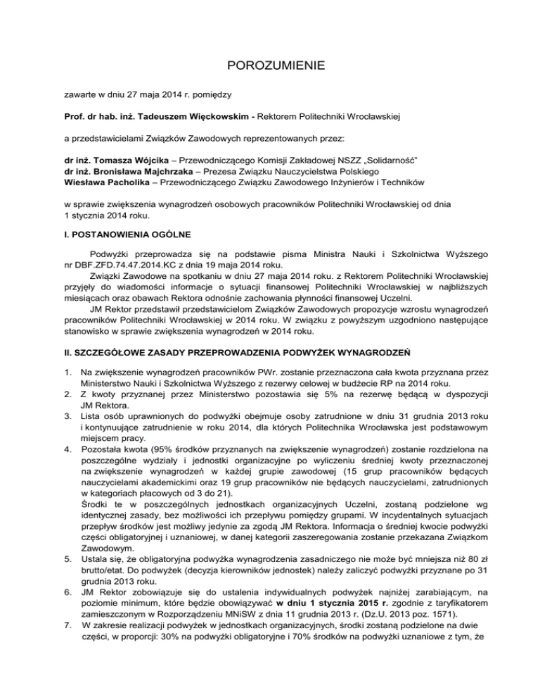 POROZUMIENIE zawarte w dniu 27 maja 2014 r. pomiędzy Prof. dr hab. inż. Tadeuszem Więckowskim - Rektorem Politechniki Wrocławskiej a przedstawicielami Związków Zawodowych reprezentowanych przez: dr inż. Tomasza Wójcika – Przewodniczącego Komisji Zakładowej NSZZ „Solidarność” dr inż. Bronisława Majchrzaka – Prezesa Związku Nauczycielstwa Polskiego Wiesława Pacholika – Przewodniczącego Związku Zawodowego Inżynierów i Techników w sprawie zwiększenia wynagrodzeń osobowych pracowników Politechniki Wrocławskiej od dnia 1 stycznia 2014 roku. I. POSTANOWIENIA OGÓLNE Podwyżki przeprowadza się na podstawie pisma Ministra Nauki i Szkolnictwa Wyższego nr DBF.ZFD.74.47.2014.KC z dnia 19 maja 2014 roku. Związki Zawodowe na spotkaniu w dniu 27 maja 2014 roku. z Rektorem Politechniki Wrocławskiej przyjęły do wiadomości informacje o sytuacji finansowej Politechniki Wrocławskiej w najbliższych miesiącach oraz obawach Rektora odnośnie zachowania płynności finansowej Uczelni. JM Rektor przedstawił przedstawicielom Związków Zawodowych propozycje wzrostu wynagrodzeń pracowników Politechniki Wrocławskiej w 2014 roku. W związku z powyższym uzgodniono następujące stanowisko w sprawie zwiększenia wynagrodzeń w 2014 roku. II. SZCZEGÓŁOWE ZASADY PRZEPROWADZENIA PODWYŻEK WYNAGRODZEŃ 1. Na zwiększenie wynagrodzeń pracowników PWr. zostanie przeznaczona cała kwota przyznana przez Ministerstwo Nauki i Szkolnictwa Wyższego z rezerwy celowej w budżecie RP na 2014 roku. 2. Z kwoty przyznanej przez Ministerstwo pozostawia się 5% na rezerwę będącą w dyspozycji JM Rektora. 3. Lista osób uprawnionych do podwyżki obejmuje osoby zatrudnione w dniu 31 grudnia 2013 roku i kontynuujące zatrudnienie w roku 2014, dla których Politechnika Wrocławska jest podstawowym miejscem pracy. 4. Pozostała kwota (95% środków przyznanych na zwiększenie wynagrodzeń) zostanie rozdzielona na poszczególne wydziały i jednostki organizacyjne po wyliczeniu średniej kwoty przeznaczonej na zwiększenie wynagrodzeń w każdej grupie zawodowej (15 grup pracowników będących nauczycielami akademickimi oraz 19 grup pracowników nie będących nauczycielami, zatrudnionych w kategoriach płacowych od 3 do 21). Środki te w poszczególnych jednostkach organizacyjnych Uczelni, zostaną podzielone wg identycznej zasady, bez możliwości ich przepływu pomiędzy grupami. W incydentalnych sytuacjach przepływ środków jest możliwy jedynie za zgodą JM Rektora. Informacja o średniej kwocie podwyżki części obligatoryjnej i uznaniowej, w danej kategorii zaszeregowania zostanie przekazana Związkom Zawodowym. 5. Ustala się, że obligatoryjna podwyżka wynagrodzenia zasadniczego nie może być mniejsza niż 80 zł brutto/etat. Do podwyżek (decyzja kierowników jednostek) należy zaliczyć podwyżki przyznane po 31 grudnia 2013 roku. 6. JM Rektor zobowiązuje się do ustalenia indywidualnych podwyżek najniżej zarabiającym, na poziomie minimum, które będzie obowiązywać w dniu 1 stycznia 2015 r. zgodnie z taryfikatorem zamieszczonym w Rozporządzeniu MNiSW z dnia 11 grudnia 2013 r. (Dz.U. 2013 poz. 1571). 7. W zakresie realizacji podwyżek w jednostkach organizacyjnych, środki zostaną podzielone na dwie części, w proporcji: 30% na podwyżki obligatoryjne i 70% środków na podwyżki uznaniowe z tym, że a) zwiększenie wynagrodzeń przyznane jest w 50% na czas obowiązywania umowy o pracę a w 50% na czas określony od 1 stycznia 2014 roku. do 31 grudnia 2014 roku. W przypadku zapewnienia środków w dotacji budżetowej w 2015 roku na skutki przechodzące podwyżek roku 2014, kwota podwyżki przyznanej na czas określony w 2014 roku zostanie przekwalifikowana na czas nieokreślony od 1 stycznia 2015 roku decyzją Dziekana w uzgodnieniu z JM Rektorem, w zależności od sytuacji finansowej poszczególnych wydziałów, b) przekwalifikowanie części kwoty podwyżki, w roku 2015 na czas nieokreślony, w pierwszej kolejności będzie dotyczyło jej części obligatoryjnej, c) w przypadku trudnej sytuacji budżetowej JM Rektor poczyni starania dla realizacji pkt. b). 8. Z podwyżek uznaniowych, z zasady powszechnych, będą wyłączone te osoby, których działalność, zaangażowanie i aktywność zawodowa zostaną ocenione jako nieodpowiadające wymaganiom związanym z zajmowanym stanowiskiem (wymagane uzasadnienie decyzji przez przełożonego). 9. Propozycje części uznaniowej podwyżek dla każdego pracownika przygotują bezpośredni przełożeni. Wymagają one potwierdzenia odpowiednio przez Prorektorów, Dziekanów, Kierowników Studiów, Dyrektora Centrum Wiedzy i Informacji Naukowo-Technicznej, Dyrektorów Zamiejscowych Ośrodków Dydaktycznych, Kanclerza, Zastępców Kanclerza i zatwierdzenia przez JM Rektora. Zbiorcze zestawienia w poszczególnych kategoriach zaszeregowania pracowników, którzy nie otrzymają podwyżki w części uznaniowej wraz z uzasadnieniem zostaną przekazane Związkom Zawodowym. 10. Na wniosek pracownika bezpośredni przełożony udziela informacji dotyczącej zasad przyznania części uznaniowej podwyżki. Pracownicy mający zastrzeżenia odnośnie oceny ich pracy będą mogli odwołać się do Dziekana, Kanclerza, Prorektora, a w szczególnych przypadkach do JM Rektora osobiście lub przez swojego przedstawiciela związkowego o weryfikację oceny. Wniosek powinien być rozpatrzony w terminie nie dłuższym niż 30 dni. III. POSTANOWIENIA KOŃCOWE Naliczone podwyżki z wyrównaniem od 1 stycznia 2014 roku zostaną wypłacone pracownikom bez zbędnej zwłoki. Porozumienie sporządza się w 4 egzemplarzach, jeden dla Władz Uczelni i po jednym dla Związków Zawodowych.