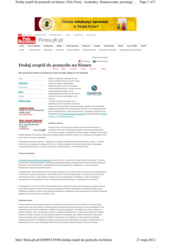 Dodaj zespół do pomysłu na biznes | Puls Firmy - kontrakty, finansowanie, przetargi, ... Page 1 of 3 DAJ CYNK NEWSLETTER PRENUMERATA SKLEP ARCHIWUM MÓJ PROFIL Firma.pb.pl pb.pl Puls Inwestora Notowania Firma FIRMA FINANSOWANIE KONTRAKTY EUROKASA Ludzie biznesu Weekend GAZELE BIZNESU Gazele PRAWO&PODATKI Konferencje PAŃSTWO W PAŃSTWIE Wideo Forum MSP GO4X ZARZĄDZANIE GRUPĄ SPÓŁEK Artykuł sponsorowany kup licencję drukuj z Kyocerą Dodaj zespół do pomysłu na biznes Wykop Blipnij Facebook Twitter LinkedIn EMAIL Sam pomysł na biznes nie wystarcza. Liczy się takŜe stojący za nim człowiek. Tagi Myśląc o rozpoczęciu własnego biznesu, przede wszystkim szukamy pomysłu. Dobry KONKURSY Notowania DUDA produkt lub usługa, odpowiadające zapotrzebowaniu na rynku to oczywiście zasada powstania biznesu. Jednak nawet dla osób inwestujących kapitał w nowe przedsięwzięcia biznesowe sam pomysł nie Ludzie wystarcza. Liczy się takŜe stojący za nim człowiek. Katarzyna Duda - Inwestorzy często powtarzają, Ŝe nie oddzielają pomysłu od zespołu. Inwestują w całość, przy czym zespół jest podstawą realizacji wszelkich nawet najbardziej Lokata do 16,5% Lokaty od 1 do 60 miesięcy Bez podatku belki! www.lokatybezbelki.pl wyjątkowych projektów. Nie poniosą ryzyka inwestycji w nawet najlepszy projekt, jeśli nie zaufają ludziom – mówi Katarzyna Duda - specjalista w Dziale Rozwoju Przedsiębiorczości Agencji Rozwoju Pomorza SA. oraz współorganizator II Edycji Konkursu od „Pomysłu do Biznesu”. Dieta + Dowóz Trójmiasto Zdrowy Posiłek do Domu lub Biura. Dieta Nie Musi Być UciąŜliwa! www.easydiet.pl Podstawy sukcesu Wartości firmy to nie tylko dobra materialne, takie jak nieruchomości czy urządzenia techniczne. W dzisiejszej gospodarce przewagę uzyskują jednak firmy, które rozumieją, Ŝe narzędziami sukcesu są takŜe: umiejętne wykorzystanie kapitału ludzkiego, komunikacja, odpowiednia strategia działań rynkowych, wartość marki, reputacja. Źle zarządzana firma nie ma szans na rynkowe zwycięstwo. Dostrzegają to inwestorzy prywatni – inwestujący w pomysły i przedsiębiorstwa we wczesnej fazie rozwoju. - Aniołowie biznesu biorą na wstępie pod uwagę produkt, rynek i moŜliwy potencjał zysku, jednak to jakość kadry zarządzającej warunkuje podjęcie decyzji o inwestycji i negocjowaniu udanej transakcji – mówi Katarzyna Duda. Przekonać inwestora II Edycja Konkursu „Od Pomysłu do Biznesu” ruszyła w kwietniu, a zakończy się Galą Finałową we wrześniu. To właśnie wtedy finaliści, młodzi przedsiębiorcy, będą mieli szansę bezpośredniego zaprezentowania swoich pomysłów inwestorom prywatnym, tzw. aniołom biznesu, przedstawicielom funduszy kapitałowych i zaląŜkowych, a takŜe Funduszowi Kapitałowemu Agencji Rozwoju Pomorza SA. Przedsiębiorstwo, którego działalność lub technologia uzaleŜniona jest od jednej osoby moŜe okazać się niepowodzeniem na skutek jej choroby lub niedyspozycji. Zespół daje pewność realizacji całego projektu, co obniŜa ryzyko inwestycyjne – mówi Katarzyna Duda – widać to takŜe w naszym konkursie. Początkujący przedsiębiorcy, często poprzestają na zaprezentowaniu innowacyjności pomysłu. Inwestorzy jednak kalkulują inaczej – szukają gwarancji w ludziach. W inwestycjach w nowe firmy nawet mniej nowatorski pomysł, moŜe mieć szansę, gdy prezentujący go ludzie okaŜą się grupą, która ma jasne określone cele biznesowe i potrafi grać w zespole. Potencjałem jest wiedza, kompetencje ale i umiejętność współpracy. Inwestor musi widzieć zaangaŜowanie przedsiębiorcy oraz jego gotowość do realizacji niełatwego zadania, jakim jest zmierzenie się z realiami rynku. Zbudować zespół Punktem wyjścia tworzenia zespołu powinno być określenie celów działania i planu ich realizacji. To pozwoli dobrać odpowiednią liczbę osób. KaŜdemu członkowi zespołu przypisuje się bardzo konkretną rolę i zakres obowiązków. Rolę określa się przez konkretne umiejętności i działania, które są jej przydzielone. W kaŜdej firmie, powinien znaleźć się dyrektor finansowy, który utrzyma ścisłą kontrolę na wydatkami przedsiębiorstwa, a takŜe zapewni okresowy dostęp do informacji. Ponadto w zespole nie moŜe zabraknąć dyrektora handlowego. Jego zadaniem jest bowiem zapewnienie wzrostu sprzedaŜy poprzez rozpoznanie klientów i rozpoczęcie z nimi współpracy, a takŜe opracowanie strategii zwiększenia zysków firmy. Efektywnie pracujący zespół powinien być zorientowany na rezultaty i zaangaŜowany w ich realizację. Dobrze więc, gdy zarządzający firmą wie na czym polega motywowanie grupy i dobra komunikacja. http://firma.pb.pl/2609055,89464,dodaj-zespol-do-pomyslu-na-biznes 21 maja 2012 Dodaj zespół do pomysłu na biznes | Puls Firmy - kontrakty, finansowanie, przetargi, ... Page 2 of 3 Skuteczność komunikacji Wymianę informacji, dzielenie się doświadczeniem i umiejętność określania wspólnych celów w kaŜdym przedsiębiorstwie, trudno uzyskać bez prawidłowej komunikacji. Efekty realizacji projektów biznesowych zaleŜą od jakości relacji między ludźmi. I to zarówno wewnątrz firmy, jak i w kontaktach z partnerami i klientami. Umiejętności te są niezmiernie istotne w przypadku młodych przedsiębiorców, którzy starają się zdobyć finansowanie własnej inwestycji z zewnątrz, np. od prywatnych przedsiębiorców dysponujących wolnym kapitałem. Współpraca z inwestorem nie opiera się tylko na mówieniu, ale przede wszystkim słuchaniu, szczególnie, Ŝe są to osoby bardziej doświadczone w biznesie. Młodzi przedsiębiorcy powinni liczyć się z sugestiami inwestora, za którego wiedzą stoją lata praktyki w zmaganiu się z realiami rynku. Omawiając projekty firmy zamiast walczyć o zachowanie własnych racji, warto otworzyć się na proponowane zmiany. Trudności z porozumieniem juŜ na etapie uzgadn