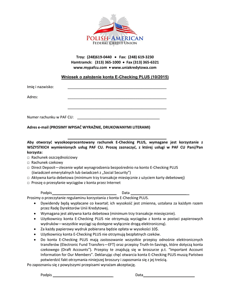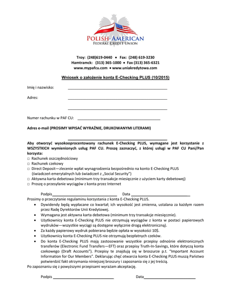 Troy: (248)619-0440 Fax: (248) 619-3230 Hamtramck: (313) 365-1000 Fax (313) 365-6321 www.mypafcu.com www.uniakredytowa.com Wniosek o założenie konta E-Checking PLUS (10/2015) Imię i nazwisko: ________________________________________________ Adres: ________________________________________________ ________________________________________________ Numer rachunku w PAF CU: ________________________________________ Adres e-mail (PROSIMY WPISAĆ WYRAŹNIE, DRUKOWANYMI LITERAMI) ________________________________________________ Aby otworzyd wysokooprocentowany rachunek E-Checking PLUS, wymagane jest korzystanie z WSZYSTKICH wymienionych usług PAF CU. Proszę zaznaczyd, z której usługi w PAF CU Pani/Pan korzysta: □ Rachunek oszczędnościowy □ Rachunek czekowy □ Direct Deposit—zlecenie wpłat wynagrodzenia bezpośrednio na konto E-Checking PLUS (świadczeo emerytalnych lub świadczeo z „Social Security”) □ Aktywna karta debetowa (minimum trzy transakcje miesięcznie z użyciem karty debetowej) □ Proszę o przesyłanie wyciągów z konta przez Internet Podpis _______________________________ Data ___________________________ Prosimy o przeczytanie regulaminu korzystania z konta E-Checking PLUS. Dywidendy będą wypłacane co kwartał; ich wysokośd jest zmienna, ustalana za każdym razem przez Radę Dyrektorów Unii Kredytowej. Wymagana jest aktywna karta debetowa (minimum trzy transakcje miesięcznie). Użytkownicy konta E-Checking PLUS nie otrzymują wyciągów z konta w postaci papierowych wydruków—wszystkie wyciągi są dostępne wyłącznie drogą elektroniczną). Za każdy papierowy wydruk pobierana będzie opłata w wysokości 10$. Użytkownicy konta E-Checking PLUS nie otrzymują bezpłatnych czeków. Do konta E-Checking PLUS mają zastosowanie wszystkie przepisy odnośnie elektronicznych transferów (Electronic Fund Transfers—EFT) oraz przepisy Truth-In-Savings, które dotyczą konta czekowego (Draft Accounts”). Przepisy te znajdują się w broszurze p.t. “Important Account Information for Our Members”. Deklarując chęd otwarcia konta E-Checking PLUS muszą Paostwo potwierdzid fakt otrzymania niniejszej broszury i zapoznania się z jej treścią. Po zapoznaniu się z powyższymi przepisami wyrażam akceptację. Podpis _____________________________ Data_________________________
