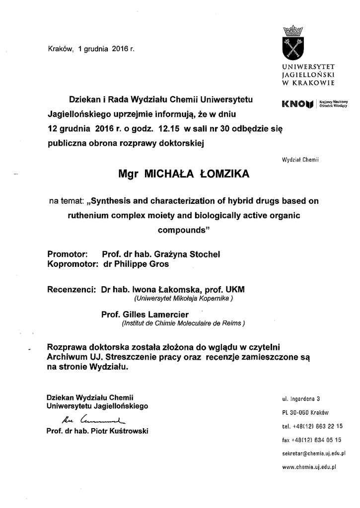 Kraków. 1 grudnia 2016 r. UNIWERSYTET JAGIELLOŃSKI W KRAKOWIE Dziekan i Rada Jagiellońskiego Wydziału uprzejmie Chemii Uniwersytetu informują, że 110l1li V IIIIIIII1' K N ..... I '''Jow, N,"kow, Ośrodek Wiodący w dniu 12 grudnia 2016 r. o godz. 12.15 w sali nr 30 odbędzie się publiczna obrona rozprawy doktorskiej Wydział Mgr Chemii MICHAŁA ŁOMZIKA na temat: "Synthesis and characterization of hybrid drugs based on ruthenium complex moiety and biologically active organie compounds" Promotor: Prof. dr hab. Grażyna Stochel Kopromotor: dr Philippe Gros Recenzenci: Dr hab. Iwona Łakomska, prof. UKM (Uniwersytet Mikołaja Kopernika) Prof. Gilles Lamercier (Jnstitut de Chirnie Moleculaire de Reims) Rozprawa doktorska została złożona do wglądu w czytelni Archiwum UJ. Streszczenie pracy oraz recenzje zamieszczone na stronie Wydziału. Dziekan Wydziału Chemii Uniwersytetu Jagiellońskiego są ul. Ingardena 3 Pl 30-060 Kraków Prof. dr hab. Piotr Kuśtrowski tel. +48(121 663 22 15 fax +48(121 634 05 15 [email protected] www.chemia.uj.edu.pl