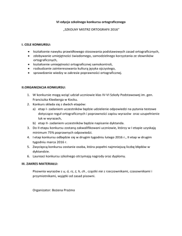 VI edycja szkolnego konkursu ortograficznego „SZKOLNY MISTRZ ORTOGRAFII 2016” I. CELE KONKURSU: kształcenie nawyku prawidłowego stosowania podstawowych zasad ortograficznych, zdobywanie umiejętności świadomego, samodzielnego korzystania ze słowników ortograficznych, kształcenie umiejętności ortograficznej samokontroli, rozbudzanie zainteresowania kulturą języka ojczystego, sprawdzenie wiedzy w zakresie poprawności ortograficznej. II.ORGANIZACJA KONKURSU: 1. W konkursie mogą wziąć udział uczniowie klas IV-VI Szkoły Podstawowej im. gen. Franciszka Kleeberga w Kocku. 2. Konkurs składa się z dwóch etapów: a) etap I- zadaniem uczestników będzie udzielenie odpowiedzi na pytania testowe dotyczące reguł ortograficznych i poprawności zapisu wyrazów oraz uzupełnienie luk w wyrazach, b) etap II- zadaniem uczestników będzie napisanie dyktanda. 3. Do II etapu konkursu zostaną zakwalifikowani uczniowie, którzy w I etapie uzyskają minimum 75% poprawnych odpowiedzi. 4. I etap konkursu odbędzie się w drugim tygodniu lutego 2016 r., II etap w drugim tygodniu marca 2016 r. 5. Zwycięzcą konkursu zostanie osoba, która popełni najmniejszą liczbę błędów w dyktandzie. 6. Laureaci konkursu szkolnego otrzymają nagrody oraz dyplomy. III. ZAKRES MATERIAŁU: Pisownia wyrazów z u, ó, rz, ż, h, ch , cząstki nie z rzeczownikami, czasownikami i przymiotnikami, wyjątki od zasad pisowni. Organizator: Bożena Prażmo