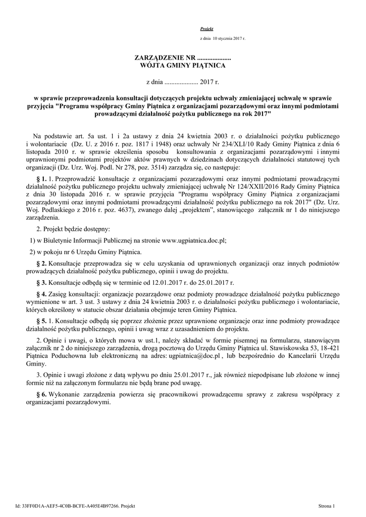 Projekt z dnia 10 stycznia 2017 r. ZARZĄDZENIE NR .................... WÓJTA GMINY PIĄTNICA z dnia .................... 2017 r. w sprawie przeprowadzenia konsultacji dotyczących projektu uchwały zmieniającej uchwałę w sprawie przyjęcia "Programu współpracy Gminy Piątnica z organizacjami pozarządowymi oraz innymi podmiotami prowadzącymi działalność pożytku publicznego na rok 2017" Na podstawie art. 5a ust. 1 i 2a ustawy z dnia 24 kwietnia 2003 r. o działalności pożytku publicznego i wolontariacie (Dz. U. z 2016 r. poz. 1817 i 1948) oraz uchwały Nr 234/XLI/10 Rady Gminy Piątnica z dnia 6 listopada 2010 r. w sprawie określenia sposobu konsultowania z organizacjami pozarządowymi i innymi uprawnionymi podmiotami projektów aktów prawnych w dziedzinach dotyczących działalności statutowej tych organizacji (Dz. Urz. Woj. Podl. Nr 278, poz. 3514) zarządza się, co następuje: § 1. 1. Przeprowadzić konsultacje z organizacjami pozarządowymi oraz innymi podmiotami prowadzącymi działalność pożytku publicznego projektu uchwały zmieniającej uchwałę Nr 124/XXII/2016 Rady Gminy Piątnica z dnia 30 listopada 2016 r. w sprawie przyjęcia "Programu współpracy Gminy Piątnica z organizacjami pozarządowymi oraz innymi podmiotami prowadzącymi działalność pożytku publicznego na rok 2017" (Dz. Urz. Woj. Podlaskiego z 2016 r. poz. 4637), zwanego dalej „projektem”, stanowiącego załącznik nr 1 do niniejszego zarządzenia. 2. Projekt będzie dostępny: 1) w Biuletynie Informacji Publicznej na stronie www.ugpiatnica.doc.pl; 2) w pokoju nr 6 Urzędu Gminy Piątnica. § 2. Konsultacje przeprowadza się w celu uzyskania od uprawnionych organizacji oraz innych podmiotów prowadzących działalność pożytku publicznego, opinii i uwag do projektu. § 3. Konsultacje odbędą się w terminie od 12.01.2017 r. do 25.01.2017 r. § 4. Zasięg konsultacji: organizacje pozarządowe oraz podmioty prowadzące działalność pożytku publicznego wymienione w art. 3 ust. 3 ustawy z dnia 24 kwietnia 2003 r. o działalności pożytku publicznego i wolontariacie, których określony w statucie obszar działania obejmuje teren Gminy Piątnica. § 5. 1. Konsultacje odbędą się poprzez złożenie przez uprawnione organizacje oraz inne podmioty prowadzące działalność pożytku publicznego, opinii i uwag wraz z uzasadnieniem do projektu. 2. Opinie i uwagi, o których mowa w ust.1, należy składać w formie pisemnej na formularzu, stanowiącym załącznik nr 2 do niniejszego zarządzenia, drogą pocztową do Urzędu Gminy Piątnica ul. Stawiskowska 53, 18-421 Piątnica Poduchowna lub elektroniczną na adres: [email protected] , lub bezpośrednio do Kancelarii Urzędu Gminy. 3. Opinie i uwagi złożone z datą wpływu po dniu 25.01.2017 r., jak również niepodpisane lub złożone w innej formie niż na załączonym formularzu nie będą brane pod uwagę. § 6. Wykonanie zarządzenia powierza się pracownikowi prowadzącemu sprawy z zakresu współpracy z organizacjami pozarządowymi. Id: 33FF0D1A-AEF5-4C0B-BCFE-A405E4B97266. Projekt Strona 1 § 7. Zarządzenie wchodzi w życie z dniem podpisania. Wójt Krzysztof Ryszard Kozicki Id: 33FF0D1A-AEF5-4C0B-BCFE-A405E4B97266. Projekt Strona 2 Projekt z dnia 10 stycznia 2017 r. UCHWAŁA NR .................... RADY GMINY PIĄTNICA Załącznik Nr 1 do Zarządzenia Nr .................... Wójta Gminy Piątnica z dnia 10 stycznia 2017 r. z dnia .................... 2017 r. zmieniająca uchwałę w sprawie przyjęcia „Programu współpracy Gminy Piątnica z organizacjami pozarządowymi oraz innymi podmiotami prowadzącymi działalność pożytku publicznego na rok 2017” Na podstawie art. 18 ust. 2 pkt 15 ustawy z dnia 8 marca 1990 roku o samorządzie gminnym (Dz. U. z 2016 r. poz. 446, 1579 i 1948) oraz art. 5a ust. 1 ustawy z dnia 24 kwietnia 2003 r. o działalności pożytku publicznego i o wolontariacie (Dz. U. z 2016 r. poz. 1817 i 1948) uchwala się, co następuje: § 1. W załączniku Nr 1 do uchwały Nr 124/XXII/ Rady Gminy Piątnica z dnia 30 listopada 2016 r. w sprawie przyjęcia „Programu współpracy Gminy Piątnica z organizacjami pozarządowymi oraz innymi podmiotami prowadzącymi działalność pożytku publicznego na rok 2017 ” (Dz. Urz. Woj. Podlaskiego z 2016 r. poz. 4637) uchyla się w § 14 ust. 3 i 6. § 2. Informacja o wynikach konsultacji projektu uchwały zmieniającej uchwałę w sprawie przyjęcia "Programu współpracy Gminy Piątnica z organizacjami pozarządowymi oraz innymi podmiotami prowadzącymi działalność pożytku publicznego na rok 2017", stanowi załącznik do uchwały. § 3. Wykonanie uchwały powierza się Wójtowi Gminy Piątnica. § 4. Uchwała wchodzi w życie po upływie 14 dni od dnia jej ogłoszenia w Dzienniku Urzędowym Województwa Podlaskiego. Przewodniczący Rady Krzysztof Weber Id: 33FF0D1A-AEF5-4C0B-BCFE-A405E4B97266. 942E689C-0057-45AB-BB0E-4AF07820596C. Projekt Projekt Strona 31 UZASADNIENIE Stosownie do treści art. 15 ust. 2b-2e ustawy z dnia 24 kwietnia 2003 r. o działalności pożytku publicznego i o wolontariacie (Dz. U. z 2016 r. poz. 1817 i 1948) ustawodawca określił skład komisji konkursowych. W związku z powyższym nie ma potrzeby ponownego regulowania (powtarzania) materii wcześniej już uregulowanych w aktach wyższych rangą. Id: 33FF0D1A-AEF5-4C0B-BCFE-A405E4B97266. 942E689C-0057-45AB-BB0E-4AF07820596C. Projekt Projekt Strona 41 Załącznik Nr 2 do Zarządzenia Nr .................... Wójta Gminy Piątnica z dnia 10 stycznia 2017 r. Formularz zgłaszania uwag i opinii do projektu uchwały zmieniającej uchwałę w sprawie przyjęcia „Programu współpracy Gminy Piątnica z organizacjami pozarządowymi oraz innymi podmiotami prowadzącymi działalność pożytku publicznego na rok 2017”. 1. Informacja o zgłaszającym: Imię i nazwisko osoby zgłaszającej/ status zgłaszającego w organizacji Adres do korespondencji / email Nazwa organizacji lub podmiotu