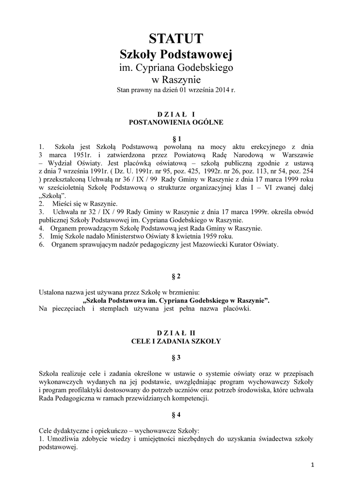 STATUT Szkoły Podstawowej im. Cypriana Godebskiego w Raszynie Stan prawny na dzień 01 września 2014 r. DZIAŁ I POSTANOWIENIA OGÓLNE §1 Szkoła jest Szkołą Podstawową powołaną na mocy aktu erekcyjnego z dnia 1. 3 marca 1951r. i zatwierdzona przez Powiatową Radę Narodową w Warszawie – Wydział Oświaty. Jest placówką oświatową – szkołą publiczną zgodnie z ustawą z dnia 7 września 1991r. ( Dz. U. 1991r. nr 95, poz. 425, 1992r. nr 26, poz. 113, nr 54, poz. 254 ) przekształconą Uchwałą nr 36 / IX / 99 Rady Gminy w Raszynie z dnia 17 marca 1999 roku w sześcioletnią Szkołę Podstawową o strukturze organizacyjnej klas I – VI zwanej dalej „Szkołą”. 2. Mieści się w Raszynie. 3. Uchwała nr 32 / IX / 99 Rady Gminy w Raszynie z dnia 17 marca 1999r. określa obwód publicznej Szkoły Podstawowej im. Cypriana Godebskiego w Raszynie. 4. Organem prowadzącym Szkołę Podstawową jest Rada Gminy w Raszynie. 5. Imię Szkole nadało Ministerstwo Oświaty 8 kwietnia 1959 roku. 6. Organem sprawującym nadzór pedagogiczny jest Mazowiecki Kurator Oświaty. §2 Ustalona nazwa jest używana przez Szkołę w brzmieniu: „Szkoła Podstawowa im. Cypriana Godebskiego w Raszynie”. Na pieczęciach i stemplach używana jest pełna nazwa placówki. D Z I A Ł II CELE I ZADANIA SZKOŁY §3 Szkoła realizuje cele i zadania określone w ustawie o systemie oświaty oraz w przepisach wykonawczych wydanych na jej podstawie, uwzględniając program wychowawczy Szkoły i program profilaktyki dostosowany do potrzeb uczniów oraz potrzeb środowiska, które uchwala Rada Pedagogiczna w ramach przewidzianych kompetencji. §4 Cele dydaktyczne i opiekuńczo – wychowawcze Szkoły: 1. Umożliwia zdobycie wiedzy i umiejętności niezbędnych do uzyskania świadectwa szkoły podstawowej. 1 2. Umożliwia absolwentom dokonanie świadomego wyboru dalszego kierunku kształcenia. 3. Kształtuje środowisko wychowawcze sprzyjające realizowaniu celów i zasad określonych w ustawie, stosownie do warunków Szkoły i wieku uczniów. 4. Sprawuje opiekę nad uczniami odpowiednio do ich potrzeb oraz możliwości Szkoły. 5. Dba o bezpieczeństwo uczniów oraz przestrzega zasad ochrony i promocji zdrowia. 6. Upowszechnia wiedzę ekologiczną wśród uczniów i kształtuje właściwe postawy wobec ochrony środowiska. §5 Zadania dydaktyczno – wychowawcze Szkoły: 1. Umożliwia uczniom podtrzymywanie poczucia tożsamości narodowej, religijnej i kulturowej. 2. Zapewnia uczniom pełny rozwój umysłowy, moralno – emocjonalny i fizyczny, zgodnie z ich potrzebami i możliwościami, szanując ich godność osobistą, wolność światopoglądową i wyznaniową zgodnie z zasadami zawartymi w : a) Konstytucji Rzeczpospolitej Polskiej; b) Deklaracji Praw Dziecka; c) Konwencji o Prawach Dziecka przyjętej przez Zgromadzenie Ogólne ONZ; d) zasadach nauk pedagogicznych; e) innych przepisach prawnych. 3. Kształtuje zasady tolerancji, uczy poszanowania inności drugiego człowieka, odrębności kultury i nacji. 4. Udziela uczniom pomocy psychologicznej i pedagogicznej. 5. Organizuje opiekę nad uczniami z deficytami rozwojowymi. 6. Umożliwia uczniom rozwój ich uzdolnień i zainteresowań oraz realizowanie indywidualnych programów nauczania i ukończenia Szkoły w skróconym czasie. 7. Tworzy warunki sprzyjające edukacji i rozwojowi uczniów ze specjalnymi potrzebami edukacyjnymi. 8. Wspomaga rozwój ucznia i wprowadza go w życie społeczne 9. Kładzie nacisk na rozwój kompetencji kluczowych to znaczy porozumiewania się w języku ojczystym, porozumiewania się w językach obcych, rozwój kompetencji matematycznych i podstawowych kompetencji naukowo-technicznych, rozwój kompetencji informatycznych, umiejętności uczenia się, rozwój kompetencji społecznych i obywatelskich, rozbudzanie poczucia inicjatywy i przedsiębiorczości oraz świadomości i ekspresji kulturowej. 10. Uznając prawo rodziców do religijnego wychowania dzieci organizuje na ich życzenie naukę religii §6 1. Zadania opiekuńcze Szkoły odpowiednio do wieku uczniów i potrzeb środowiskowych, z uwzględnieniem obowiązujących w szkołach ogólnych przepisów bezpieczeństwa i higieny to: a) sprawowanie opieki nad uczniami przebywającymi w Szkole podczas zajęć obowiązkowych, dodatkowych, pozalekcyjnych i po zajęciach, w ramach godzin pracy świetlicy; b) sprawowanie opieki nad uczniami podczas zajęć poza terenem szkoły w trakcie wycieczek organizowanych przez szkołę zgodnie z obowiązującymi przepisami; c) pełnienie dyżurów porządkowo – organizacyjnych przez nauczycieli w Szkole. 2. (uchylony) §7 Sposób realizacji zadań dydaktycznych, wychowawczych i opiekuńczych. 1. Dyrektor Szkoły powierza oddział szczególnej opiece wychowawczej jednemu z nauczycieli 2 uczących w tym oddziale zwanym dalej „wychowawcą klasy”. 2. W szkole w miarę możliwości stosowana jest zasada, by wychowawca prowadził swój oddział przez cały cykl nauczania: a) w nauczaniu zintegrowanym obejmującym klasy I – III; b) w nauczaniu interdyscyplinarnym na etapie klas IV – VI. 3. W celu realizacji zadań opiekuńczych Szkoła organizuje: a) świetlicę szkolną; b) uchylony c) podejmuje działania eliminowania wad postawy poprzez zajęcia wychowania fizycznego, sportowe zajęcia pozalekcyjne, gimnastykę korekcyjną d) dba o bezpieczne i higieniczne warunki pracy dla uczniów i pracowników szkoły e) sprawuje nadzór nad realizacją obowiązku szkolnego oraz rocznego obowiązkowego przygotowania przedszkolnego f) utrzymuje stałą współpracę z domem rodzinnym uczniów i instytucjami wspierającymi ucznia, g) organizuje pomoc i wsparcie materialne, współdziała w tym zakresie z instytucjami powołanymi do organizacji takich świadczeń 4. Szczegółowe zasady realizacji zadań dydaktycznych, wychowawczych i opiekuńczych Szkoły określają : a) Wewnątrzszkolne Ocenianie; b) Regulamin Rady Pedagogicznej; c) Program Wych