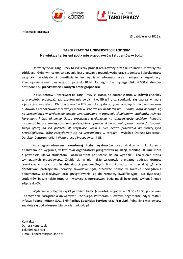 Informacja prasowa 13 października 2016 r. TARGI PRACY NA UNIWERSYTECIE ŁÓDZKIM Największe tej jesieni spotkanie pracodawców i studentów w Łodzi Uniwersyteckie Targi Pracy to cykliczny projekt realizowany przez Biuro Karier Uniwersytetu Łódzkiego. Głównym celem wydarzenia jest zrzeszanie pracodawców oraz studentów i absolwentów wszystkich wydziałów i umożliwianie im wymiany informacji oraz nawiązania współpracy. Przedsięwzięcie realizowane jest od przeszło 10 lat i każdego roku przyciąga blisko 6 000 studentów oraz ponad 50 przedstawicieli różnych branż gospodarki. Dla studentów Uniwersyteckie Targi Pracy są szansą na poznanie firm, w których chcieliby w przyszłości pracować, zaprezentowania swoich kwalifikacji oraz spotkania się twarzą w twarz z jej przedstawicielami. Dla pracodawców UTP jest okazją do pozyskania nowych pracowników oraz budowania rozpoznawalności swojej marki w środowisku akademickim. - Firma, która decyduje się na uczestnictwo w wydarzeniu zostaje wypromowana w otoczeniu skupiającym studentów różnych kierunków, którzy aktywnie śledzą prestiżowe wydarzenia na Uniwersytecie Łódzkim. Ponadto możliwość bezpośredniego poznania potencjalnych pracowników pozwala firmom lepiej dostosować swoją ofertę do ich potrzeb. W przyszłości wielu z nich będzie pracowało na rozwój tych przedsiębiorstw, które zdecydowały się na uczestnictwo w targach - wyjaśnia Dariusz Koperczak, Dyrektor Centrum Karier i Współpracy z Pracodawcami UŁ. Poza zgromadzeniem rekordowej liczby wystawców oraz atrakcyjnymi konkursami z tabletami do wygrania, w tym roku organizatorzy przygotowali aplikację mobilną UTPuni, która z pewnością ułatwi studentom i absolwentom poruszanie się po wydziale i znalezienie stoisk wymarzonych pracodawców. Znajdą się w niej także wskazówki przydatne podczas rozmów rekrutacyjnych oraz profile działalności poszczególnych firm. Ponadto, w specjalnej „Strefie doradztwa” profesjonalni doradcy zawodowi będą oferować pomoc w zakresie sporządzenia dokumentów aplikacyjnych oraz przygotowania się do rozmowy kwalifikacyjnej. Do dyspozycji studentów będzie także fotograf - wszyscy zainteresowani będą mogli bezpłatnie wykonać nowe zdjęcie do CV. Wydarzenie odbędzie się 27 października br. (czwartek) w godzinach 9:00 - 15:30, jak co roku - na Wydziale Zarządzania Uniwersytetu Łódzkiego. Partnerami Głównymi tegorocznej edycji zostali: Infosys Poland, mBank S.A., BNP Paribas Securities Services oraz Pracuj.pl. Pełna lista wystawców znajduje się pod adresem: biurokarier.uni.lodz.pl. Kontakt: Dariusz Koperczak Tel.: 693 636 491 E-mail: [email protected]