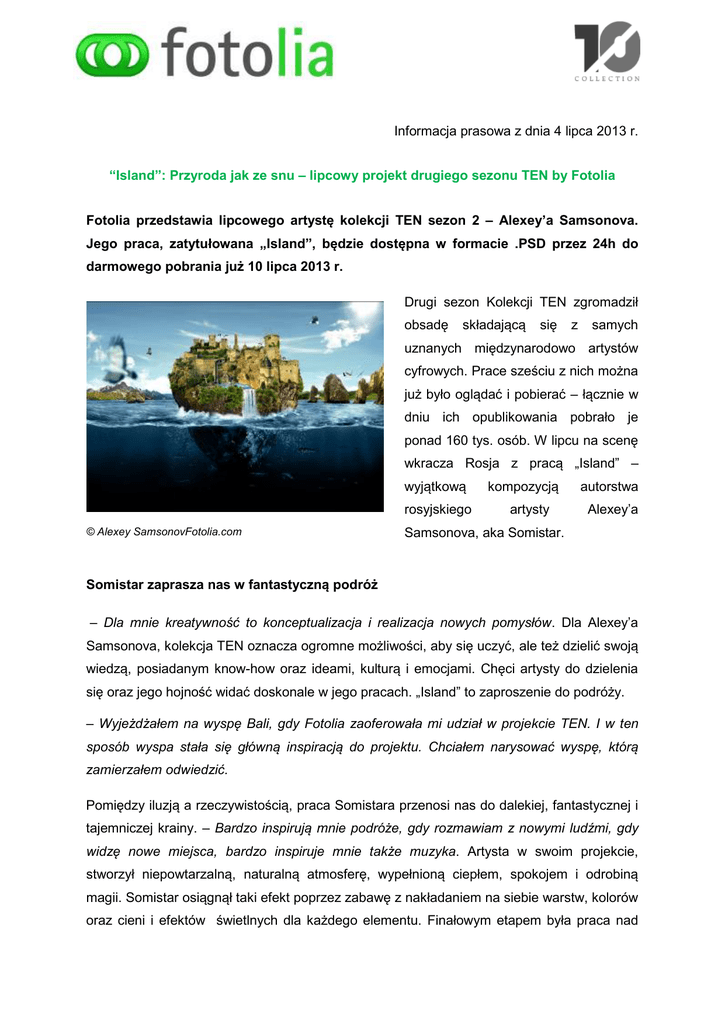 Informacja prasowa z dnia 4 lipca 2013 r. “Island”: Przyroda jak ze snu – lipcowy projekt drugiego sezonu TEN by Fotolia Fotolia przedstawia lipcowego artystę kolekcji TEN sezon 2 – Alexey’a Samsonova. Jego praca, zatytułowana „Island”, będzie dostępna w formacie .PSD przez 24h do darmowego pobrania już 10 lipca 2013 r. Drugi sezon Kolekcji TEN zgromadził obsadę składającą się z samych uznanych międzynarodowo artystów cyfrowych. Prace sześciu z nich można już było oglądać i pobierać – łącznie w dniu ich opublikowania pobrało je ponad 160 tys. osób. W lipcu na scenę wkracza Rosja z pracą „Island” – wyjątkową rosyjskiego © Alexey SamsonovFotolia.com kompozycją artysty autorstwa Alexey’a Samsonova, aka Somistar. Somistar zaprasza nas w fantastyczną podróż – Dla mnie kreatywność to konceptualizacja i realizacja nowych pomysłów. Dla Alexey’a Samsonova, kolekcja TEN oznacza ogromne możliwości, aby się uczyć, ale też dzielić swoją wiedzą, posiadanym know-how oraz ideami, kulturą i emocjami. Chęci artysty do dzielenia się oraz jego hojność widać doskonale w jego pracach. „Island” to zaproszenie do podróży. – Wyjeżdżałem na wyspę Bali, gdy Fotolia zaoferowała mi udział w projekcie TEN. I w ten sposób wyspa stała się główną inspiracją do projektu. Chciałem narysować wyspę, którą zamierzałem odwiedzić. Pomiędzy iluzją a rzeczywistością, praca Somistara przenosi nas do dalekiej, fantastycznej i tajemniczej krainy. – Bardzo inspirują mnie podróże, gdy rozmawiam z nowymi ludźmi, gdy widzę nowe miejsca, bardzo inspiruje mnie także muzyka. Artysta w swoim projekcie, stworzył niepowtarzalną, naturalną atmosferę, wypełnioną ciepłem, spokojem i odrobiną magii. Somistar osiągnął taki efekt poprzez zabawę z nakładaniem na siebie warstw, kolorów oraz cieni i efektów świetlnych dla każdego elementu. Finałowym etapem była praca nad kolorystyką ilustracji jako całości, tak żeby wszystko do siebie pasowało. Dzięki temu każdy element składowy – bujna natura, różnorodność zwierząt, starożytne domy, wodospady – tworzyły harmonijną całość z majestatycznym oceanem. Inspiracja zaczerpnięta z samego serca podróży Podróżowanie największym jest źródłem bez wątpliwości inspiracji dla Somistara. – Odkrywanie nowych miejsc, ciepłych krajów, uśmiechniętych i otwartych ludzi, nowych kultur, muzyki itp. jest doskonałym źródłem kreatywnych pomysłów. Malowniczy krajobraz, nawet jeżeli ukazany tylko w telewizorze, może dać mi pomysły do nowych kreacji. Krajobraz wyspy, który wygląda jak ze snu, doskonale pokazuje przemyślenia autora na temat podróżowania oraz jego miłość do natury i odkrywania nowych rzeczy. Od księgowości do sztuki, nietypowa droga samouka Alexey Samsonov mieszka i pracuje w Moskwie jako freelancer. Zanim stał się Somistarem jego kariera była bardzo daleka od artystycznych aspiracji – studiował księgowość, później był kucharzem, aż w końcu administratorem systemów informatycznych. – Z designem zetknąłem sie przypadkowo. Byłem administratorem w firmie, ale zajmowałem się też fotografią i Photoshopem. Z czasem moje hobby zamieniło się w moją pracę. Udało mi się głównie dlatego, że pracowałem w studiach kreatywnych i agencjach, a także ponieważ znałem dosyć dużo ludzi z tej branży – mówi autor. Alexey Samsonov specjalizuje się w projektach reklamowych. Jest doskonale znany ze względu na swoją kreatywność i skrupulatność w komponowaniu elementów fotograficznych, uznany przez międzynarodowe grupy reklamowe i znane światowe marki jak Audi, piwo Zhiguli czy też operatorzy telefoniczny Beeline oraz Megafon. Powstały również dwa filmy, z napisami w 12 językach, prezentujące otoczenie artysty oraz jego techniki pracy. Pierwszy z nich, obrazujący codzienność Alexey’a, będzie dostępny na dedykowanej stronie TEN na Facebook od 5 lipca. Drugie wideo na temat techniki pracy artysty będzie dostępne w dzień inauguracji pracy, 10 lipca na kanale YouTube kolekcji TEN oraz na stronie kolekcji TEN. Plik .PSD z pracą Alexey’a Samsonova będzie dostępny za darmo na stronie http://tenbyfotolia.com przez 24 godziny od momentu publikacji, 10 lipca 2013 roku o godz. 10.00. O projekcie TEN Fotolia Kolekcja TEN to edukacyjna inicjatywa, która powstała przy współpracy Fotolii z dwoma wspólnotami graficznymi – Wisibility i Amkashop. Przez kolejnych 10 miesięcy użytkownicy internetu mogą pobrać za darmo, przez 24 godziny od momentu publikacji, plik .PSD z pracą jednego z 10 światowej sławy artystów cyfrowych, które powstały na bazie zdjęć z Fotolii. Użytkownicy internetu w każdym kolejnym miesiącu trwania projektu będą mieli dostęp do pliku .PSD, w którym będzie można zobaczyć wszystkie warstwy i wykorzystane techniki. Projekt TEN wspierają międzynarodowi partnerzy Adobe i Wacom, a także lokalni Wilogo, EIZO, Ilford, Eduweb.pl oraz Digart.pl. Twórcami drugiej edycji projektu jest 10 uznanych międzynarodowo artystów, z takich państw jak: Argentyna, Brazylia, Korea, Japonia, Rosja, Polska, Włochy, Hiszpania, Wielka Brytania i Niemcy 1. Dodatkowe informacje na temat kolekcji TEN można znaleźć na stronie http://tenbyfotolia.com, skąd również można pobrać press kit (folder Menu, zakładka Koncepcja) oraz dedykowanej stronie na Facebooku. *** Informacje dodatkowe o banku zdjęć Fotolia Fotolia, wiodący w Europie bank zdjęć typu microstock, z siedzibą w Nowym Yorku, dostarcza swoje usługi dla klientów 23 krajów i regionów, w 14 różnych językach. Posiadając w swoich zasobach wybór ponad 23 milionów obrazów cyfrowych i klipów wideo, Fotolia oferuje jedną z największych na świecie baz obrazów cyfrowych wysokiej jakości. Ponad 4.1 miliona osób wybiera serwis Fotolia jako źródło zdjęć, ilustracji, grafik wektorowych i 
