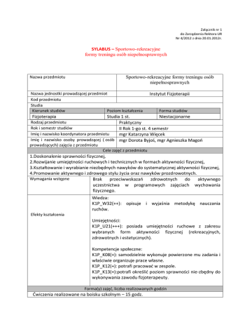 Załącznik nr 1 do Zarządzenia Rektora UR Nr 4/2012 z dnia 20.01.2012r. SYLABUS – Sportowo-rekreacyjne formy treningu osób niepełnosprawnych Sportowo-rekreacyjne formy treningu osób niepełnosprawnych Nazwa przedmiotu Nazwa jednostki prowadzącej przedmiot Kod przedmiotu Studia Kierunek studiów Poziom kształcenia Instytut Fizjoterapii Forma studiów Fizjoterapia Studia 1 st. Niestacjonarne Rodzaj przedmiotu Praktyczny Rok i semestr studiów II Rok 1-go st. 4 semestr Imię i nazwisko koordynatora przedmiotu mgr Katarzyna Więcek Imię i nazwisko osoby prowadzącej ( osób mgr Dorota Byjoś, mgr Agnieszka Magoń prowadzących) zajęcia z przedmiotu Cele zajęć z przedmiotu 1.Doskonalenie sprawności fizycznej, 2.Rozwijanie umiejętności ruchowych i technicznych w formach aktywności fizycznej, 3.Kształtowanie i wyrabianie niezbędnych nawyków do systematycznej aktywności fizycznej, 4.Promowanie aktywnego i zdrowego stylu życia oraz nawyków prozdrowotnych. Wymagania wstępne Brak przeciwwskazań zdrowotnych do aktywnego uczestnictwa w programowych zajęciach wychowania fizycznego. Wiedza: K1P_W32(++): opisuje i wyjaśnia metodykę nauczania ruchów. Efekty kształcenia Umiejętności: K1P_U21(+++): posiada umiejętności ruchowe z zakresu wybranych form aktywności fizycznej (rekreacyjnych, zdrowotnych i estetycznych). Kompetencje społeczne: K1P_K08(+): samodzielnie wykonuje powierzone mu zadania i właściwie organizuje prace własne. K1P_K12(+): potrafi pracować w zespole. K1P_K13(+):potrafi określić poziom sprawności nie-zbędny do wykonywania zawodu fizjoterapeuty. Forma(y) zajęć, liczba realizowanych godzin Ćwiczenia realizowane na boisku szkolnym – 15 godz. Treści programowe 1. Charakterystyka sportu, rekreacji. Systematyka LA, podział na konkurencje, dystanse, kategorie. Rola lekkoatletycznych form rehabilitacji w procesie kompleksowej rehabilitacji osób niepełnosprawnych. Możliwość usprawniania poprzez dyscypliny i konkurencje sportowe. 2. Gry i zabawy w lekkiej atletyce. Technika biegu. Nauka startu niskiego: start z marszu, truchtu, z opadu z pozycji wykrocznej nogą mocniejszą. Start niski z bloków startowych. 3. Biegi krótkie: technika kroku biegowego. Bieg na 60 m z pomiarem czasu, oraz na 800 m i 1500 m. 4. Bieg przez płotki: technika biegu (odbicie, atak płotka, ułożenie ciała nad płotkiem, zejście z płotka lądowanie, bieg miedzy płotkami – rytm międzypłotkowy ). 5. Skoki: skok w dal z miejsca i z rozbiegu z pomiarem odległości. Fazy oraz techniki skoku. - trójskok ( nauka, ćw. przygotowawcze) 6. Rzuty: rzut piłeczką palantową i pchnięcia kulą (nauka chwytu piłeczki, nauka kroku skrzyżnego) – pomiar odległości. 7. Test Coopera. Zaliczenie przedmiotu, wpisy ocen do indeksów. Metody dydaktyczne Metody nauczania ruchu - analityczna, syntetyczna, kombinowana. Metody wychowawczego oddziaływania, opracowanie konspektu ćwiczeń, Sposób(y) i forma(y) zaliczenia Zaliczenie z oceną. Czynny udział w zajęciach. Sprawdzian umiejętności praktycznych z zakresu konkurencji LA : biegowych, skocznościowych oraz rzutowych. Metody i kryteria oceny Ocena umiejętności : -bieg na 60 m ze startu niskiego -bieg na 800 m kobiety i 1500 m mężczyźni -skok w dal z rozbiegu -rzut piłeczką palantową - pchnięcie kulą Ocena wiedzy: pisanie konspektu lekcji K1P_W32 5.0 – wykazuje znajomość toku lekcji aktywności fizycznej osób niepełnosprawnych – części wstępnej (rozgrzewka), części głównej (ćwiczenia aerobowe i wzmacniające) oraz części końcowej (ćwiczenia rozciągające i uspokajające) na poziomie 90%-100% 4.5 – wykazuje znajomość toku lekcji aktywności fizycznej osób niepełnosprawnych na poziomie 80%89% 4.0 – wykazuje znajomość toku lekcji aktywności fizycznej osób niepełnosprawnych na poziomie 70%79% 3.5 – wykazuje znajomość toku lekcji aktywności fizycznej osób niepełnosprawnych na poziomie 60%69% 3.0 – wykazuje znajomość toku lekcji aktywności fizycznej osób niepełnosprawnych na poziomie 50%59% 2.0 – wykazuje znajomość toku lekcji aktywności fizycznej osób niepełnosprawnych poniżej 50% Ocena umiejętności K1P_U21 5.0 – student aktywnie uczestniczy w zajęciach, prowadzi ćwiczenia w oparciu o poprawnie, pod względem merytorycznym i metodycznym konspekt, 4.5 – student aktywnie uczestniczy w zajęciach, z niewielką pomocą prowadzącego, prowadzi ćwiczenia w oparciu o poprawnie, pod względem merytorycznym i metodycznym konspekt, 4.0 – student aktywnie uczestniczy w zajęciach, z niewielką pomocą prowadzącego prowadzi w oparciu o konspekt zawierający drobne poprawki naniesione przez nauczyciela 3.5 – student uczestniczy w zajęciach, proponuje ćwiczenia, których nie potrafi dobrze pokazać, prowadzi ćwiczenia w oparciu o konspekt zawierający, liczne poprawki i wskazówki nauczyciela 3.0 – student uczestniczy w zajęciach, proponuje ćwiczenia wymagające korekty ze strony prowadzącego, mimo licznych poprawek i wskazówek nauczyciela popełnia jednak drobne błędy 2.0 – student biernie i rzadko uczestniczy w zajęciach, proponowane ćwiczenia są niepoprawnie, większość wymaga korekty ze strony prowadzącego, pomimo licznych uwag nauczyciela popełnia rażące błędy w doborze ćwiczeń i metodyce prowadzenia zajęć Ocena kompetencji: K1P_K08, K1P_K012, K1P_K013 ocena z zakresu kompetencji personalno-społecznych będzie oceniana przez prowadzącego w formie obserwacji postawy i zaangażowania podczas zajęć. Całkowity nakład pracy studenta potrzebny do osiągnięcia założonych efektów w godzinach oraz punktach ECTS Aktywność Liczba nakład studenta Konwersatoria 13 godz. przygotowanie do ćwiczeń 2 godz. samodzielna lektura 2 godz. przygotowanie konspektu 3 godz. przygotowanie do 3 godz. zaliczenia praktycznego godzin/ pracy udział w zaliczeniu ćwiczeń SUMA GODZIN LICZBA PUNKTÓW ECTS Język wykładowy Praktyki zawodowe p