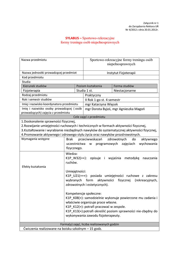 Załącznik nr 1 do Zarządzenia Rektora UR Nr 4/2012 z dnia 20