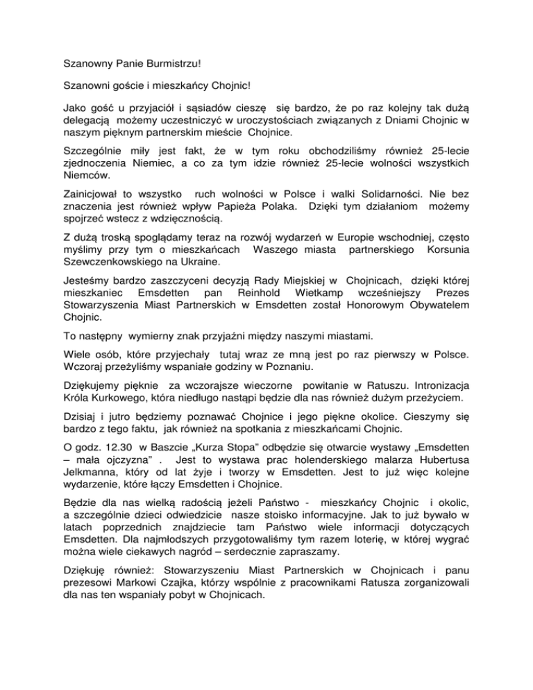 Szanowny Panie Burmistrzu! Szanowni goście i mieszkańcy Chojnic! Jako gość u przyjaciół i sąsiadów cieszę się bardzo, że po raz kolejny tak dużą delegacją możemy uczestniczyć w uroczystościach związanych z Dniami Chojnic w naszym pięknym partnerskim mieście Chojnice. Szczególnie miły jest fakt, że w tym roku obchodziliśmy również 25-lecie zjednoczenia Niemiec, a co za tym idzie również 25-lecie wolności wszystkich Niemców. Zainicjował to wszystko ruch wolności w Polsce i walki Solidarności. Nie bez znaczenia jest również wpływ Papieża Polaka. Dzięki tym działaniom możemy spojrzeć wstecz z wdzięcznością. Z dużą troską spoglądamy teraz na rozwój wydarzeń w Europie wschodniej, często myślimy przy tym o mieszkańcach Waszego miasta partnerskiego Korsunia Szewczenkowskiego na Ukraine. Jesteśmy bardzo zaszczyceni decyzją Rady Miejskiej w Chojnicach, dzięki której mieszkaniec Emsdetten pan Reinhold Wietkamp wcześniejszy Prezes Stowarzyszenia Miast Partnerskich w Emsdetten został Honorowym Obywatelem Chojnic. To następny wymierny znak przyjaźni między naszymi miastami. Wiele osób, które przyjechały tutaj wraz ze mną jest po raz pierwszy w Polsce. Wczoraj przeżyliśmy wspaniałe godziny w Poznaniu. Dziękujemy pięknie za wczorajsze wieczorne powitanie w Ratuszu. Intronizacja Króla Kurkowego, która niedługo nastąpi będzie dla nas również dużym przeżyciem. Dzisiaj i jutro będziemy poznawać Chojnice i jego piękne okolice. Cieszymy się bardzo z tego faktu, jak również na spotkania z mieszkańcami Chojnic. O godz. 12.30 w Baszcie „Kurza Stopa” odbędzie się otwarcie wystawy „Emsdetten – mała ojczyzna” . Jest to wystawa prac holenderskiego malarza Hubertusa Jelkmanna, który od lat żyje i tworzy w Emsdetten. Jest to już więc kolejne wydarzenie, które łączy Emsdetten i Chojnice. Będzie dla nas wielką radością jeżeli Państwo - mieszkańcy Chojnic i okolic, a szczególnie dzieci odwiedzicie nasze stoisko informacyjne. Jak to już bywało w latach poprzednich znajdziecie tam Państwo wiele informacji dotyczących Emsdetten. Dla najmłodszych przygotowaliśmy tym razem loterię, w której wygrać można wiele ciekawych nagród – serdecznie zapraszamy. Dziękuję również: Stowarzyszeniu Miast Partnerskich w Chojnicach i panu prezesowi Markowi Czajka, którzy wspólnie z pracownikami Ratusza zorganizowali dla nas ten wspaniały pobyt w Chojnicach. Z okazji obchodów Dni Chojnic życzę wszystkim wielu wspaniałych wrażeń i jeszcze raz dziękuję panu Burmistrzowi Arseniuszowi Finster oraz jego zespołowi za wspaniałą organizację tego święta miasta.