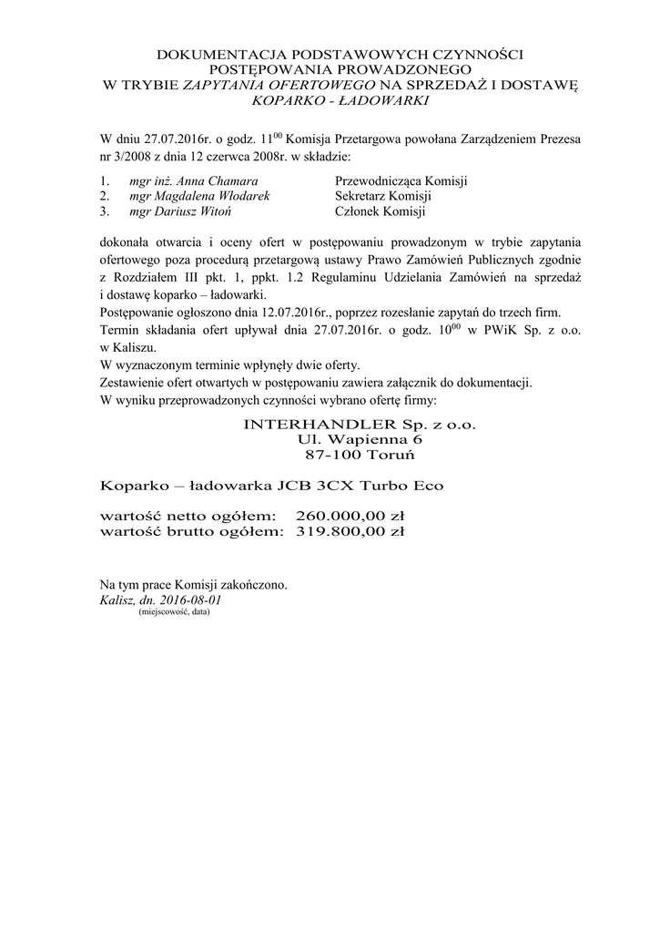 DOKUMENTACJA PODSTAWOWYCH CZYNNOŚCI POSTĘPOWANIA PROWADZONEGO W TRYBIE ZAPYTANIA OFERTOWEGO NA SPRZEDAŻ I DOSTAWĘ KOPARKO - ŁADOWARKI W dniu 27.07.2016r. o godz. 1100 Komisja Przetargowa powołana Zarządzeniem Prezesa nr 3/2008 z dnia 12 czerwca 2008r. w składzie: 1. 2. 3. mgr inż. Anna Chamara mgr Magdalena Włodarek mgr Dariusz Witoń Przewodnicząca Komisji Sekretarz Komisji Członek Komisji dokonała otwarcia i oceny ofert w postępowaniu prowadzonym w trybie zapytania ofertowego poza procedurą przetargową ustawy Prawo Zamówień Publicznych zgodnie z Rozdziałem III pkt. 1, ppkt. 1.2 Regulaminu Udzielania Zamówień na sprzedaż i dostawę koparko – ładowarki. Postępowanie ogłoszono dnia 12.07.2016r., poprzez rozesłanie zapytań do trzech firm. Termin składania ofert upływał dnia 27.07.2016r. o godz. 1000 w PWiK Sp. z o.o. w Kaliszu. W wyznaczonym terminie wpłynęły dwie oferty. Zestawienie ofert otwartych w postępowaniu zawiera załącznik do dokumentacji. W wyniku przeprowadzonych czynności wybrano ofertę firmy: INTERHANDLER Sp. z o.o. Ul. Wapienna 6 87-100 Toruń Koparko – ładowarka JCB 3CX Turbo Eco wartość netto ogółem: 260.000,00 zł wartość brutto ogółem: 319.800,00 zł Na tym prace Komisji zakończono. Kalisz, dn. 2016-08-01 (miejscowość, data)
