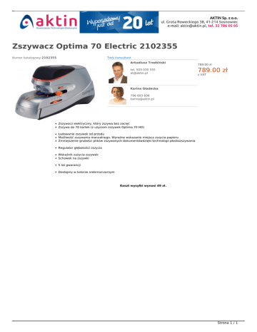 Zszywacz Optima 70 Electric 2102355 Numer katalogowy:2102355 Twój konsultant Arkadiusz Trzebiński tel. 503 030 555 [email protected] NOWOŚĆ W OFERCIE 789.00 zł 789.00 zł z VAT Karina Gładecka 796 603 606 [email protected] Zszywacz elektryczny, który zszywa bez zacięć Zszywa do 70 kartek (z użyciem zszywek Optima 70 HD) Ładowanie zszywek od przodu Możliwość zszywania manualnego. Wyraźne wskazanie miejsca zszycia papieru Zmniejszenie grubości plików zszywanych dokumentówdzięki technologii płaskozszywania Regulator głębokości zszycia Wskaźnik zużycia zszywek Schowek na zszywki 5 lat gwarancji Dostępny w kolorze srebrno/czarnym Koszt wysyłki wynosi 49 zł. Strona 1 / 1 Powered by TCPDF (www.tcpdf.org)