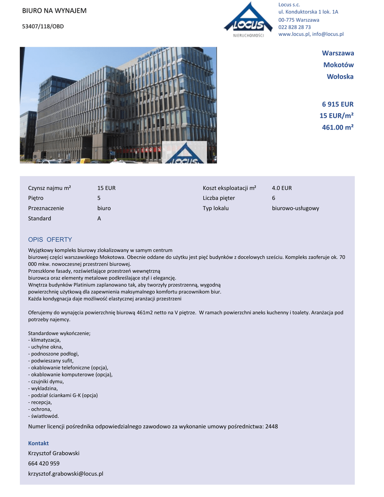 Locus s.c. ul. Konduktorska 1 lok. 1A 00-775 Warszawa 022 828 28 73 www.locus.pl, [email protected] BIURO NA WYNAJEM 53407/118/OBD Warszawa Mokotów tŽųŽƐŬĂ 6 915 EUR 15 EUR/m² 461.00 m² Czynsz najmu m² 15 EUR Koszt eksploatacji m² 4.0 EUR WŝħƚƌŽ 5 >ŝĐnjďĂƉŝħƚĞƌ 6 Przeznaczenie biuro Typ lokalu ďŝƵƌŽǁŽͲƵƐųƵŐŽǁLJ Standard A OPIS OFERTY tLJũČƚŬŽǁLJŬŽŵƉůĞŬƐďŝƵƌŽǁLJnjůŽŬĂůŝnjŽǁĂŶLJǁƐĂŵLJŵĐĞŶƚƌƵŵ ďŝƵƌŽǁĞũĐnjħƑĐŝǁĂƌƐnjĂǁƐŬŝĞŐŽDŽŬŽƚŽǁĂ͘KďĞĐŶŝĞŽĚĚĂŶĞĚŽƵǏLJƚŬƵũĞƐƚƉŝħđďƵĚLJŶŬſǁnjĚŽĐĞůŽǁLJĐŚƐnjĞƑĐŝƵ͘<ŽŵƉůĞŬƐnjĂŽĨĞƌƵũĞŽŬ͘70 000 mkw. nowoczesnej przestrzeni biurowej. WƌnjĞƐnjŬůŽŶĞĨĂƐĂĚLJ͕ƌŽnjƑǁŝĞƚůĂũČĐĞƉƌnjĞƐƚƌnjĞŷǁĞǁŶħƚƌnjŶČ ďŝƵƌŽǁĐĂŽƌĂnjĞůĞŵĞŶƚLJŵĞƚĂůŽǁĞƉŽĚŬƌĞƑůĂũČĐĞƐƚLJůŝĞůĞŐĂŶĐũħ͘ tŶħƚƌnjĂďƵĚLJŶŬſǁWůĂƚŝŶŝƵŵnjĂƉůĂŶŽǁĂŶŽƚĂŬ͕ĂďLJƚǁŽƌnjLJųLJƉƌnjĞƐƚƌnjĞŶŶČ͕ǁLJŐŽĚŶČ ƉŽǁŝĞƌnjĐŚŶŝħƵǏLJƚŬŽǁČĚůĂnjĂƉĞǁŶŝĞŶŝĂŵĂŬƐLJŵĂůŶĞŐŽŬŽŵĨŽƌƚƵƉƌĂĐŽǁŶŝŬŽŵďŝƵƌ͘ <ĂǏĚĂŬŽŶĚLJŐŶĂĐũĂĚĂũĞŵŽǏůŝǁŽƑđĞůĂƐƚLJĐnjŶĞũĂƌĂŶǏĂĐũŝƉƌnjĞƐƚƌnjĞŶŝ KĨĞƌƵũĞŵLJĚŽǁLJŶĂũħĐŝĂƉŽǁŝĞƌnjĐŚŶŝħďŝƵƌŽǁČ461m2ŶĞƚƚŽŶĂsƉŝħƚƌnjĞ͘tƌĂŵĂĐŚƉŽǁŝĞƌnjĐŚŶŝĂŶĞŬƐŬƵĐŚĞŶŶLJŝƚŽĂůĞƚLJ͘ƌĂŶǏĂĐũĂƉŽĚ potrzeby najemcy. ^ƚĂŶĚĂƌĚŽǁĞǁLJŬŽŷĐnjĞŶŝĞ͖ - klimatyzacja, - uchylne okna, ͲƉŽĚŶŽƐnjŽŶĞƉŽĚųŽŐŝ͕ - podwieszany sufit, - okablowanie telefoniczne (opcja), - okablowanie komputerowe (opcja), - czujniki dymu, - wykladzina, ͲƉŽĚnjŝĂųƑĐŝĂŶŬĂŵŝ'Ͳ<;ŽƉĐũĂͿ - recepcja, - ochrona, ͲƑǁŝĂƚųŽǁſĚ͘ EƵŵĞƌůŝĐĞŶĐũŝƉŽƑƌĞĚŶŝŬĂŽĚƉŽǁŝĞĚnjŝĂůŶĞŐŽnjĂǁŽĚŽǁŽnjĂǁLJŬŽŶĂŶŝĞƵŵŽǁLJƉŽƑƌĞĚŶŝĐƚǁĂ͗Ϯϰϰϴ Kontakt Krzysztof Grabowski 664 420 959 [email protected] BIURO NA WYNAJEM 53407/118/OBD KK&Zd% Locus s.c. ul. Konduktorska 1 lok. 1A 00-775 Warszawa 022 828 28 73 www.locus.pl, [email protected]