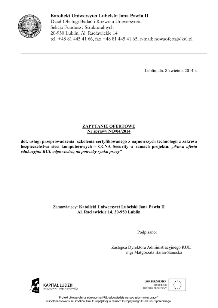 Katolicki Uniwersytet Lubelski Jana Pawła II Dział Obsługi Badań i Rozwoju Uniwersytetu Sekcja Funduszy Strukturalnych 20-950 Lublin, Al. Racławickie 14 tel. +48 81 445 41 66, fax +48 81 445 41 65, e-mail: [email protected] [email protected] Lublin, dn. 8 kwietnia 2014 r. ZAPYTANIE OFERTOWE Nr sprawy NO/04/2014 dot. usługi przeprowadzenia szkolenia certyfikowanego z najnowszych technologii z zakresu bezpieczeństwa sieci komputerowych – CCNA Security w ramach projektu: „Nowa oferta edukacyjna KUL odpowiedzią na potrzeby rynku pracy” Zamawiający: Katolicki Uniwersytet Lubelski Jana Pawła II Al. Racławickie 14, 20-950 Lublin Podpisano: Zastępca Dyrektora Administracyjnego KUL mgr Małgorzata Baran-Sanocka Projekt „Nowa oferta edukacyjna KUL odpowiedzią na potrzeby rynku pracy” współfinansowany ze środków Unii Europejskiej w ramach Europejskiego Funduszu Społecznego Katolicki Uniwersytet Lubelski Jana Pawła II Dział Obsługi Badań i Rozwoju Uniwersytetu Sekcja Funduszy Strukturalnych 20-950 Lublin, Al. Racławickie 14 tel. +48 81 445 41 66, fax +48 81 445 41 65, e-mail: [email protected] [email protected] Katolicki Uniwersytet Lubelski Jana Pawła II zaprasza do złożenia oferty na usługę dot. przeprowadzenia szkolenia certyfikowanego z najnowszych technologii z zakresu bezpieczeństwa sieci komputerowych – CCNA Security dla jednego wykładowcy ze stopniem min. dr wytypowanego przez Dziekana Wydziału Matematyki, Informatyki i Architektury Krajobrazu KUL w ramach projektu: „Nowa oferta edukacyjna KUL odpowiedzią na potrzeby rynku pracy” współfinansowanego ze środków Unii Europejskiej w ramach Europejskiego Funduszu Społecznego. Program Operacyjny Kapitał Ludzki, Priorytet IV „Szkolnictwo wyższe i nauka”. Poddziałanie 4.3 Wzmocnienie potencjału dydaktycznego uczelni w obszarach kluczowych w kontekście celów Strategii Europa 2020. Umowa o dofinansowanie realizacji projektu Nr UDA-POKL.04.03.00-00-110/12-01 I. WPROWADZENIE 1. Do niniejszego postępowania mają zastosowanie przepisy ustawy z dnia 23 kwietnia 1964 kodeks cywilny (Dz. U. Nr 16 poz. 93 ze zm.), a nie mają zastosowania przepisy ustawy z dnia 29.01.2004r. Prawo zamówień publicznych (Dz. U. z 2013 r., poz. 907 z późn. zm.). 2. Postępowanie prowadzone jest w trybie zapytania ofertowego z zachowaniem zasady konkurencyjności i równego traktowania Wykonawców. 3. Wartość szacunkowa zamówienia została ustalona zgodnie z ustawą Prawo zamówień publicznych (Dz. U. z 2013 r., poz. 907 z późn. zm.) i wynosi poniżej 14 000 EURO. 4. Postępowanie prowadzone jest w języku polskim. II. NAZWA ORAZ ADRES ZAMAWIAJĄCEGO 1. Katolicki Uniwersytet Lubelski Jana Pawła II Al. Racławickie 14, 20-950 Lublin NIP: 712-016-10-05, REGON: 000514064 2. Jednostka prowadząca: Dział Obsługi Badań i Rozwoju Uniwersytetu, Sekcja Funduszy Strukturalnych, tel. (81) 445 41 66. III. OKREŚLENIE PRZEDMIOTU ZAMÓWIENIA ORAZ ZAKRESU ZAMÓWIENIA 1. Przedmiotem zamówienia jest usługa przeprowadzenia szkolenia certyfikowanego z najnowszych technologii z zakresu bezpieczeństwa sieci komputerowych – CCNA Security i przeprowadzenie egzaminu/testu sprawdzającego z zakresu ww. szkolenia dla jednego Projekt „Nowa oferta edukacyjna KUL odpowiedzią na potrzeby rynku pracy” współfinansowany ze środków Unii Europejskiej w ramach Europejskiego Funduszu Społecznego Katolicki Uniwersytet Lubelski Jana Pawła II Dział Obsługi Badań i Rozwoju Uniwersytetu Sekcja Funduszy Strukturalnych 20-950 Lublin, Al. Racławickie 14 tel. +48 81 445 41 66, fax +48 81 445 41 65, e-mail: [email protected] [email protected] wykładowcy ze stopniem min. dr wytypowanego przez Dziekana Wydziału Matematyki, Informatyki i Architektury Krajobrazu KUL. 2. Kody Wspólnego Słownika Zamówień (CPV): - CPV 80500000-9 usługi szkoleniowe - CPV 80510000-2 usługi szkolenia specjalistycznego - CPV 80511000-9 usługi szkolenia personelu a) Zamówienie obejmuje prowadzenie szkolenia dla jednej osoby (w grupie szkoleniowej liczącej maksymalnie 12 osób ) lub przeprowadzenie szkolenia w trybie zdalnym na odległość przy użyciu platformy e-learningowej b) Forma zajęć: wykłady połączone z ćwiczeniami praktycznymi prowadzonymi przez instruktora lub w trybie zdalnym na odległość przy użyciu platformy e-learningowej c) Liczba godzin min. 170 godzin dydaktycznych przy założeniu, że godz. dydaktyczna liczy 45 min d) przeprowadzenie egzaminu /testu sprawdzającego o ile jest wymagana tego typu forma zakończenia szkolenia do uzyskania zaświadczenia/certyfikatu e) Minimalny zakres programu szkolenia powinien obejmować: Nowoczesne zagrożenia bezpieczeństwa sieci Sposoby zabezpieczania urządzeń sieciowych Techniki AAA (Authentication, Authorization and Accounting) Sposoby budowania firewalli (zobacz DEMO) Wdrażanie technologii zabezpieczających przed włamaniem (IPS) Zabezpieczenia sieci LAN Kryptografia Wdrażanie połączeń VPN Zarządzanie bezpieczną siecią Do zapytania ofertowego każdy z Oferentów powinien dołączyć szczegółowy program i harmonogram szkolenia. 3. Wykonawca zapewnia realizację usługi do 30 listopada 2014r. 4. Wykonawca dla osób kierowanych na szkolenie zapewni: pełną infrastrukturę szkoleniową tj. salę szkoleniowo - komputerową, samodzielne stanowiska szkoleniowe/ dostęp do platformy e-learningowej, materiały szkoleniowe, dostęp do testów egzaminacyjnych . Projekt „Nowa oferta edukacyjna KUL odpowiedzią na potrzeby rynku pracy” współfinansowany ze środków Unii Europejskiej w ramach Europejskiego Funduszu Społecznego Katolicki Uniwersytet Lubelski Jana Pawła II Dział Obsługi Badań i Rozwoju Uniwersytetu Sekcja Funduszy Strukturalnych 20-950 Lublin, Al. Racławickie 14 tel. +48 81 445 41 66, fax +48 81 445 41 65, e-mail: [email protected] [email protected] W ramach usługi Wykonawca zobowiązuje się do: a) przeprowadzenia szkolenia z zakresu bezpieczeństwa s