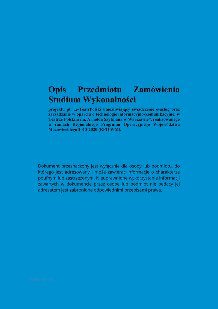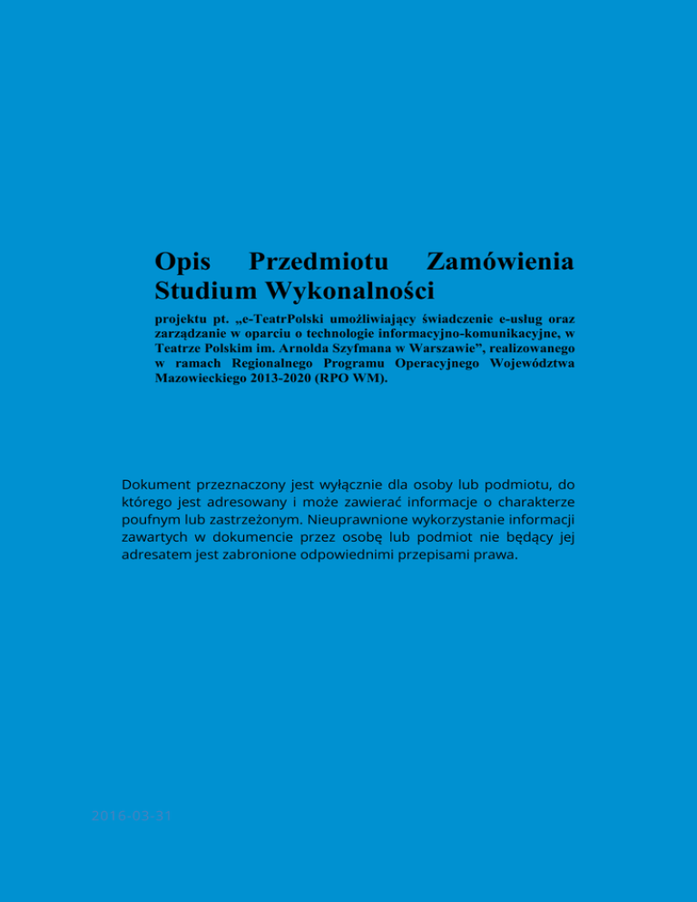Opis Przedmiotu Zamówienia Studium Wykonalności projektu pt. „e-TeatrPolski umożliwiający świadczenie e-usług oraz zarządzanie w oparciu o technologie informacyjno-komunikacyjne, w Teatrze Polskim im. Arnolda Szyfmana w Warszawie”, realizowanego w ramach Regionalnego Programu Operacyjnego Województwa Mazowieckiego 2013-2020 (RPO WM). Dokument przeznaczony jest wyłącznie dla osoby lub podmiotu, do którego jest adresowany i może zawierać informacje o charakterze poufnym lub zastrzeżonym. Nieuprawnione wykorzystanie informacji zawartych w dokumencie przez osobę lub podmiot nie będący jej adresatem jest zabronione odpowiednimi przepisami prawa. 2016-03-31 str. 1 z 14 OPZ dla Studium Wykonalności Spis treści 1 Metryka dokumentu. ........................................................................................................................ 4 1.1 Dokumenty powiązane ........................................................................................................................ 4 1.2 Definicje pojęć...................................................................................................................................... 4 1.3 Organizacja i wykonanie analiz. ........................................................................................................... 5 1.3.1 Analiza problemowa. ...................................................................................................................... 5 1.3.2 Sformułowanie założeń finansowych. ............................................................................................ 5 1.3.3 Wstępna analiza finansowa. ........................................................................................................... 5 1.3.4 Analizy popytu. ............................................................................................................................... 5 1.3.5 Organizacja, przeprowadzenie i podsumowanie spotkań z zespołem Teatru. Wykonawca SW zobowiązany jest do: ................................................................................................................................... 6 2 Struktura dokumentu Studium Wykonalności. .................................................................................. 7 2.1 3 Struktura i wprowadzenie. ................................................................................................................... 7 2.1.1 Rozdział 1 „Wstępna analiza projektu”........................................................................................... 7 2.1.2 Rozdział 2 „Wnioski” ....................................................................................................................... 8 2.1.3 Rozdział 3 „Definicja celów projektu” ............................................................................................. 9 2.1.4 Rozdział 4 „Identyfikacja projektu”................................................................................................. 9 2.1.5 Rozdział 5 „Analiza wykonalności, analiza popytu oraz analiza opcji”. ........................................ 10 2.1.6 Rozdział 6 „Analiza finansowa”. .................................................................................................... 11 2.1.7 Rozdział 7 „Analiza kosztów i korzyści (analiza ekonomiczna)”. ................................................... 11 2.1.8 Rozdział 8 „Analiza wrażliwości i ryzyka ( tylko dla dużych projektów)”. ..................................... 11 2.1.9 Rozdział 9 „Analiza instytucjonalna, w tym trwałość projektu”. .................................................. 11 2.1.10 Rozdział 10 „Pomoc publiczna”. .............................................................................................. 12 2.1.11 Rozdział 11 „Analiza oddziaływania na środowisko”. .............................................................. 12 Wyznaczenie priorytetów realizacyjnych ......................................................................................... 13 3.1 Koszty pozyskania komponentów w oparciu o ogólnodostępne informacje. ................................... 13 3.2 Wyznaczenie priorytetów wymagań biznesowych, organizacyjnych i architektonicznych. .............. 13 str. 2 z 14 OPZ dla Studium Wykonalności 3.3 4 Sformułowanie finalnych wariantów realizacyjnych. ........................................................................ 13 Wymagania ogólne. ........................................................................................................................ 14 4.1 Zasady i zakres współpracy z zespołem Teatru Polskiego.................................................................. 14 str. 3 z 14 OPZ dla Studium Wykonalności 1 Metryka dokumentu. 1.1 Dokumenty powiązane Integralną częścią Opisu Przedmiotu Zamówienia dla Studium Wykonalności jest dokument p.n. „Koncepcja wdrożenia Projektu e-TeatrPolski”. 1.2 Definicje pojęć BPU Firma Doradcza Koncepcja – Biznesowy Przypadek Użycia (z ang. Business Use Case) – grupa funkcji planowanego rozwiązania przynosząca określoną korzyść biznesową – współpracująca z zespołem Teatru Polskiego firma, wyłoniona w odrębnym postępowaniu – dokument o nazwie „Koncepcja wdrożenia Projektu e-Teatr Polski” OPZ – niniejszy dokument – opis przedmiotu zamówienia SW – Studium Wykonalności - pisane z wielkiej litery wskazania ( wyszczególnione dalej w tekście jako „Wskazania”) dla Regionalnego Programu Operacyjnego Województwa Mazowieckiego na lata 2014-2020 „Wskazania” przedstawiające sposób przygotowania Studium Wykonalności dla projektów planowanych do realizacji przy wsparciu z Europejskiego Funduszu Rozwoju Regionalnego (EFRR) w ramach RPO Województwa Mazowieckiego na lata 2014-2020 (RPO WP 2014-2020) str. 4 z 14 OPZ dla Studium Wykonalności W ramach przedmiotu zamówienia Wykonawca opracuje St