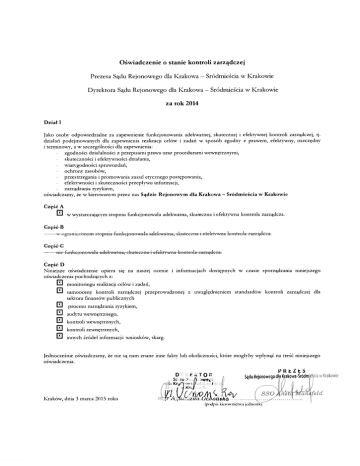 Oświadczenie o stanie kontroli zarządczej Prezesa Sądu Rejonowego dla Krakowa — Śródmieścia w Krakowie Dyrektora Sądu Rejonowego dla Krakowa — Śródmieścia w Krakowie za rok 2014 Dział I Jako osoby odpowiedzialne za zapewnienie funkcjonowania adekwatnej, skutecznej i efektywnej kontroli zarządczej, tj. działań podejmowanych dla zapewnienia realizacji celów i zadań w sposób zgodny z prawem, efektywny, oszczędny i terminowy, a w szczególności dla zapewnienia: zgodności działalności z przepisami prawa oraz procedurami wewnętrznymi, skuteczności i efektywności działania, wiarygodności sprawozdań, ochrony zasobów, przestrzegania i promowania zasad etycznego postępowania, efektywności i skuteczności przepływu informacji, zarządzania ryzykiem, oświadczamy, że w kierowanym przez nas Sądzie Rejonowym dla Krakowa — Śródmieścia w Krakowie Część A 0 w wystarczającym stopniu funkcjonowała adekwatna, skuteczna i efektywna kontrola zarządcza. Część B w ograniczonym stopniu funkc jonował a adekwatna, skuteczna i efektywna kontrola zarządcza. Część C nie funkcjonowała adekwatna, skuteczna i efektywna kontrola zarządcza. Część D Niniejsze oświadczenie opiera się na naszej ocenie i informacjach dostępnych w czasie sporządzania niniejszego oświadczenia pochodzących z: 0 monitoringu realizacji celów i zadań, 0 samooceny kontroli zarządczej przeprowadzonej z uwzględnieniem standardów kontroli zarządczej dla sektora finansów publicznych 0 procesu zarządzania ryzykiem, Q audytu wewnętrznego, 0 kontroli wewnętrznych, 0 kontroli zewnętrznych, 0 innych źródeł informacji: wniosków, skarg. Jednocześnie oświadczamy, że nie są nam znane inne fakty lub okoliczności, które mogłyby wpłynąć na treść niniejszego oświadczenia. P R t Z t i DYREKTOR \ Kraków, dnia 3 marca 2015 roku Sądu a i Rejsowego y / Sądu Rejonowego dla Krakowa-Śródm i Ti Ui woM** f W jr Agnieszka .Ochońska (podpis kierownictwa jednostki.