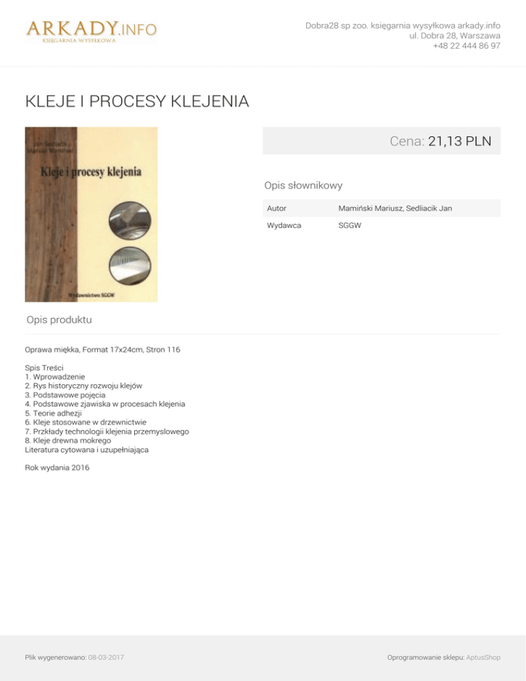 Dobra28 sp zoo. księgarnia wysyłkowa arkady.info ul. Dobra 28, Warszawa +48 22 444 86 97 KLEJE I PROCESY KLEJENIA Cena: 21,13 PLN Opis słownikowy Autor Mamiński Mariusz, Sedliacik Jan Wydawca SGGW Opis produktu Oprawa miękka, Format 17x24cm, Stron 116 Spis Treści 1. Wprowadzenie 2. Rys historyczny rozwoju klejów 3. Podstawowe pojęcia 4. Podstawowe zjawiska w procesach klejenia 5. Teorie adhezji 6. Kleje stosowane w drzewnictwie 7. Przkłady technologii klejenia przemyslowego 8. Kleje drewna mokrego Literatura cytowana i uzupełniająca Rok wydania 2016 Plik wygenerowano: 08-03-2017 Powered by TCPDF (www.tcpdf.org) Oprogramowanie sklepu: AptusShop