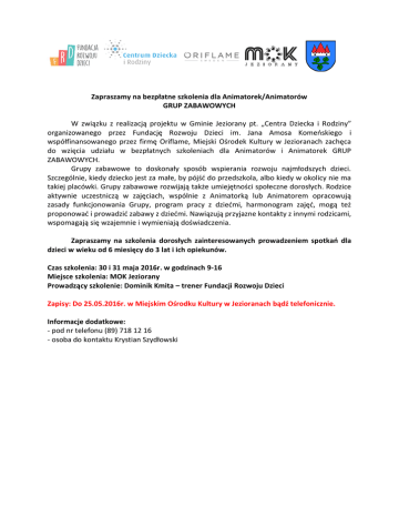 Zapraszamy na bezpłatne szkolenia dla Animatorek/Animatorów GRUP ZABAWOWYCH W związku z realizacją projektu w Gminie Jeziorany pt. „Centra Dziecka i Rodziny” organizowanego przez Fundację Rozwoju Dzieci im. Jana Amosa Komeńskiego i współfinansowanego przez firmę Oriflame, Miejski Ośrodek Kultury w Jezioranach zachęca do wzięcia udziału w bezpłatnych szkoleniach dla Animatorów i Animatorek GRUP ZABAWOWYCH. Grupy zabawowe to doskonały sposób wspierania rozwoju najmłodszych dzieci. Szczególnie, kiedy dziecko jest za małe, by pójść do przedszkola, albo kiedy w okolicy nie ma takiej placówki. Grupy zabawowe rozwijają także umiejętności społeczne dorosłych. Rodzice aktywnie uczestniczą w zajęciach, wspólnie z Animatorką lub Animatorem opracowują zasady funkcjonowania Grupy, program pracy z dziećmi, harmonogram zajęć, mogą też proponować i prowadzić zabawy z dziećmi. Nawiązują przyjazne kontakty z innymi rodzicami, wspomagają się wzajemnie i wymieniają doświadczenia. Zapraszamy na szkolenia dorosłych zainteresowanych prowadzeniem spotkań dla dzieci w wieku od 6 miesięcy do 3 lat i ich opiekunów. Czas szkolenia: 30 i 31 maja 2016r. w godzinach 9-16 Miejsce szkolenia: MOK Jeziorany Prowadzący szkolenie: Dominik Kmita – trener Fundacji Rozwoju Dzieci Zapisy: Do 25.05.2016r. w Miejskim Ośrodku Kultury w Jezioranach bądź telefonicznie. Informacje dodatkowe: - pod nr telefonu (89) 718 12 16 - osoba do kontaktu Krystian Szydłowski