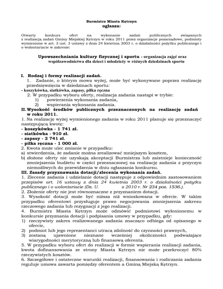 Burmistrz Miasta Kętrzyn ogłasza: Otwarty konkurs ofert na wykonanie zadań publicznych związanych z realizacją zadań Gminy Miejskiej Kętrzyn w roku 2011 przez organizacje pozarządowe, podmioty wymienione w art. 3 ust. 3 ustawy z dnia 24 kwietnia 2003 r. o działalności pożytku publicznego i o wolontariacie w zakresie: Upowszechniania kultury fizycznej i sportu - organizacja zajęć oraz współzawodnictwa dla dzieci i młodzieży w różnych dziedzinach sportu I. Rodzaj i formy realizacji zadań. 1. Zadanie, o którym mowa wyżej, może być wykonywane poprzez realizację przedsięwzięcia w dziedzinach sportu: - koszykówka, siatkówka, zapasy, piłka ręczna 2. W przypadku wyboru oferty, realizacja zadania nastąpi w trybie: 1) powierzenia wykonania zadania, 2) wspierania wykonania zadania. II. Wysokość środków publicznych przeznaczonych na realizację zadań w roku 2011. 1. Na realizację wyżej wymienionego zadania w roku 2011 planuje się przeznaczyć następującą kwotę: - koszykówka - 1 741 zł. - siatkówka - 910 zł. - zapasy - 2 741 zł. - piłka ręczna - 1 000 zł. 2. Kwota może ulec zmianie w przypadku: a) stwierdzenia, że zadanie można zrealizować mniejszym kosztem, b) złożone oferty nie uzyskają akceptacji Burmistrza lub zaistnieje konieczność zmniejszenia budżetu w części przeznaczonej na realizację zadania z przyczyn niemożliwych do przewidzenia w dniu ogłaszania konkursu. III. Zasady przyznawania dotacji/zlecenia wykonania zadań. 1. Zlecenie zadania i udzielanie dotacji następuje z odpowiednim zastosowaniem przepisów art. 16 ustawy z dnia 24 kwietnia 2003 r. o działalności pożytku publicznego i o wolontariacie (Dz. U. z 2010 r. Nr 234 poz. 1536.). 2. Złożenie oferty nie jest równoznaczne z przyznaniem dotacji. 3. Wysokość dotacji może być niższa niż wnioskowana w ofercie. W takim przypadku oferentowi przysługuje prawo negocjowania zmniejszenia zakresu rzeczowego zadania lub rezygnacji z jego realizacji. 4. Burmistrz Miasta Kętrzyn może odmówić podmiotowi wyłonionemu w konkursie przyznania dotacji i podpisania umowy w przypadku, gdy: 1) rzeczywisty zakres realizowanego zadania znacząco odbiega od opisanego w ofercie, 2) podmiot lub jego reprezentanci utracą zdolność do czynności prawnych, 3) zostaną ujawnione nieznane wcześniej okoliczności podważające wiarygodności merytoryczną lub finansową oferenta. 5. W przypadku wyboru ofert do realizacji w formie wspierania realizacji zadania, kwota dofinansowania ze strony Miasta Kętrzyn nie może przekroczyć 80% rzeczywistych kosztów. 6. Szczegółowe i ostateczne warunki realizacji, finansowania i rozliczania zadania reguluje umowa zawarta pomiędzy oferentem a Gminą Miejską Kętrzyn. IV. Termin i warunki realizacji zadań. 1. Zadania winny być zrealizowane w roku 2011 z zastrzeżeniem, iż szczegółowe terminy wykonania zadań określone zostaną w umowach. 2. Zadania winny być zrealizowane z najwyższą starannością zgodnie z zawartą umową oraz obowiązującymi standardami i przepisami, w zakresie opisanym w ofercie. 3. Zadania winny być wykonane dla jak największej liczby mieszkańców Kętrzyna. V. Termin składania ofert. 1. W konkursie mogą brać udział podmioty określone w art. 11 ust. 3 z dnia 24 kwietnia 2003 r. o działalności pożytku publicznego i o wolontariacie (Dz. U. z 2010 r. Nr 234, poz. 1536 z późn. zm.). 2. Podmioty uprawnione do udziału w postępowaniu konkursowym składają pisemne oferty realizacji zadania wg wzoru określonego w rozporządzeniu Ministra Pracy i Polityki Społecznej z dnia 15 grudnia 2010 r. w sprawie wzoru oferty realizacji zadania publicznego, ramowego wzoru umowy o wykonanie zadania publicznego i wzoru sprawozdania z wykonania tego zadania. 3. Oferty z dopiskiem „otwarty konkurs ofert na realizację zadań publicznych” muszą być podpisane i opieczętowane przez oferenta 4. Do oferty należy dołączyć: 1) wszelkie dokumenty pozwalające ustalić: a) organ uprawniony do reprezentowania podmiotu; b) sposób reprezentacji podmiotu; c) skład osobowy organu uprawnionego do reprezentacji podmiotu. Przez dokumenty należy rozumieć: (aktualny statut, aktualne odpisy, zaświadczenia z właściwego rejestru lub wyciągi z ewidencji; uchwały właściwych organów, stosowne pełnomocnictwa do ewentualnej reprezentacji). 5. Oferty należy składać w Punkcie Obsługi Interesantów (na parterze) w Urzędzie Miasta Kętrzyn ul. Wojska Polskiego 11, osobiście lub drogą pocztową (decyduje data wpływu) w terminie do dnia 25 maja 2011 r. do godz. 15.00. 6. Druki ofert na realizację zadania publicznego, jak również szczegółowe informacje o konkursie można pobierać ze strony internetowej Miasta Kętrzyn: www.ketrzyn.com.pl - w dziale: organizacje pozarządowe - wiadomości oraz w Biuletynie Informacji Publicznej Urzędu Miasta Ketrzyn a także w Urzędzie Miasta Kętrzyn, ul. Woj. Polskiego 11, w Punkcie Obsługi Interesantów (na parterze). 7.Warunkiem rozpatrzenia oferty jest: 1) zamieszczenie w ofercie informacji, o których mowa w art. 14 ustawy z dnia 24 kwietnia 2003 r. o działalności pożytku publicznego i o wolontariacie (Dz. U. z 2010 r. Nr 234, poz. 1536); 2) dołączenie dokumentów o których mowa w pkt 4. 8.Oferty złożone na innych drukach, niekompletne lub złożone po terminie pozostają bez rozpatrzenia. VI. Termin, tryb i kryteria stosowane przy dokonywaniu wyboru ofert. 1. Przy rozpatrywaniu ofert Komisja Konkursowa: a) ocenia możliwość realizacji zadania publicznego przez organizację pozarządową lub podmioty wymienione w art. 3 ust. 3; b) ocenia przedstawioną kalkulację kosztów realizacji zadania publicznego, w tym w odniesieniu do zakresu rzeczowego zadania; c) ocenia proponowaną jakość wykonania zadania i kwalifikacje osób, przy udziale których organizacja pozarządowa lub podmioty określone w art. 3 ust. 3 będą realizować zadanie publiczne; d) wysokość udz