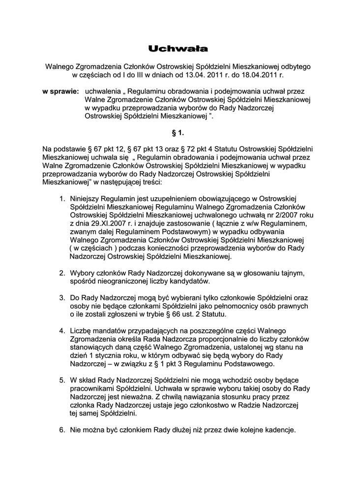 Uchwała Walnego Zgromadzenia Członków Ostrowskiej Spółdzielni Mieszkaniowej odbytego w częściach od I do III w dniach od 13.04. 2011 r. do 18.04.2011 r. w sprawie: uchwalenia „ Regulaminu obradowania i podejmowania uchwał przez Walne Zgromadzenie Członków Ostrowskiej Spółdzielni Mieszkaniowej w wypadku przeprowadzania wyborów do Rady Nadzorczej Ostrowskiej Spółdzielni Mieszkaniowej ”. § 1. Na podstawie § 67 pkt 12, § 67 pkt 13 oraz § 72 pkt 4 Statutu Ostrowskiej Spółdzielni Mieszkaniowej uchwala się „ Regulamin obradowania i podejmowania uchwał przez Walne Zgromadzenie Członków Ostrowskiej Spółdzielni Mieszkaniowej w wypadku przeprowadzania wyborów do Rady Nadzorczej Ostrowskiej Spółdzielni Mieszkaniowej” w następującej treści: 1. Niniejszy Regulamin jest uzupełnieniem obowiązującego w Ostrowskiej Spółdzielni Mieszkaniowej Regulaminu Walnego Zgromadzenia Członków Ostrowskiej Spółdzielni Mieszkaniowej uchwalonego uchwałą nr 2/2007 roku z dnia 29.XI.2007 r. i znajduje zastosowanie ( łącznie z w/w Regulaminem, zwanym dalej Regulaminem Podstawowym) w wypadku odbywania Walnego Zgromadzenia Członków Ostrowskiej Spółdzielni Mieszkaniowej ( w częściach ) podczas konieczności przeprowadzenia wyborów do Rady Nadzorczej Ostrowskiej Spółdzielni Mieszkaniowej. 2. Wybory członków Rady Nadzorczej dokonywane są w głosowaniu tajnym, spośród nieograniczonej liczby kandydatów. 3. Do Rady Nadzorczej mogą być wybierani tylko członkowie Spółdzielni oraz osoby nie będące członkami Spółdzielni jako pełnomocnicy osób prawnych o ile zostali zgłoszeni w trybie § 66 ust. 2 Statutu. 4. Liczbę mandatów przypadających na poszczególne części W alnego Zgromadzenia określa Rada Nadzorcza proporcjonalnie do liczby członków stanowiących daną część Walnego Zgromadzenia, ustalonej wg stanu na dzień 1 stycznia roku, w którym odbywać się będą wybory do Rady Nadzorczej – w związku z § 1 pkt 3 Regulaminu Podstawowego. 5. W skład Rady Nadzorczej Spółdzielni nie mogą wchodzić osoby będące pracownikami Spółdzielni. Uchwała w sprawie wyboru takiej osoby do Rady Nadzorczej jest niewaŜna. Z chwilą nawiązania stosunku pracy przez członka Rady Nadzorczej ustaje jego członkostwo w Radzie Nadzorczej tej samej Spółdzielni. 6. Nie moŜna być członkiem Rady dłuŜej niŜ przez dwie kolejne kadencje. 7. Kandydatów do Rady Nadzorczej zgłaszają członkowie Spółdzielni, którzy otrzymują zawiadomienie ( w trybie określonym § 69 Statutu ) z informacją o moŜliwości zgłaszania do Zarządu Spółdzielni kandydatów na członków Rady w terminie 15 dni przed dniem posiedzenia pierwszej części Walnego Zgromadzenia. Zgłoszenie kandydatów na członków Rady Nadzorczej odbywa się pisemnie z podaniem imienia i nazwiska kandydata oraz imienia i nazwiska zgłaszającego. Do zgłoszenia zgłaszający zobowiązany jest dołączyć pisemne oświadczenie zgłaszanego o zgodzie na kandydowanie, opatrzone czytelnym podpisem imieniem i nazwiskiem zgłaszanego. Brak zgody w takiej formie powoduje nie umieszczenie kandydata na liście. Brak czytelnego podpisu imieniem i nazwiskiem zgłaszającego kandydata do Rady równieŜ powoduje nie umieszczenie kandydata na liście. 8. Zarząd sporządza listę prawidłowo zgłoszonych kandydatów na członków Rady Nadzorczej, którzy wyrazili zgodę na kandydowanie. Kandydatów umieszcza się na liście w kolejności alfabetycznej. Lista ta poddawana jest pod głosowanie na kaŜdej części W alnego Zgromadzenia. 9. Kandydaci na członków Rady Nadzorczej, oprócz zgody na kandydowanie, o której mowa powyŜej składają równieŜ pisemne oświadczenie (* według formularza ) podpisane imieniem i nazwiskiem zawierające dane dotyczące : • zatrudnienia w Ostrowskiej Spółdzielni Mieszkaniowej, • prowadzenia działalności konkurencyjnej wobec Ostrowskiej Spółdzielni Mieszkaniowej, • pozostawania w sporze sądowym z Ostrowską Spółdzielnią Mieszkaniową osobiście lub jako pełnomocnik strony przeciwnej, • zalegania z opłatami na rzecz Ostrowskiej Spółdzielni Mieszkaniowej, • przebyte kursy i szkolenia w zakresu funkcjonowania spółdzielczości mieszkaniowej – rok i miejsce, • zatrudnienia w podmiocie prowadzącym działalność konkurencyjną wobec Ostrowskiej Spółdzielni Mieszkaniowej bądź pozostawania członkiem organów takiego podmiotu, • oświadczenia o niekaralności. 10. Oświadczenie takie powinno być złoŜone Zarządowi Spółdzielni co najmniej na trzy dni robocze przed pierwszą częścią Walnego Zgromadzenia. Nie złoŜenie oświadczenia w tym terminie bądź złoŜenie oświadczenia dotkniętego brakami formalnymi ( brak czytelnego podpisu, brak oświadczenia w którymkolwiek z zakresów wskazanych w pkt. 9, niejasność bądź niejednoznaczność odpowiedzi w tym zakresie lub złoŜenie oświadczenia nieprawdziwego choćby w części) skutkuje nie umieszczeniem na liście kandydatów. 11. Członkowie Komisji Mandatowej bądź W yborczo-Skrutacyjnej nie mogą kandydować do Rady Nadzorczej. 12. Wybory członków Rady Nadzorczej przeprowadza się przy pomocy kart wyborczych, oznakowanych oryginałem pieczęci Spółdzielni, zawierający listę kandydatów, o której mowa powyŜej. 13. Głosowanie odbywa się przez złoŜenie kart wyborczych przez uprawnionych według listy obecności do urny w obecności Komisji Mandatowej, składającej się z dwóch członków i przewodniczącego, wybieranej na kaŜdej poszczególnej części Walnego Zgromadzenia. Do zadań tej Komisji naleŜy nadzór nad prawidłowością składania do urny, oryginalnością i ilością kart wyborczych, wręczenie kart uprawnionym, przekazanie urny ze złoŜonymi głosami na danej części W alnego Zgromadzenia osobie zaufania publicznego jaką jest niezaleŜny Notariusz, odebranie urny z dotychczas oddanymi głosami na poprzednich częściach W alnego Zgromadzenia od N