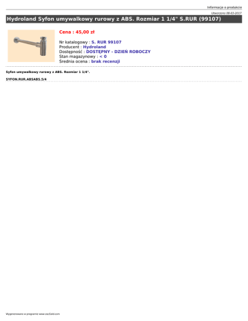 Informacje o produkcie Utworzono 08-03-2017 Hydroland Syfon umywalkowy rurowy z ABS. Rozmiar 1 1/4" S.RUR (99107) Cena : 45,00 zł Nr katalogowy : S. RUR 99107 Producent : Hydroland Dostępność : DOSTĘPNY - DZIEŃ ROBOCZY Stan magazynowy : < 0 Średnia ocena : brak recenzji Syfon umywalkowy rurowy z ABS. Rozmiar 1 1/4". SYFON.RUR.ABSABS.5/4 Wygenerowano w programie www.oscGold.com