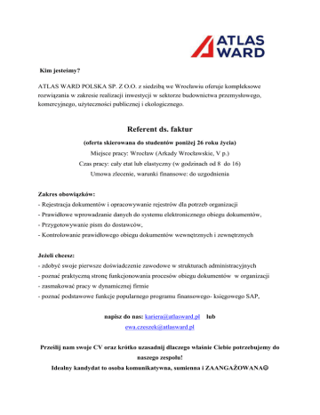 Kim jesteśmy? ATLAS WARD POLSKA SP. Z O.O. z siedzibą we Wrocławiu oferuje kompleksowe rozwiązania w zakresie realizacji inwestycji w sektorze budownictwa przemysłowego, komercyjnego, użyteczności publicznej i ekologicznego. Referent ds. faktur (oferta skierowana do studentów poniżej 26 roku życia) Miejsce pracy: Wrocław (Arkady Wrocławskie, V p.) Czas pracy: cały etat lub elastyczny (w godzinach od 8 do 16) Umowa zlecenie, warunki finansowe: do uzgodnienia Zakres obowiązków: - Rejestracja dokumentów i opracowywanie rejestrów dla potrzeb organizacji - Prawidłowe wprowadzanie danych do systemu elektronicznego obiegu dokumentów, - Przygotowywanie pism do dostawców, - Kontrolowanie prawidłowego obiegu dokumentów wewnętrznych i zewnętrznych Jeżeli chcesz: - zdobyć swoje pierwsze doświadczenie zawodowe w strukturach administracyjnych - poznać praktyczną stronę funkcjonowania procesów obiegu dokumentów w organizacji - zasmakować pracy w dynamicznej firmie - poznać podstawowe funkcje popularnego programu finansowego- księgowego SAP, napisz do nas: [email protected] lub [email protected] Prześlij nam swoje CV oraz krótko uzasadnij dlaczego właśnie Ciebie potrzebujemy do naszego zespołu! Idealny kandydat to osoba komunikatywna, sumienna i ZAANGAŻOWANA