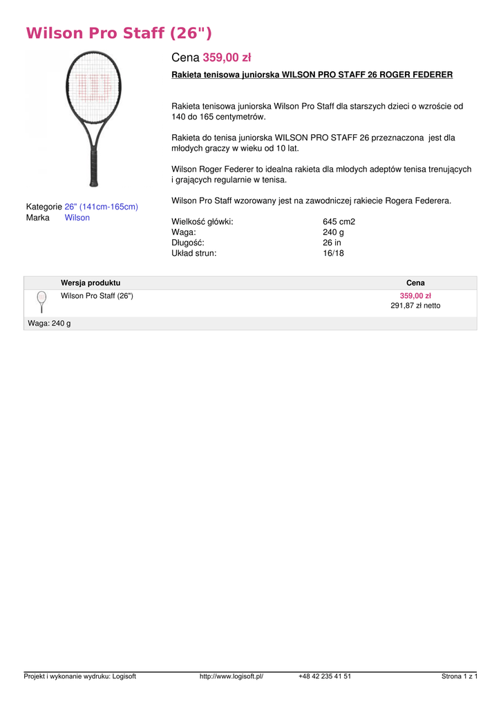 Wilson Pro Staff (26") Cena 359,00 zł Rakieta tenisowa juniorska WILSON PRO STAFF 26 ROGER FEDERER Rakieta tenisowa juniorska Wilson Pro Staff dla starszych dzieci o wzroście od 140 do 165 centymetrów. Rakieta do tenisa juniorska WILSON PRO STAFF 26 przeznaczona jest dla młodych graczy w wieku od 10 lat. Wilson Roger Federer to idealna rakieta dla młodych adeptów tenisa trenujących i grających regularnie w tenisa. Kategorie 26" (141cm-165cm) Marka Wilson Wilson Pro Staff wzorowany jest na zawodniczej rakiecie Rogera Federera. Wielkość główki: Waga: Długość: Układ strun: 645 cm2 240 g 26 in 16/18 Wersja produktu Cena Wilson Pro Staff (26") 359,00 zł 291,87 zł netto Waga: 240 g Projekt i wykonanie wydruku: Logisoft Powered by TCPDF (www.tcpdf.org) http://www.logisoft.pl/ +48 42 235 41 51 Strona 1 z 1