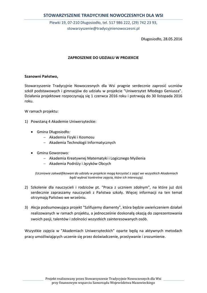 STOWARZYSZENIE TRADYCYJNIE NOWOCZESNYCH DLA WSI Plewki 19, 07-210 Długosiodło, tel. 517 986 222, (29) 742 23 93, [email protected] Długosiodło, 28.05.2016 ZAPROSZENIE DO UDZIAŁU W PROJEKCIE Szanowni Państwo, Stowarzyszenie Tradycyjnie Nowoczesnych dla Wsi pragnie serdecznie zaprosić uczniów szkół podstawowych i gimnazjów do udziału w projekcie "Uniwersytet Młodego Geniusza". Działania projektowe rozpoczynają się 1 czerwca 2016 roku i potrwają do 30 listopada 2016 roku. W ramach projektu: 1) Powstaną 4 Akademie Uniwersyteckie: Gmina Długosiodło: Akademia Fizyki i Kosmosu Akademia Technologii Informatycznych Gmina Goworowo: Akademia Kreatywnej Matematyki i Logicznego Myślenia Akademia Podróży i Języków Obcych (Uczniowie zakwalifikowani do udziału w projekcie mogą korzystać z zajęć we wszystkich Akademiach bądź wybrać konkretne zajęcia, które ich interesują). 2) Szkolenie dla nauczycieli i rodziców pt. "Praca z uczniem zdolnym", na które już dziś serdecznie zapraszamy nauczycieli z Państwa szkoły. Więcej informacji na ten temat otrzymają Państwo we wrześniu. 3) Akcja podsumowująca projekt "Szlifujemy diamenty", która będzie uwieńczeniem działań realizowanych w ramach projektu, a jednocześnie doskonałą okazją do zaprezentowania swoich pasji, talentów i zdolności wszystkich zainteresowanych osób. Wszystkie zajęcia w "Akademiach Uniwersyteckich" oparte będą na aktywnych metodach pracy umożliwiających uczenie się przez doświadczenie, przeżywanie i zrozumienie. Projekt realizowany przez Stowarzyszenie Tradycyjnie Nowoczesnych dla Wsi przy finansowym wsparciu Samorządu Województwa Mazowieckiego STOWARZYSZENIE TRADYCYJNIE NOWOCZESNYCH DLA WSI Plewki 19, 07-210 Długosiodło, tel. 517 986 222, (29) 742 23 93, [email protected] Kryteria doboru uczestników projektu: Proces rekrutacji przeprowadzi zespół ds. realizacji projektu zgodnie z regulaminem rekrutacji, który przewiduje: uczestnikami projektu mogą być uczniowie szkół podstawowych i gimnazjalnych Gmin: Długosiodło (powiat wyszkowski, województwo mazowieckie) i Goworowo (powiat ostrołęcki, województwo mazowieckie); w przypadku zgłoszenia większej niż zakładana liczby uczestników, pierwszeństwo udziału w projekcie będą mieli uczniowie osiągający w szkole wysokie wyniki z przedmiotów ścisłych, technologii informatycznych oraz języków obcych, a także uczniowie zdobywający wysokie miejsca w olimpiadach i zawodach gminnych, powiatowych, wojewódzkich i ogólnopolskich z podanych powyżej dziedzin. Prosimy Państwa o udostępnienie informacji o projekcie uczniom i rodzicom Państwa szkoły. Z uwagi na ograniczoną ilość miejsc, do projektu zakwalifikowane zostaną te osoby, które pomyślnie przejdą proces rekrutacji. Zgłoszenia do udziału w projekcie przyjmuje koordynator - Anita Skibińska tel. 605249314, [email protected] Projekt realizowany przez Stowarzyszenie Tradycyjnie Nowoczesnych dla Wsi przy finansowym wsparciu Samorządu Województwa Mazowieckiego