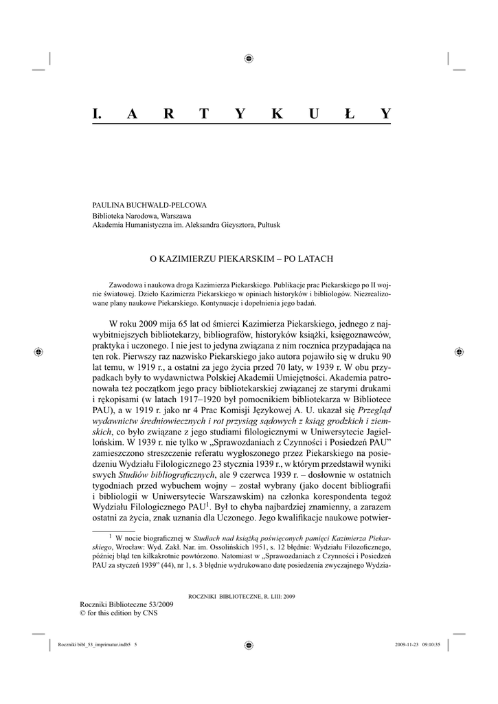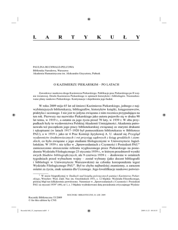 I. A R T Y K U Ł Y PAULINA BUCHWALD-PELCOWA Biblioteka Narodowa, Warszawa Akademia Humanistyczna im. Aleksandra Gieysztora, Pułtusk O KAZIMIERZU PIEKARSKIM – PO LATACH Zawodowa i naukowa droga Kazimierza Piekarskiego. Publikacje prac Piekarskiego po II wojnie światowej. Dzieło Kazimierza Piekarskiego w opiniach historyków i bibliologów. Niezrealizowane plany naukowe Piekarskiego. Kontynuacje i dopełnienia jego badań. W roku 2009 mija 65 lat od śmierci Kazimierza Piekarskiego, jednego z najwybitniejszych bibliotekarzy, bibliografów, historyków książki, księgoznawców, praktyka i uczonego. I nie jest to jedyna związana z nim rocznica przypadająca na ten rok. Pierwszy raz nazwisko Piekarskiego jako autora pojawiło się w druku 90 lat temu, w 1919 r., a ostatni za jego życia przed 70 laty, w 1939 r. W obu przypadkach były to wydawnictwa Polskiej Akademii Umiejętności. Akademia patronowała też początkom jego pracy bibliotekarskiej związanej ze starymi drukami i rękopisami (w latach 1917–1920 był pomocnikiem bibliotekarza w Bibliotece PAU), a w 1919 r. jako nr 4 Prac Komisji Językowej A. U. ukazał się Przegląd wydawnictw średniowiecznych i rot przysiąg sądowych z ksiąg grodzkich i ziemskich, co było związane z jego studiami filologicznymi w Uniwersytecie Jagiellońskim. W 1939 r. nie tylko w „Sprawozdaniach z Czynności i Posiedzeń PAU” zamieszczono streszczenie referatu wygłoszonego przez Piekarskiego na posiedzeniu Wydziału Filologicznego 23 stycznia 1939 r., w którym przedstawił wyniki swych Studiów bibliograficznych, ale 9 czerwca 1939 r. – dosłownie w ostatnich tygodniach przed wybuchem wojny – został wybrany (jako docent bibliografii i bibliologii w Uniwersytecie Warszawskim) na członka korespondenta tegoż Wydziału Filologicznego PAU1. Był to chyba najbardziej znamienny, a zarazem ostatni za życia, znak uznania dla Uczonego. Jego kwalifikacje naukowe potwier1 W nocie biograficznej w Studiach nad książką poświęconych pamięci Kazimierza Piekarskiego, Wrocław: Wyd. Zakł. Nar. im. Ossolińskich 1951, s. 12 błędnie: Wydziału Filozoficznego, później błąd ten kilkakrotnie powtórzono. Natomiast w „Sprawozdaniach z Czynności i Posiedzeń PAU za styczeń 1939” (44), nr 1, s. 3 błędnie wydrukowano datę posiedzenia zwyczajnego Wydzia- Roczniki Biblioteczne 53/2009 © for this edition by CNS Roczniki bibl_53_imprimatur.indb5 5 ROCZNIKI BIBLIOTECZNE, R. LIII: 2009 2009-11-23 09:10:35 6 PAULINA BUCHWALD-PELCOWA dzono w przewodzie habilitacyjnym nieco wcześniej, w 1937 r. w Uniwersytecie Warszawskim2. Nie przestał jednak Piekarski być bibliotekarzem, nadal pracował w Bibliotece Narodowej w Warszawie (kolejnej bibliotece po bibliotekach PAU, Ossolineum, Jagiellońskiej, a nawet krótko – jako „siła przejściowa”3 w Kórniku). W Warszawie od 1 stycznia 1931 r. kierował stworzonym przez siebie Działem Starych Druków, pierwszą tak zorganizowaną placówką w Polsce, a pod koniec lat trzydziestych również Centralnym Katalogiem Druków XVI–XVIII wieku umiejscowionym w strukturze Instytutu Bibliograficznego BN4. Jak pisze Alodia Kawecka-Gryczowa, najbliższa jego współpracowniczka i autorka wielu prac o nim, „zajęć docenckich nie zdołał rozpocząć, przygotowując wykłady na rok akademicki 1939/1940”5. Ale za to rok 1939 powitał Piekarski już jako bibliotekarz Biblioteki Narodowej, a nie prowizoryczny6 tam bibliotekarz. Był nim przez tyle lat, od 1931 r.! Mianowany bibliotekarzem został bowiem 1 grudnia 1938 r. jako docent dr fil[ozofii] – choć z dotychczasowym uposażeniem (VI grupy)… Wspomniane tu kilkakrotnie daty – 1919 i 1939 – są znamienne, wręcz symboliczne. Przecież rok 1919 był pierwszym po odzyskaniu niepodległości, a 1939 łu Filologicznego, na którym docent Kazimierz Piekarski przedstawił swe studia bibliograficzne – 23 stycznia 1938 zamiast 23 stycznia 1939. 2 Cała procedura trwała od 18 stycznia 1937 (złożenie podania) do 19 lipca 1937 (zatwierdzenie przez Ministerstwo Wyznań Religijnych i Oświaty uchwały udzielającej „prawa wykładania z zakresu bibliografii i bibliologii”). Sam wykład – tak jak przy wszystkich innych habilitantach, nie podano jego tematu – odbył się 8 czerwca 1937 r. Znamienne, iż jako jedyny spośród kandydatów starających się o „veniam legendi” z tego i z następnego roku zwolniony był Piekarski z dyskusji habilitacyjnej (w Sprawozdaniu za… 1937–8 wyraźnie nazywanej kolokwium habilitacyjnym). Por. Sprawozdanie z działalności Wydziału Humanistycznego Uniwersytetu J. Piłsudskiego za rok akademicki 1936–1937, Warszawa 1938, s. 27 (za zwrócenie uwagi na to Sprawozdanie… dziękuję dr. A. Nowakowi i dr. A. Skrzypczakowi). 3 Tak Piekarskiego katalogującego druki XVI w. w Bibliotece Kórnickiej, autora Katalogu Biblioteki Kórnickiej. T. 1. Polonica (Kórnik: Biblioteka Kórnicka 1929) określił Józef Grycz, kierujący wówczas tą instytucją, w sprawozdaniu Biblioteka Kórnicka w latach 1926–1929 zamieszczonym w „Przeglądzie Bibliotecznym” (4) 1930, z. 3, s. 381. 4 Sprawozdanie Biblioteki Narodowej im. Józefa Piłsudskiego, I. 1937–1938, Warszawa 1938, s. 44. 5 Alodia KAWECKA-GRYCZOWA, Radość i tragizm w życiu Kazimierza Piekarskiego, [w:] Twórcy nowoczesnego bibliotekarstwa polskiego, Wrocław: Wyd. Zakł. Nar. im. Ossolińskich 1974, s. 252–253. Na podstawie tego świadectwa Gryczowej trzeba sprostować informację podaną przez S. Starnawskiego w biogramie Piekarskiego w Słowniku badaczy literatury polskiej. Pod red. Stefana STARNAWSKIEGO, t. 9, Łódź: Łódzkie Towarzystwo Naukowe 2007, s. 128 o prowadzeniu przez Piekarskiego docenckich wykładów z bibliologii w latach 1937–1939. Nb. Gryczowa ujawniła tematy przygotowywanych przez Piekarskiego wykładów, por. A. KAWECKA-GRYCZOWA, Dzieło Kazimierza Piekarskiego, [w:] Studia nad książką…, s. 54. 6 W składzie osobowym