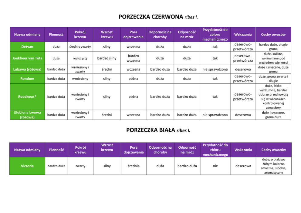 PORZECZKA CZERWONA ribes l. Nazwa odmiany Plenność Pokrój krzewu Wzrost krzewu Pora dojrzewania Odporność na choroby Odporność na mróz Przydatność do zbioru mechanicznego Wskazania Cechy owoców Detvan duża średnio zwarty silny wczesna duża duża tak deserowoprzetwórcza Jonkheer van Tets duża rozłożysty bardzo silny bardzo wczesna duża duża tak deserowoprzetwórcza Lubawa (różowa) bardzo duża wzniesiony i zwarty średni wczesna bardzo duża bardzo duża nie sprawdzona deserowa Rondom bardzo duża wzniesiony silny póżna duża duża tak deserowoprzetwórcza Roodneus® bardzo duża wzniesiony i zwarty silny późna bardzo duża bardzo duża tak deserowoprzetwórcza Ulubiena Lwowa (różowa) bardzo duża wzniesiony i zwarty średni wczesna bardzo duża bardzo duża nie sprawdzona deserowa bardzo duże, długie grona duże, kuliste, wyrównane pod względem wielkości duże i smaczne, duże grona duże, grona zwarte i długie duże, lekko wydłużone, bardzo dobrze przechowują się w warunkach kontrolowanej atmosfery duże i smaczne, grona duże Przydatność do zbioru mechanicznego Wskazania Cechy owoców deserowa duże, o białawo żółtym kolorze, smaczne, słodkie, aromatyczne PORZECZKA BIAŁA ribes l. Nazwa odmiany Victoria Plenność bardzo duża Pokrój krzewu zwarty Wzrost krzewu silny Pora dojrzewania średnia Odporność na choroby duża Odporność na mróz bardzo duża nie