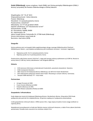 Hude (Oldenburg), nazwa urzędowa Hude (Oldb), jest Gminą pomiędzy Oldenburgiem (Oldb.) i Bremą i przynależy do Powiatu Oldenburskiego w Dolnej Saksonii. Współrzędne: 53° 7 N, 8° 28 O Województwo/Land : Dolna Saksonia Powiat: Oldenburg Wysokość: 5 m powyżej poziomu morza Powierzchnia: 124,64 km² Mieszkańcy: 15.777 (31 grudzień 2010) Gęstość zaludnienia: 127 mieszkanców na km² Kod pocztowy: 27798 Nr. kierunkowy: 04408, 04484 Nr. rejestracyjny: OL Adres Urzędu Gminy: Parkstraße 53, 27798 Hude (Oldenburg) Strona internetowa: www.hude.de Burmistrz: Axel Jahnz (SPD) Geografia Gmina położona jest na krawędzi lekko pagórkowatego okręgu zwanego Wildeshauskimi Piachami (Wildeshauser Geest) , a jej krajobraz przepleciony jest mnóstwem strumieni i terenami bagnistymi. • • Najwyższy punkt: 31,5 m powyżej poziomu morza Najniższy punkt: 0,2 m poniżej poziomu morza Powierzchnia całej Gminy wynosi 124,6 km², z tego pod uprawę rolniczą użytkowane są 9.290 ha. Reszta to tereny leśne (1.146 ha), tereny zabudowane i sieć drogowa (898 ha). Historia • • • • • 1232 pierwsza informacja w kalendarzach Cysterskich, powstanie /powołanie klasztoru 1536 rozwiązanie klasztoru 1867 otwarcie linii kolejowej Brema–Oldenburg i od 1873 linii Hude–Nordenham 1972 dobrowolne połączenie dwóch Gmin Hude i Wuesting w ramach reformy terenowej Sierpień 2009 obchody 777 – lecia Hude. Partnerstwa • • • • Arnage (Francja) od 1983 Fiume Veneto (Włochy) od 2002 Kröpelin (Niemcy) od 1991 Nowe Miasto Lubawskie (Polska) od 2003 Gospodarka i infrastruktura Hude objęte jest siecią linii kolejowej Oldenburg–Brema i Nordenham–Brema. Od grudnia 2010 Hude podłączone jest pod sieć lini miejskiej Bremy. W gminie znajdują sie 3 połączenia autostradowe. Liczba gospodarstw rolniczych (dane z 1995) wynosi 323, z tego więcej niż jedna trzecia osiąga wielkość co najmniej 30 ha. Największymi pracodawcami w Hude jest fabryka maszyn rolniczych Amazone, a także Firma Labom (technika pomiarowa). Ponadto duże znaczenie ma mnóstwo małych Firm.