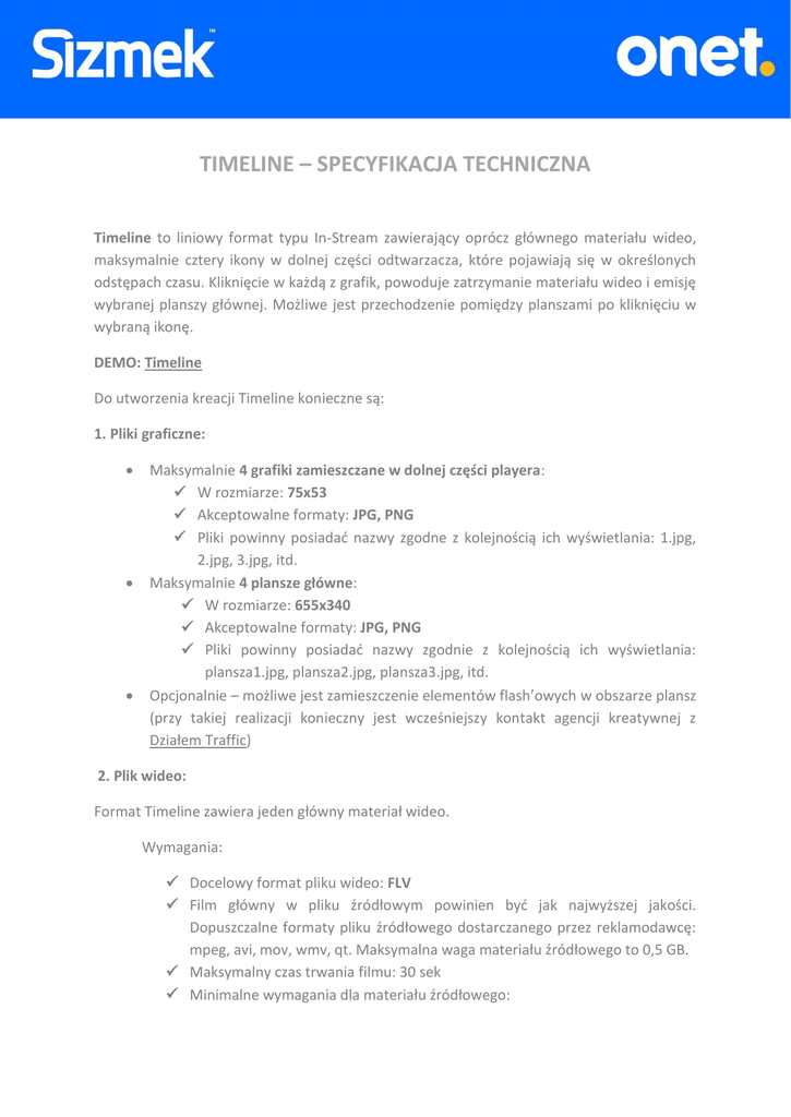 TIMELINE – SPECYFIKACJA TECHNICZNA Timeline to liniowy format typu In-Stream zawierający oprócz głównego materiału wideo, maksymalnie cztery ikony w dolnej części odtwarzacza, które pojawiają się w określonych odstępach czasu. Kliknięcie w każdą z grafik, powoduje zatrzymanie materiału wideo i emisję wybranej planszy głównej. Możliwe jest przechodzenie pomiędzy planszami po kliknięciu w wybraną ikonę. DEMO: Timeline Do utworzenia kreacji Timeline konieczne są: 1. Pliki graficzne: Maksymalnie 4 grafiki zamieszczane w dolnej części playera: W rozmiarze: 75x53 Akceptowalne formaty: JPG, PNG Pliki powinny posiadać nazwy zgodne z kolejnością ich wyświetlania: 1.jpg, 2.jpg, 3.jpg, itd. Maksymalnie 4 plansze główne: W rozmiarze: 655x340 Akceptowalne formaty: JPG, PNG Pliki powinny posiadać nazwy zgodnie z kolejnością ich wyświetlania: plansza1.jpg, plansza2.jpg, plansza3.jpg, itd. Opcjonalnie – możliwe jest zamieszczenie elementów flash’owych w obszarze plansz (przy takiej realizacji konieczny jest wcześniejszy kontakt agencji kreatywnej z Działem Traffic) 2. Plik wideo: Format Timeline zawiera jeden główny materiał wideo. Wymagania: Docelowy format pliku wideo: FLV Film główny w pliku źródłowym powinien być jak najwyższej jakości. Dopuszczalne formaty pliku źródłowego dostarczanego przez reklamodawcę: mpeg, avi, mov, wmv, qt. Maksymalna waga materiału źródłowego to 0,5 GB. Maksymalny czas trwania filmu: 30 sek Minimalne wymagania dla materiału źródłowego: - Rozdzielczość: 1024x576 - Poziom dźwięku nominalny: -18 dBfs, poziom maksymalny: -6 dBfs - Bitrate sumaryczny: ~6 mbps - Liczba klatek na sekundę: 25 Preferowane proporcje szerokość/wysokość obszaru filmu: 16 do 9. Film główny w pliku źródłowym może być przesłany na FTP Onetu: - Nazwa hosta: pftp.onet.pl - Użytkownik i hasło będzie przesłane przez biuro reklamy. - Film główny w pliku źródłowym może być również umieszczony na FTP klienta. Wymagane jest wówczas podanie odpowiednich dostępów przez klienta. 3. Adresy stron docelowych: Każda z czterech plansz głównych po kliknięciu może kierować na inny adres URL. Dodatkowe informacje: Maksymalna waga wszystkich plików, oprócz pliku źródłowego wideo: 10 MB Wszystkie elementy kreacji muszą zostać dostarczone na 5 dni roboczych przed startem kampanii.