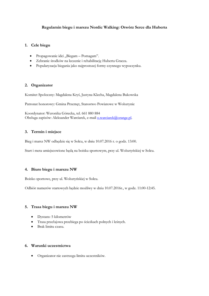 Regulamin biegu i marszu Nordic Walking: Otwórz Serce dla Huberta 1. Cele biegu Propagowanie idei „Biegam – Pomagam”. Zebranie środków na leczenie i rehabilitację Huberta Gracza. Popularyzacja biegania jako najprostszej formy czynnego wypoczynku. 2. Organizator Komitet Społeczny: Magdalena Kryś, Justyna Klecha, Magdalena Bukowska Patronat honorowy: Gmina Przemęt, Starostwo Powiatowe w Wolsztynie Koordynator: Weronika Górecka, tel. 661 880 884 Obsługa zapisów: Aleksander Warciarek, e-mail [email protected]. 3. Termin i miejsce Bieg i marsz NW odbędzie się w Solcu, w dniu 10.07.2016 r. o godz. 13:00. Start i meta umiejscowione będą na boisku sportowym, przy ul. Wolsztyńskiej w Solcu. 4. Biuro biegu i marszu NW Boisko sportowe, przy ul. Wolsztyńskiej w Solcu. Odbiór numerów startowych będzie możliwy w dniu 10.07.2016r., w godz. 11:00-12:45. 5. Trasa biegu i marszu NW Dystans: 5 kilometrów Trasa przełajowa przebiega po ścieżkach polnych i leśnych. Brak limitu czasu. 6. Warunki uczestnictwa Organizator nie zastrzega limitu uczestników. W celu weryfikacji, każdy zawodnik musi zgłosić się osobiście w dniu zawodów, w Biurze biegu i marszu NW, w godz. 11:00-12:45 oraz posiadać dokument tożsamości (dowód osobisty lub paszport). W biegu i marszu NW mogą wziąć udział zawodnicy, którzy do dnia imprezy ukończą 16 rok życia, dokonają zgłoszenia i uiszczą opłatę startową przelewem do dnia 08.07.2016r. (decyduje data wpływu na rachunek) lub w dniu zawodów, w biurze biegu i marszu NW. Zawodnicy niepełnoletni muszą posiadać zgodę opiekunów prawnych na uczestnictwo w biegu i marszu NW. Każdy zawodnik startuje wyłącznie na własną odpowiedzialność, co potwierdza złożeniem podpisu pod oświadczeniem o zdolności do udziału w biegu. Każdy zawodnik wyraża zgodę na przetwarzanie danych osobowych dla celów weryfikacji i umieszczenia w komunikacie końcowym, a także na wykorzystanie wizerunku uczestnika biegu i marszu NW dla potrzeb Organizatora. Każdy zawodnik ma obowiązek zapoznania się z Regulaminem i zobowiązany jest do jego przestrzegania. Pobranie numeru startowego jednoznaczne jest z akceptacją Regulaminu biegu i marszu NW. Podczas biegu i marszu NW wszyscy uczestnicy muszą posiadać numer startowy przymocowany do koszulki na wysokości klatki piersiowej. 7. Zgłoszenia do biegu i marszu NW. Zgłoszenia można dokonać elektronicznie do dnia 08.07.2016r. bezpośrednio na stronie http://online.datasport.pl/zapisy/portal/zawody.php?zawody=2421, a także w dniu zawodów, w biurze biegu i marszu NW. 8. Opłata startowa Opłata startowa wynosi 30zł, płata do dnia 08.07.2016r. (decyduje data wpływu), przelewem na rachunek: Magdalena Kryś nr rachunku: 77 1090 1607 0000 0001 1221 4837 (Bank Zachodni WBK) tytułem: opłata startowa, imię i nazwisko uczestnika oraz informacja „bieg” lub „nordic walking” Wpłacona opłata startowa nie podlega zwrotowi. Opłata może zostać wniesiona również w biurze zawodów, w dniu biegu i rajdu NW. W ramach opłaty startowej Uczestnicy otrzymają: - pamiątkowy medal, - numer startowy, - posiłek po biegu, - wodę - opiekę medyczną. 9. Pomiar czasu Pomiar czasu i ustalenia kolejności będą dokonywane elektronicznie wg czasów brutto. 10. Klasyfikacja i nagrody W biegu będzie prowadzona klasyfikacja generalna. Nagrody: Za miejsca I-III w klasyfikacji open: puchary. Każdy uczestnik, który ukończy bieg otrzymuje pamiątkowy medal. 11. Postanowienia końcowe Bieg i marsz NW odbędzie się bez względu na pogodę. Organizator zastrzega sobie prawo do wykorzystywania zdjęć, filmów, wypowiedzi uczestników do celów marketingowych. Ostateczne prawo interpretacji niniejszego regulaminu przysługuje organizatorom biegu i marszu NW.
