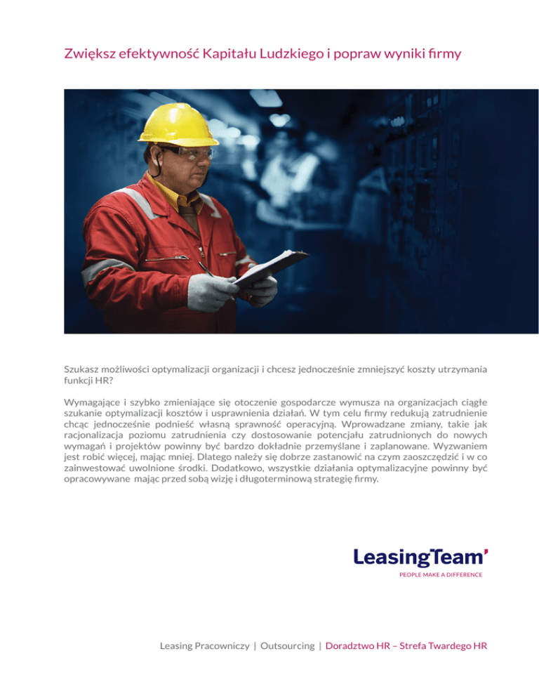 Zwiększ efektywność Kapitału Ludzkiego i popraw wyniki firmy Szukasz możliwości optymalizacji organizacji i chcesz jednocześnie zmniejszyć koszty utrzymania funkcji HR? Wymagające i szybko zmieniające się otoczenie gospodarcze wymusza na organizacjach ciągłe szukanie optymalizacji kosztów i usprawnienia działań. W tym celu firmy redukują zatrudnienie chcąc jednocześnie podnieść własną sprawność operacyjną. Wprowadzane zmiany, takie jak racjonalizacja poziomu zatrudnienia czy dostosowanie potencjału zatrudnionych do nowych wymagań i projektów powinny być bardzo dokładnie przemyślane i zaplanowane. Wyzwaniem jest robić więcej, mając mniej. Dlatego należy się dobrze zastanowić na czym zaoszczędzić i w co zainwestować uwolnione środki. Dodatkowo, wszystkie działania optymalizacyjne powinny być opracowywane mając przed sobą wizję i długoterminową strategię firmy. Leasing Pracowniczy | Outsourcing | Doradztwo HR – Strefa Twardego HR I. Optymalizacja Systemu Zarządzania Zasobami Ludzkimi Uczyń swoją firmę bardziej konkurencyjną wprowadzając nasze rozwiązania Zatrudnienie w każdym przedsiębiorstwie stanowi podstawowy, a zarazem jeden z najwyższych kosztów uzyskania przychodu. Dlatego wiele firm rozpoczyna procesy restrukturyzacji od zwolnień pracowniczych. Proces ten przeprowadzony bez wcześniejszej analizy i w niekontrolowany sposób powoduje negatywne skutki zarówno dla organizacji jak i dla pracowników. Straty przekładają się również na wizerunek firmy i postrzeganie jako pracodawcy. Pomagamy naszym Klientom osiągnąć wzrost przez optymalizację efektywności zatrudnienia, która dotyczy wszystkich obszarów organizacji. Nasze usługi łączą w sobie głęboką wiedzę branżową z doświadczeniem w zarządzaniu zasobami ludzkimi, optymalizacji zatrudnienia oraz outsourcingu. Wpływa to na znaczną poprawę efektywności i wyników osiąganych przez naszych Klientów. Optymalizacja nie zawsze musi się wiązać z wypowiedzeniami dla pracowników, musi jednak usprawniać działalność i obniżać koszty, dlatego naszym Klientom przedstawiamy różne jej sposoby. Korzyści dla organizacji: • Obniżenie kosztów dzięki: – dostosowaniu wielkości i formy zatrudnienia do aktualnych celów i potrzeb przedsiębiorstwa – wdrożeniu nowoczesnych rozwiązań istniejących na rynku pracy – eliminacja odpraw finansowych • Zwiększenie efektywności dzięki: – eliminacji wolnych roboczogodzin – ochronie przed destabilizacją zatrudnienia w przedsiębiorstwie – wzmocnieniu poczucia bezpieczeństwa i zaufania do pracodawcy osób pozostających w zatrudnieniu – minimalizacja spadku wydajności pracy pracowników w trakcie i po wprowadzeniu zmian – przeniesieniu odpowiedzialności i obciążenie z działu personalnego na firmę zewnętrzną – eliminacja spadku zaufania do wewnętrznego działu HR • Budowanie pozytywnego wizerunku w procesie restrukturyzacji dzięki: – pozytywnym rozstaniom pracodawcy i pracownika, które korzystnie wpływają na wizerunek pracodawcy i zmniejszają poczucie frustracji wśród osób zwolnionych – ograniczeniu do minimum kosztów psychologicznych i społecznych, jakie pociąga za sobą zmiana w organizacji 1. Optymalizacja Zatrudnienia: a. W obszarze zawartych umów pracowniczych b. W zależności od potrzeb pracodawcy, cyklu produkcyjnego, sezonowości 2. Outplacement i wsparcie w procesie restrukturyzacji Zmieniające się otoczenie gospodarcze wymusza zmianę strategii w przedsiębiorstwie, która pociąga za sobą znaczące procesy restrukturyzacji i towarzyszące im zwolnienia. Skala zmian często jest tak ogromna, że nie zawsze dostrzega się jej wszystkie aspekty. Niezmiernie ważne jest wsparcie pracowników narzędziami, które pomogą im odnaleźć się na rynku pracy. Tym bardziej, że zmiany często dotyczą osób, które zupełnie nie są na to przygotowane. Taka postawa organizacji świadczy o odpowiedzialności pracodawcy i pozytywnie wpływa na atmosferę wśród pozostałych pracowników. W zależności od tego do kogo program ma być skierowany (osoby indywidualne czy grupa pracowników) dobierzemy aktywności i formy wsparcia, które nie obciążą zbytnio budżetu organizacji, a będą efektywną formą pomocy. a. Outplacement Grupowy: W przypadku tej formy pomocy najczęściej skupiamy się na: • pomocy w przygotowaniu • • • • • • • i zredagowaniu profesjonalnych dokumentów aplikacyjnych przedstawieniu sytuacji dotyczącej aktualnego rynku pracy, możliwości zmiany zawodu oraz ocenie konkurencyjności uczestników programu na rynku pracy opracowaniu dokładnego planu dalszych działań i wsparciu w realizacji tych działań mobilizowaniu do aktywnego i szybkiego wejścia na rynek pracy dostarczeniu bieżącej i aktualnej informacji o dostępnych wakatach i projektach realizowanych bezpośrednio przez pracodawców, jaki i przez firmy doradztwa personalnego szkoleniu z autoprezentacji i przygotowaniu uczestników do rozmów kwalifikacyjnych z potencjalnymi pracodawcami wsparciu – dla zainteresowanych osób – w zakresie organizacji własnej działalności gospodarczej wsparciu psychologicznym ukierunkowanym zazwyczaj na uspokojenie negatywnych emocji związanych z utratą pracy oraz niepewnością związaną z przyszłością b. Outplacement Indywidualny: W przypadku tej formy pomocy najczęściej skupiamy się na: • doradztwie personalnym i zawodowym, w celu dokonania właściwej analizy możliwości zawodowych (bilans kompetencji, ocena predyspozycji i potencjału zawodowego) z wykorzystaniem odpowiednich narzędzi • pomocy w przygotowaniu i zredagowaniu profesjonalnych dokumentów aplikacyjnych • szybkiej aktywacji na rynku pracy • sztuce budowania networkingu poprzez naukę poszerzania profesjonalnych kontaktów • treningu umiejętności autoprezentacji i rozmowy kwalifikacyjnej • wsparciu psychologicznym ukierunkowanym