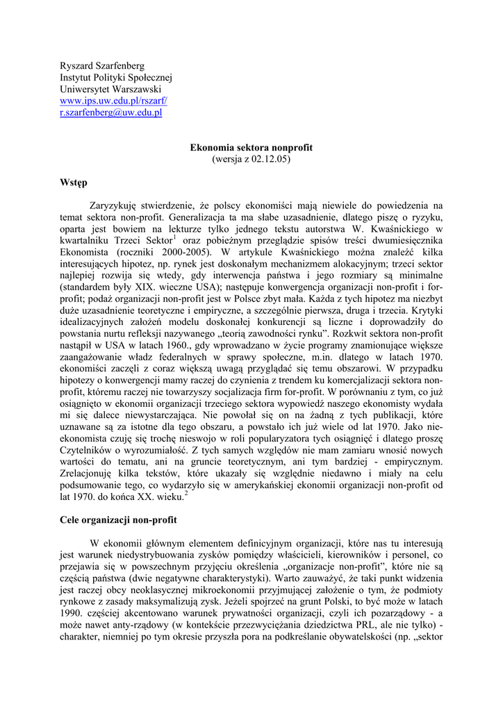 Ryszard Szarfenberg Instytut Polityki Społecznej Uniwersytet Warszawski www.ips.uw.edu.pl/rszarf/ [email protected] Ekonomia sektora nonprofit (wersja z 02.12.05) Wstęp Zaryzykuję stwierdzenie, że polscy ekonomiści mają niewiele do powiedzenia na temat sektora non-profit. Generalizacja ta ma słabe uzasadnienie, dlatego piszę o ryzyku, oparta jest bowiem na lekturze tylko jednego tekstu autorstwa W. Kwaśnickiego w kwartalniku Trzeci Sektor 1 oraz pobieżnym przeglądzie spisów treści dwumiesięcznika Ekonomista (roczniki 2000-2005). W artykule Kwaśnickiego można znaleźć kilka interesujących hipotez, np. rynek jest doskonałym mechanizmem alokacyjnym; trzeci sektor najlepiej rozwija się wtedy, gdy interwencja państwa i jego rozmiary są minimalne (standardem były XIX. wieczne USA); następuje konwergencja organizacji non-profit i forprofit; podaż organizacji non-profit jest w Polsce zbyt mała. Każda z tych hipotez ma niezbyt duże uzasadnienie teoretyczne i empiryczne, a szczególnie pierwsza, druga i trzecia. Krytyki idealizacyjnych założeń modelu doskonałej konkurencji są liczne i doprowadziły do powstania nurtu refleksji nazywanego „teorią zawodności rynku”. Rozkwit sektora non-profit nastąpił w USA w latach 1960., gdy wprowadzano w życie programy znamionujące większe zaangażowanie władz federalnych w sprawy społeczne, m.in. dlatego w latach 1970. ekonomiści zaczęli z coraz większą uwagą przyglądać się temu obszarowi. W przypadku hipotezy o konwergencji mamy raczej do czynienia z trendem ku komercjalizacji sektora nonprofit, któremu raczej nie towarzyszy socjalizacja firm for-profit. W porównaniu z tym, co już osiągnięto w ekonomii organizacji trzeciego sektora wypowiedź naszego ekonomisty wydała mi się dalece niewystarczająca. Nie powołał się on na żadną z tych publikacji, które uznawane są za istotne dla tego obszaru, a powstało ich już wiele od lat 1970. Jako nieekonomista czuję się trochę nieswojo w roli popularyzatora tych osiągnięć i dlatego proszę Czytelników o wyrozumiałość. Z tych samych względów nie mam zamiaru wnosić nowych wartości do tematu, ani na gruncie teoretycznym, ani tym bardziej - empirycznym. Zrelacjonuję kilka tekstów, które ukazały się względnie niedawno i miały na celu podsumowanie tego, co wydarzyło się w amerykańskiej ekonomii organizacji non-profit od lat 1970. do końca XX. wieku. 2 Cele organizacji non-profit W ekonomii głównym elementem definicyjnym organizacji, które nas tu interesują jest warunek niedystrybuowania zysków pomiędzy właścicieli, kierowników i personel, co przejawia się w powszechnym przyjęciu określenia „organizacje non-profit”, które nie są częścią państwa (dwie negatywne charakterystyki). Warto zauważyć, że taki punkt widzenia jest raczej obcy neoklasycznej mikroekonomii przyjmującej założenie o tym, że podmioty rynkowe z zasady maksymalizują zysk. Jeżeli spojrzeć na grunt Polski, to być może w latach 1990. częściej akcentowano warunek prywatności organizacji, czyli ich pozarządowy - a może nawet anty-rządowy (w kontekście przezwyciężania dziedzictwa PRL, ale nie tylko) charakter, niemniej po tym okresie przyszła pora na podkreślanie obywatelskości (np. „sektor obywatelski”), co raczej nie prowadzi ku analizom ekonomicznym i bardziej interesuje badaczy społeczeństwa obywatelskiego. Trzeba dodać, że od początku w analizach ekonomicznych dostrzegano różnicę między organizacjami non-profit bardziej polegającymi na donacjach (organizacje donacyjne) a tymi, które w większym stopniu utrzymują się z działalności gospodarczej (organizacje komercyjne, u nas nazywane często gospodarką społeczną). Pierwsza fala ekonomicznego teoretyzowania i badań w USA rozpoczęła się pod wpływem przyjęcia warunku non-profit i wynikającego z niego oczywistego pytania, nie w celu zysku, a więc po co? Już w latach 1960. G. Tullok zaproponował hipotezę, że głównym celem jest maksymalizacja budżetu organizacji, ponieważ daje to większy prestiż i „wyższą finansową kompensację” jej kierownikom. Wynika z niej m.in. to, że tak rozumiane organizacje dążyć powinny do maksymalizacji donacji brutto. Gdyby przyjąć hipotezę bardziej altruistyczną o celu maksymalizacji usług dla klientów, to konsekwencją powinno być raczej dążenie do zwiększania donacji netto, gdyż to ona decyduje o ilości i jakości dostarczanych usług. Tullock pisał głównie o organizacjach donacyjnych, ale niedługo po nim W. Niskanen rozszerzył ten punkt widzenia na organizacje komercyjne. Badania empiryczne w różnych sektorach non-profit wykazywały, że niektóre z nich są bardziej maksymalizatorami budżetu, a inne maksymalizatorami usług. Wyniki dotyczące USA wykazały, że tymi pierwszymi są organizacje działające w sektorze ochrony zdrowia, a do drugiej kategorii należą organizacje edukacyjne, socjalne i kulturalne. Z kolei w UK ustalono, że organizacje zajmujące się zdrowiem dążą do zwiększania usług, a budżet jest celem organizacji religijnych. W późniejszych założeniach dotyczących „funkcji celu” przyjmowano, że prestiż kierowników zależy zarówno od wielkości budżetu, jak i ilości usług, a także wzięto pod uwagę to, że są organizacje, których cele trudniej podporządkować pod taki binarny wymiar, np. promowanie preferencji dla dóbr, których konsumpcję uznaje się za pożądaną. Przyjmowano też, że przedmiotem maksymalizacji są niepieniężne dochody właścicieli organizacji. Większość tych podejść brała w nawias deklaracje misji i celów, których dostarczają same organizacje. Znaleźli się jednak również ekonomiści, którzy właśnie na tej podstawie próbowali określić „funkcję celu”, np. maksymalizacja dobra publicznego lub społecznego („bonoficing”), chociaż dotyczyło to szczególnie organizacji socjalnych pomagają