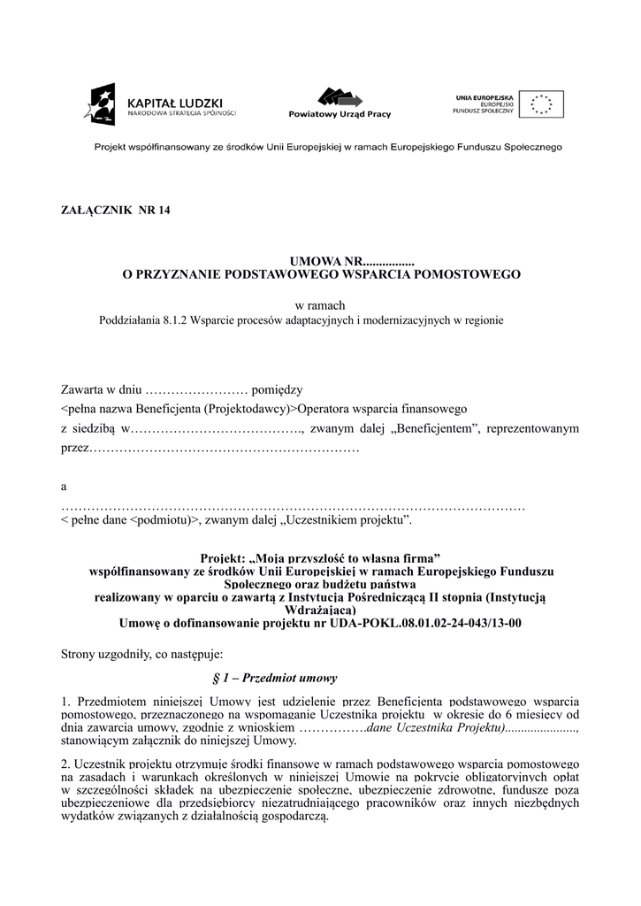ZAŁĄCZNIK NR 14 UMOWA NR................ O PRZYZNANIE PODSTAWOWEGO WSPARCIA POMOSTOWEGO w ramach Poddziałania 8.1.2 Wsparcie procesów adaptacyjnych i modernizacyjnych w regionie Zawarta w dniu …………………… pomiędzy <pełna nazwa Beneficjenta (Projektodawcy)>Operatora wsparcia finansowego z siedzibą w…………………………………., zwanym dalej „Beneficjentem”, reprezentowanym przez……………………………………………………… a ……………………………………………………………………………………………… < pełne dane <podmiotu)>, zwanym dalej „Uczestnikiem projektu”. Projekt: „Moja przyszłość to własna firma” współfinansowany ze środków Unii Europejskiej w ramach Europejskiego Funduszu Społecznego oraz budżetu państwa realizowany w oparciu o zawartą z Instytucją Pośredniczącą II stopnia (Instytucją Wdrażającą) Umowę o dofinansowanie projektu nr UDA-POKL.08.01.02-24-043/13-00 Strony uzgodniły, co następuje: § 1 – Przedmiot umowy 1. Przedmiotem niniejszej Umowy jest udzielenie przez Beneficjenta podstawowego wsparcia pomostowego, przeznaczonego na wspomaganie Uczestnika projektu w okresie do 6 miesięcy od dnia zawarcia umowy, zgodnie z wnioskiem …………….dane Uczestnika Projektu)......................, stanowiącym załącznik do niniejszej Umowy. 2. Uczestnik projektu otrzymuje środki finansowe w ramach podstawowego wsparcia pomostowego na zasadach i warunkach określonych w niniejszej Umowie na pokrycie obligatoryjnych opłat w szczególności składek na ubezpieczenie społeczne, ubezpieczenie zdrowotne, fundusze poza ubezpieczeniowe dla przedsiębiorcy niezatrudniającego pracowników oraz innych niezbędnych wydatków związanych z działalnością gospodarczą. 3. Uczestnik projektu przyjmuje podstawowe wsparcie pomostowe i zobowiązuje się do jego wykorzystania zgodnie z Wytycznymi w sprawie udzielania pomocy na rozwój przedsiębiorczości w ramach Poddziałania 8.1.2 Wsparcie procesów adaptacyjnych i modernizacyjnych w regionie Programu Operacyjnego Kapitał Ludzki w województwie śląskim oraz postanowieniami niniejszej umowy. § 2 – Okres udzielania wsparcia pomostowego 1. Podstawowe wsparcie pomostowe udzielane jest maksymalnie na okres 6 miesięcy, tj. od dnia ...................... do dnia.................. 2. W Umowie niniejszej nie przewidziano możliwości przedłużenia udzielania wsparcia pomostowego w ramach podstawowego wsparcia pomostowego ponad okres, o którym mowa w ust. 1. § 3 – Finansowanie podstawowego wsparcia pomostowego 1. Całkowita kwota przyznanej pomocy na podstawowe wsparcie pomostowe wynosi .............PLN (słownie: ....................... PLN), co stanowi równowartość …………EURO 2. Dotacja wypłacona zostanie w następujący sposób: - ilość rat - wysokość każdej z rat w PLN (słownie…..). Dotacja wypłacana będzie w okresie od dnia............do dnia.............................. 3. Beneficjent w dniu podpisania niniejszej Umowy zobowiązany jest wydać Uczestnikowi projektu (beneficjentowi pomocy) zaświadczenie o udzielonej pomocy de minimis, zgodnie z rozporządzeniem Rady Ministrów z dnia 20 marca 2007 r. w sprawie zaświadczeń o pomocy de minimis i pomocy de minimis w rolnictwie lub rybołówstwie (Dz. U. Nr 53, poz. 354, z późn. zm.). 4. Uczestnik projektu (beneficjent pomocy) zobowiązany jest przechowywać dokumentację związaną z otrzymaną pomocą przez okres 10 lat, licząc od dnia podpisania niniejszej Umowy udzielenia pomocy oraz udostępnianie tychże dokumentów, jak również stosownych informacji dotyczących udzielonej pomocy na żądanie uprawnionych podmiotów. 5. Wszystkie płatności będą dokonywane przez Beneficjenta w PLN na rachunek bankowy Beneficjenta Pomocy nr ………………………………………………. prowadzony w złotych polskich. § 4 – Postanowienia szczegółowe dotyczące wypłaty i wydatkowania podstawowego wsparcia pomostowego 1. Uczestnik projektu zobowiązuje się do wydatkowania wsparcia pomostowego, będącego przedmiotem Wniosku, o którym mowa w § 1 ust. 1, z najwyższym stopniem staranności oraz zgodnie z harmonogramem rzeczowo-finansowym oraz postanowieniami niniejszej Umowy. 2. Rozliczenie wydatków przewidzianych w harmonogramie rzeczowo-finansowym wydatków będących przedmiotem Wniosku, o którym mowa w § 1 ust. 1 nastąpi poprzez: złożenie oświadczenia o dokonaniu zakupów zgodnie z harmonogramem rzeczowo-finansowym oraz szczegółowe zestawienie zakupionych dóbr i usług ich wartości oraz parametrów. 3. Podstawowe wsparcie pomostowe zostanie wypłacone pod warunkiem uczestniczenia i ukończenia przez Uczestnika Projektu szkoleń lub/i doradztwa w ramach wsparcia doradczoszkoleniowego przed otrzymaniem wsparcia finansowego, realizowanego przez Beneficjenta w ramach Projektu, zgodnie z Indywidualnym Programem oraz rozpoczęcia prowadzenia działalności gospodarczej i wniesienia zabezpieczenia prawidłowej realizacji umowy. 4. Zabezpieczenie realizacji umowy wniesione zostanie w formie…………………………. 5. Warunkiem wypłaty środków o których mowa w § 3 niniejszej umowy jest wniesienie przez Uczestnika projektu zabezpieczenia, w terminie do...................... 6. Wypłata pierwszej raty nastąpi terminie 7 dni od dnia podpisania niniejszej Umowy. 7. W ramach podstawowego wsparcia pomostowego Uczestnik projektu sfinansuje wydatki w postaci niezbędnych opłat, o których mowa w § 1 ust. 2, ponoszonych w ramach prowadzonej działalności, niezależnie od poziomu przychodów. 8. W przypadku, gdy opóźnienie w przekazywaniu płatności wynika z przyczyn niezależnych od Beneficjenta, Uczestnik projektu nie przysługuje prawo domagania się odsetek za opóźnioną płatność. 9. W przypadku wystąpienia opóźnień w przekazywaniu płatności, o których mowa w ust. 8, przekraczających 14 dni kalendarzow