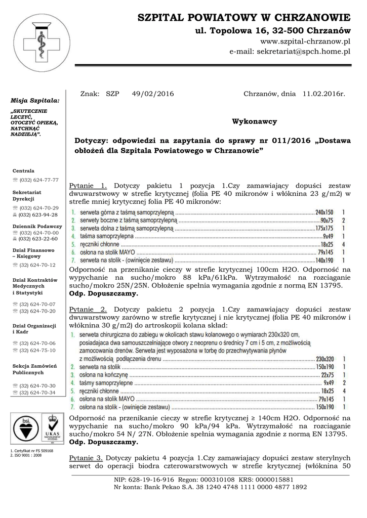 SZPITAL POWIATOWY W CHRZANOWIE ul. Topolowa 16, 32-500 Chrzanów www.szpital-chrzanow.pl e-mail: [email protected] Misja Szpitala: „SKUTECZNIE LECZYĆ, OTOCZYĆ OPIEKĄ, NATCHNĄĆ NADZIEJĄ”. Znak: SZP 49/02/2016 Chrzanów, dnia 11.02.2016r. Wykonawcy Dotyczy: odpowiedzi na zapytania do sprawy nr 011/2016 „Dostawa obłożeń dla Szpitala Powiatowego w Chrzanowie” Centrala (032) 624-77-77 Sekretariat Dyrekcji (032) 624-70-29 (032) 623-94-28 Pytanie 1. Dotyczy pakietu 1 pozycja 1.Czy zamawiający dopuści zestaw dwuwarstwowy w strefie krytycznej (folia PE 40 mikronów i włóknina 23 g/m2) w strefie mniej krytycznej folia PE 40 mikronów: Dziennik Podawczy (032) 624-70-00 (032) 623-22-60 Dział Finansowo – Księgowy (32) 624-70-12 Dział Kontraktów Medycznych i Statystyki (32) 624-70-07 (32) 624-70-20 Dział Organizacji i Kadr Odporność na przenikanie cieczy w strefie krytycznej 100cm H2O. Odporność na wypychanie na sucho/mokro 88 kPa/61kPa. Wytrzymałość na rozciąganie sucho/mokro 25N/25N. Obłożenie spełnia wymagania zgodnie z normą EN 13795. Odp. Dopuszczamy. Pytanie 2. Dotyczy pakietu 2 pozycja 1.Czy zamawiający dopuści zestaw dwuwarstwowy zarówno w strefie krytycznej i nie krytycznej (folia PE 40 mikronów i włóknina 30 g/m2) do artroskopii kolana skład: (32) 624-70-06 (32) 624-75-10 Sekcja Zamówień Publicznych (32) 624-70-30 (32) 624-70-34 Odporność na przenikanie cieczy w strefie krytycznej ≥ 140cm H2O. Odporność na wypychanie na sucho/mokro 90 kPa/94 kPa. Wytrzymałość na rozciąganie sucho/mokro 54 N/ 27N. Obłożenie spełnia wymagania zgodnie z normą EN 13795. Odp. Dopuszczamy. 1. Certyfikat nr FS 509168 2. ISO 9001 : 2008 Pytanie 3. Dotyczy pakietu 4 pozycja 1.Czy zamawiający dopuści zestaw sterylnych serwet do operacji biodra czterowarstwowych w strefie krytycznej (włóknina 50 NIP: 628-19-16-916 Regon: 000310108 KRS: 0000015881 Nr konta: Bank Pekao S.A. 38 1240 4748 1111 0000 4877 1892 g/m2, włóknina 30 g/m2, folia PE 15 mikronów, włóknina 20g/m2) i trójwarstwowych w strefie mniej krytycznej (włóknina 30 g/m2, folia PE 15 mikronów, skład: Odporność na przenikanie cieczy w strefie krytycznej 840cm H2O. Odporność na wypychanie na sucho/mokro 385 kPa/330 kPa. Wytrzymałość na rozciąganie sucho/mokro 100 N/ 105N. Obłożenie spełnia wymagania zgodnie z normą EN 13795. Odp. Dopuszczamy. Pytanie 4. Dotyczy pakietu 5 pozycja 1. Czy Zamawiający dopuści sterylny fartuch chirurgiczny- do procedur standardowych, wykonany z lekkiej i przewiewnej włókniny typu SMS o gramaturze 35 g/m2; fartuch złożony w sposób zapewniający aseptyczną aplikację, wiązany na troki wewnętrzne oraz troki zewnętrzne z kartonikiem, z tyłu zapięcie na rzep. Rękawy szyte techniką ultradźwiękową, troki klejone. Indywidualne oznakowanie rozmiaru i rodzaju nadrukowane na fartuchu, pozwalające na identyfikację przed rozłożeniem. Opakowanie folia-papier z czterema etykietami przylepnymi, wewnętrzne owinięcie papierowe, dodatkowo pakowane z dwoma celulozowymi ręczniczkami. Zgodny z normą PN EN 13795- wymagania standardowe. Fartuch charakteryzuje się niskim poziomem pylenia 2,9 Log 10 (liczby cząstek). Dostępne rozmiary: L, LL, XL, XLL, przy czym wymiary mieszczą się w normach ustalonych dla symboli odpowiednio M, L, XL, XXL? Odp. Dopuszczamy. Pytanie 5. Dotyczy pakietu 6 pozycja 1. Czy Zamawiający dopuści sterylny fartuch chirurgiczny ze wstawkami - do długich procedur, wykonany z lekkiej i przewiewnej włókniny typu SMS o gramaturze 35 g/m2; wyposażony w nieprzemakalne wstawki z przodu i na rękawach wykonane z laminatu dwuwarstwowego o gramaturze: przód fartucha 33 g/m2, rękawy 40 g/m2 (rękawy na wysokości wstawki szyte techniką ultradźwiękową, zapewniające pełną barierowość). Fartuch złożony w sposób zapewniający aseptyczną aplikację, wiązany na troki wewnętrzne oraz troki zewnętrzne z kartonikiem (troki klejone nie szyte), z tyłu zapięcie na rzep. Indywidualne oznakowanie rozmiaru i rodzaju nadrukowane na fartuchu, pozwalające na identyfikację przed rozłożeniem. Opakowanie folia-papier z czterema etykietami samoprzylepnymi. Wewnętrzne owinięcie fartucha wykonane z papieru, dodatkowo pakowane z dwoma celulozowymi ręczniczkami do osuszania rąk.. Zgodny z normą PN EN 13795 - wymagania wysokie. Fartuch charakteryzuje się bardzo niskim poziomem pylenia 2,1 Log 10 (liczby cząstek), odporność na przesiąkanie szew rękawa: 138 H2O, wzmocnienie front: 149 H2O, BI=6, Dostępne rozmiary: L, LL, XL, XLL, przy czym wymiary mieszczą się w normach ustalonych dla symboli odpowiednio M, L, XL, XXL? Odp. Dopuszczamy. Pytanie 6. Dotyczy pakietu 7 pozycja 1. Czy Zamawiający dopuści obłożenie do zabiegu wszczepiania rozrusznika zawiera: NIP: 628-19-16-916 Regon: 000310108 KRS: 0000015881 Nr konta: Bank Pekao S.A. 38 1240 4748 1111 0000 4877 1892 Obłożenie chirurgiczne wykonane z laminatu dwuwarstwowego (włóknina hydrofilowa PP typu spunbond/folia polietylenowa) o gramaturze 63 g/m2 w strefie mniej krytycznej oraz laminatu dwuwarstwowego (włókninowa hydrofilowa PP typu spunbond/folia polietylenowa) o gramaturze 63g/m2 i laminatu dwuwarstwowego (włóknina wiskozowa typu spunlaced /folia polietylenowa) o gramaturze 83 g/m2 w strefie krytycznej wyrobu. Obłożenie spełnia wymagania wysokie strefy krytycznej na całej powierzchni zgodnie z normą EN 13795. Odp. Nie. Pytanie 7. Dotyczy pakietu 8 pozycja 1. Czy Zamawiający dopuści obłożenie cięcia cesarskiego zarówno w strefie krytycznej i mniej krytycznej dwuwarstwowe (folia PE 50 mikronów i włóknina celulozowa 20 g/m2) skład: Odporność na przenikanie cieczy w strefie krytycznej >140cm H2O. Odporność na wypychanie na sucho/mokro 175 kPa/110 kPa. Wytrzymałość na rozciąganie sucho/mokro 35 N/ 35N. Obłożenie spełnia wymagania zgodnie z normą EN 13795. Odp. Dopuszczamy. Pytanie 8. Dotyczy pakietu 9 pozycja 1. Czy Zamawiający 
