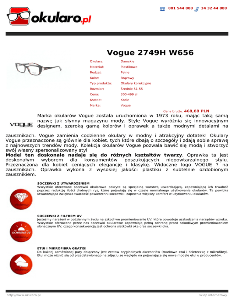 801 544 888 34 32 44 888 Vogue 2749H W656 Okulary: Damskie Materiał: Plastikowe Rodzaj: Pełne Kolor: Brązowy Typ produktu: Okulary korekcyjne Rozmiar: Średnie 51-55 Cena: 300-499 zł Kształt: Kocie Marka: Vogue Cena brutto: 468,88 PLN Marka okularów Vogue została uruchomiona w 1973 roku, mając taką samą nazwę jak słynny magazynu mody. Style Vogue wyróżnia się innowacyjnym designem, szeroką gamą kolorów i oprawek a także modnymi detalami na zausznikach. Vogue zamienia codzienne okulary w modny i atrakcyjny dotatek! Okulary Vogue przeznaczone są głównie dla kobiet, tych które dbają o szczegóły i zdają sobie sprawę z najnowszych trendów mody. Kolekcja okularów Vogue pozwala bawić się modą i stworzyć swój własny spersonalizowany styl Model ten doskonale nadaje się do różnych kształtów twarzy. Oprawka ta jest doskonałym wyborem dla konsumentów poszukujących niepowtarzalnego stylu. Przeznaczona dla kobiet ceniących elegancję i klasykę. Widoczne logo VOGUE ? na zausznikach. Oprawka wykona z wysokiej jakości plastiku z subtelnie ozdobionym zausznikiem. SOCZEWKI Z UTWARDZENIEM Wszystkie oferowane soczewki okularowe pokryte są specjalną warstwą utwardzającą, zapewniającą ich trwałość poprzez redukcję ilości drobnych rys, które pojawiają się w czasie normalnego użytkowania okularów. Ta powłoka utwardzająca zwiększa twardość powierzchni soczewki i zapewnia większy komfort w użytkowaniu okularów. SOCZEWKI Z FILTREM UV Jesteśmy narażeni w codziennym życiu na szkodliwe promieniowanie UV, które powoduje uszkodzenia narządów wzroku. Wszystkie oferowane przez nas soczewki okularowe zapewniają pełną ochronę przed szkodliwym promieniowaniem słonecznym UV, czego konsekwencją jest ochrona siatkówki oka oraz soczewki oka. ETUI I MIKROFIBRA GRATIS! Do każdej zamówionej pary dołączony jest zestaw oryginalnych akcesoriów (markowe etui i ściereczkę z mikrofibry). Etui może różnić się od przedstawionego na zdjęciu ze względu na pojawiające się nowe modele etui u producentów. http://www.okularo.pl sklep internetowy 801 544 888 34 32 44 888 WYSYŁKA 24H Towar dostępny w naszym magazynie. Wysyłamy w ciągu 24h. W przypadku okularów korekcyjnych termin może ulec zmianie w zależności od wybranych soczewek okularowych. 100% SATYSFAKCJI Z ZAKUPU Dokładamy wszelkich starań aby satysfakcja z zakupów u nas była 100-procentowa! Dlatego do każdego zamówionego u nas towaru dajemy 10-dniową gwarancję satysfakcji. Gwarantujemy Ci możliwość rezygnacji z dokonanego zakupu bez podania przyczyny w ciągu 10 dni od daty odebrania przesyłki. Zwracany towar nie może być używany, opakowanie ani żaden inny element wyposażenia nie mogą nosić śladów użytkowania ani zniszczenia, powinien być kompletny i zwrócony w oryginalnym opakowaniu firmowym producenta wraz z wszelkimi dodatkami. Przed wysłaniem przesyłki należy skontaktować sie z działem obsługi klientów okularo.pl. GWARANCJA 12 MIESIĘCY Zwracamy szczególną uwagę na jakość wykonując okulary na zamówienie zgodnie z Twoją receptą. Jeśli w okresie 1 roku od zakupu pojawią się jakiekolwiek wady w zakupionych okularach, będziemy je naprawiać lub wymieniać na nowe bez żadnych opłat. Wszystkie oferowane przez nas towary posiadają gwarancję producenta, dystrybutora lub sprzedawcy na okres co najmniej 12 miesięcy. 100% ORYGINAŁ Wszystkie oferowane przez nas produkty są fabrycznie nowe w oryginalnych opakowaniach z gwarancją jakości i oryginalności. PRZESYŁKA GRATIS! Zamawiając ten produkt nie płacisz za przesyłkę. ZESTAW DO PIELĘGNACJI OKULARÓW GRATIS! W prezencie otrzymujesz zestaw do pielęgnacji okularów o wartości 30zł! http://www.okularo.pl sklep internetowy