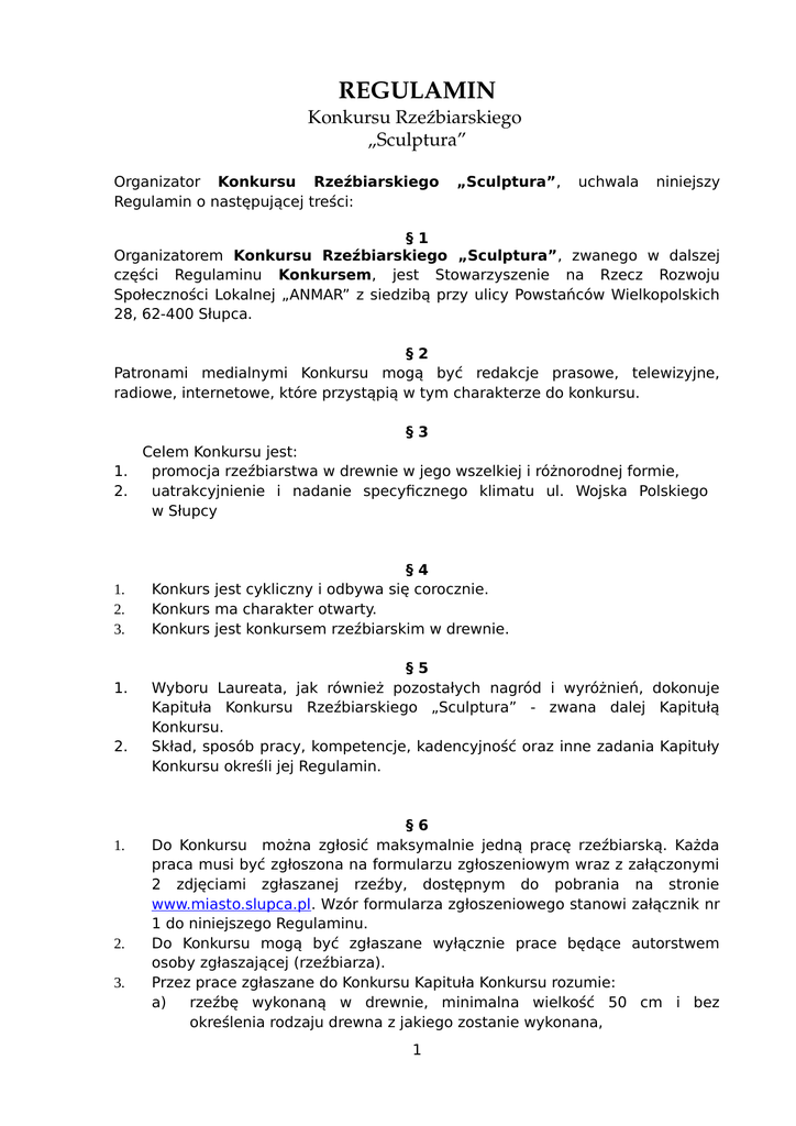 REGULAMIN Konkursu Rzeźbiarskiego „Sculptura” Organizator Konkursu Rzeźbiarskiego Regulamin o następującej treści: „Sculptura”, uchwala niniejszy §1 Organizatorem Konkursu Rzeźbiarskiego „Sculptura”, zwanego w dalszej części Regulaminu Konkursem, jest Stowarzyszenie na Rzecz Rozwoju Społeczności Lokalnej „ANMAR” z siedzibą przy ulicy Powstańców Wielkopolskich 28, 62-400 Słupca. §2 Patronami medialnymi Konkursu mogą być redakcje prasowe, telewizyjne, radiowe, internetowe, które przystąpią w tym charakterze do konkursu. §3 Celem Konkursu jest: 1. promocja rzeźbiarstwa w drewnie w jego wszelkiej i różnorodnej formie, 2. uatrakcyjnienie i nadanie specyficznego klimatu ul. Wojska Polskiego w Słupcy 1. 2. 3. 1. 2. 1. 2. 3. §4 Konkurs jest cykliczny i odbywa się corocznie. Konkurs ma charakter otwarty. Konkurs jest konkursem rzeźbiarskim w drewnie. §5 Wyboru Laureata, jak również pozostałych nagród i wyróżnień, dokonuje Kapituła Konkursu Rzeźbiarskiego „Sculptura” - zwana dalej Kapitułą Konkursu. Skład, sposób pracy, kompetencje, kadencyjność oraz inne zadania Kapituły Konkursu określi jej Regulamin. §6 Do Konkursu można zgłosić maksymalnie jedną pracę rzeźbiarską. Każda praca musi być zgłoszona na formularzu zgłoszeniowym wraz z załączonymi 2 zdjęciami zgłaszanej rzeźby, dostępnym do pobrania na stronie www.miasto.slupca.pl. Wzór formularza zgłoszeniowego stanowi załącznik nr 1 do niniejszego Regulaminu. Do Konkursu mogą być zgłaszane wyłącznie prace będące autorstwem osoby zgłaszającej (rzeźbiarza). Przez prace zgłaszane do Konkursu Kapituła Konkursu rozumie: a) rzeźbę wykonaną w drewnie, minimalna wielkość 50 cm i bez określenia rodzaju drewna z jakiego zostanie wykonana, 1 b) nawiązującą do dziedzictwa kulturowego Polski, w szczególności województwa Wielkopolskiego, c) lub nawiązująca do aspektu przyrodniczego Polski. 4. Prace mogą zgłaszać do Konkursu: a) ich pełnoletni autorzy, 5. Zgłoszenie do Konkursu musi zawierać: a) wypełniony formularz zgłoszeniowy, dostępny na stronie www.miasto.slupca.pl, b) dwa zdjęcia przedstawiające zgłoszoną do konkursu rzeźbę, c) oświadczenie autora pracy konkursowej zgłoszonej do udziału w Konkursie (załącznik nr 3 do niniejszego regulaminu). 6. Zgłoszenia do Konkursu można wykonać na dwa sposoby: a) wypełniony formularz zgłoszeniowy wraz z dwoma zdjęciami zgłaszanej rzeźby, wraz z oświadczeniem o prawach autora do zgłaszanej rzeźby można przesłać listownie na adres: Stowarzyszenie na Rzecz Rozwoju Społeczności Lokalnej „ANMAR”, ul. Powstańców Wielkopolskich 28, 62400 Słupca lub Urząd Miasta w Słupcy, ul. Pułaskiego 21, 62-400 Słupca. b) Wypełniony formularz zgłoszeniowy wraz z dwoma załączonymi zdjęciami zgłaszanej rzeźby oraz podpisanym oświadczeniem o prawach autora do zgłaszanej rzeźby można przesłać elektronicznie na adres: [email protected] lub [email protected]. 6. Termin zgłaszania prac do Konkursu upływa 31 sierpnia każdego roku kalendarzowego. 7. Prace zgłoszone do Konkursu po terminie lub niespełniające pozostałych powyższych wymogów formalnych, zostaną odrzucone i nie będą brały udziału w Konkursie. 8. Organizator zastrzega sobie prawo do wyłączenia z udziału w Konkursie prac o niskiej jakości technicznej, a także naruszających prawo, dobre obyczaje oraz godność człowieka. 9. Zgłoszenie pracy do Konkursu oznacza jednocześnie akceptację niniejszego Regulaminu i poddanie się jego postanowieniom w całości. 10. Wszelkich informacji o Konkursie udziela: Prezes Stowarzyszenia na Rzecz Rozwoju Społeczności Lokalnej „ANMAR”, tel. 724-487-148 lub e-mail: [email protected]. 1. 2. 3. 1. §7 Do Konkursu dopuszczone zostaną prace spełniające najwyższe standardy rzeźbiarskie pod względem formy wykonania. W pierwszej kolejności brane pod uwagę będą prace nawiązujące do dziedzictwa kulturowego regionu wielkopolskiego. Związek zgłaszanej pracy z regionem nie musi być jej tematem wiodącym. §8 Konkurs składa się z dwóch etapów: a) etap pierwszy: kwalifikacja formalna prac do dalszych etapów Konkursu przez Kapitułę Konkursu - do 31 sierpnia, b) etap drugi: wybór trzech najlepszych prac rzeźbiarskich, do 10 września 2 2. c) etap trzeci: wybór przez Kapitułę Konkursu Laureata - do 30 września, Po wyłonieniu laureata Konkursu, Organizator poda nazwiska osób nagrodzonych prac oraz tytuły ich prac do publicznej wiadomości. §9 1. 2. 3. 4. 1. 2. 3. Nagrodami w Konkursie są: Nagroda Główna I stopnia – 800 zł brutto, Nagroda Główna II stopnia – 350 zł brutto, Nagroda Główna III stopnia – 250 zł brutto. oraz w miarę możliwości finansowych Nagrody Główne kolejnych stopni i wyróżnienia. § 10 Laureatowi Konkursu przyznana zostaje Nagroda Główna I stopnia. Nagrodę Główną I stopnia Kapituła Konkursu przyznaje za wybitną pracę dotyczącą dziedzictwa kulturowego Polski, w szczególności województwa wielkopolskiego. Oprócz finansowej gratyfikacji każdy laureat oraz pozostałe osoby nagrodzone i wyróżnione otrzymają dyplom. § 11 Kapituła Konkursu może nie przyznać Nagrody Głównej I stopnia, przyznając jednocześnie Nagrody Główne II i III stopnia oraz wyróżnienia. § 12 Rozstrzygnięcia Kapituły Konkursu są ostateczne. 1. 2. 3. § 13 Uroczystość ogłoszenia laureata Konkursu oraz wręczania nagród odbywać się będzie w miesiącu wrześniu w miejscu wskazanym każdorazowo przez organizatora Konkursu. Organizatorzy Konkursu zastrzegają sobie prawo zmiany terminu uroczystości. O terminie uroczystości ogłoszenia laureata Konkursu oraz wręczania pozostałych nagród i wyróżnień uczestnicy Konkursu zostaną powiadomieniu drogą elektroniczną. § 14 1. Organizatorzy zastrzegają sobie prawo do wykorzystania nadesłanych zdjęć i nagrodzonych prac rzeźbiarskich na własnych stronach