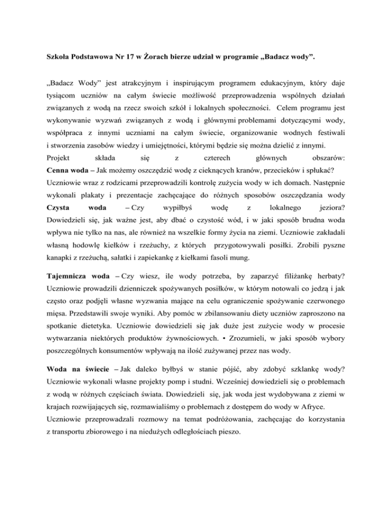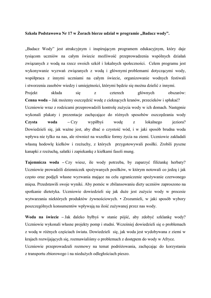 Szkoła Podstawowa Nr 17 w Żorach bierze udział w programie „Badacz wody”. „Badacz Wody” jest atrakcyjnym i inspirującym programem edukacyjnym, który daje tysiącom uczniów na całym świecie możliwość przeprowadzenia wspólnych działań związanych z wodą na rzecz swoich szkół i lokalnych społeczności. Celem programu jest wykonywanie wyzwań związanych z wodą i głównymi problemami dotyczącymi wody, współpraca z innymi uczniami na całym świecie, organizowanie wodnych festiwali i stworzenia zasobów wiedzy i umiejętności, którymi będzie się można dzielić z innymi. Projekt składa się z czterech głównych obszarów: Cenna woda – Jak możemy oszczędzić wodę z cieknących kranów, przecieków i spłukać? Uczniowie wraz z rodzicami przeprowadzili kontrolę zużycia wody w ich domach. Następnie wykonali plakaty i prezentacje zachęcające do różnych sposobów oszczędzania wody Czysta woda – Czy wypiłbyś wodę z lokalnego jeziora? Dowiedzieli się, jak ważne jest, aby dbać o czystość wód, i w jaki sposób brudna woda wpływa nie tylko na nas, ale również na wszelkie formy życia na ziemi. Uczniowie zakładali własną hodowlę kiełków i rzeżuchy, z których przygotowywali posiłki. Zrobili pyszne kanapki z rzeżuchą, sałatki i zapiekankę z kiełkami fasoli mung. Tajemnicza woda – Czy wiesz, ile wody potrzeba, by zaparzyć filiżankę herbaty? Uczniowie prowadzili dzienniczek spożywanych posiłków, w którym notowali co jedzą i jak często oraz podjęli własne wyzwania mające na celu ograniczenie spożywanie czerwonego mięsa. Przedstawili swoje wyniki. Aby pomóc w zbilansowaniu diety uczniów zaproszono na spotkanie dietetyka. Uczniowie dowiedzieli się jak duże jest zużycie wody w procesie wytwarzania niektórych produktów żywnościowych. • Zrozumieli, w jaki sposób wybory poszczególnych konsumentów wpływają na ilość zużywanej przez nas wody. Woda na świecie – Jak daleko byłbyś w stanie pójść, aby zdobyć szklankę wody? Uczniowie wykonali własne projekty pomp i studni. Wcześniej dowiedzieli się o problemach z wodą w różnych częściach świata. Dowiedzieli się, jak woda jest wydobywana z ziemi w krajach rozwijających się, rozmawialiśmy o problemach z dostępem do wody w Afryce. Uczniowie przeprowadzali rozmowy na temat podróżowania, zachęcając do korzystania z transportu zbiorowego i na niedużych odległościach pieszo. Prowadzili monitoring zużycia papieru w szkole oraz prowadzenia selektywnej zbiórki odpadów. 24 czerwca w Szkole Podstawowej nr 17 w Żorach odbył się Festiwal Wody. Uczniowie oglądali film pt. "rejs idealną rzeką" o florze i faunie czystej rzeki. Układali puzzle dotyczące oszczędzania wody, przygotowane przez panią z języka angielskiego - puzzle w języku angielskim. Przypomnieli sobie informacje dotyczące problemu tajemniczej wody i sposoby oszczędzania wody. Mieliśmy również okazję zobaczyć wystawę studni i pomp wykonanych przez naszych uczniów w ramach projektu. Dwukrotnie byliśmy szkołą miesiąca i otrzymaliśmy nagrodę - aparat fotograficzny. W tym roku szkolnym zamierzamy kontynuować program „Badacz wody” oraz zachęcamy inne szkoły do włączenia się w działania. Marzena Łyp Monika Czaja