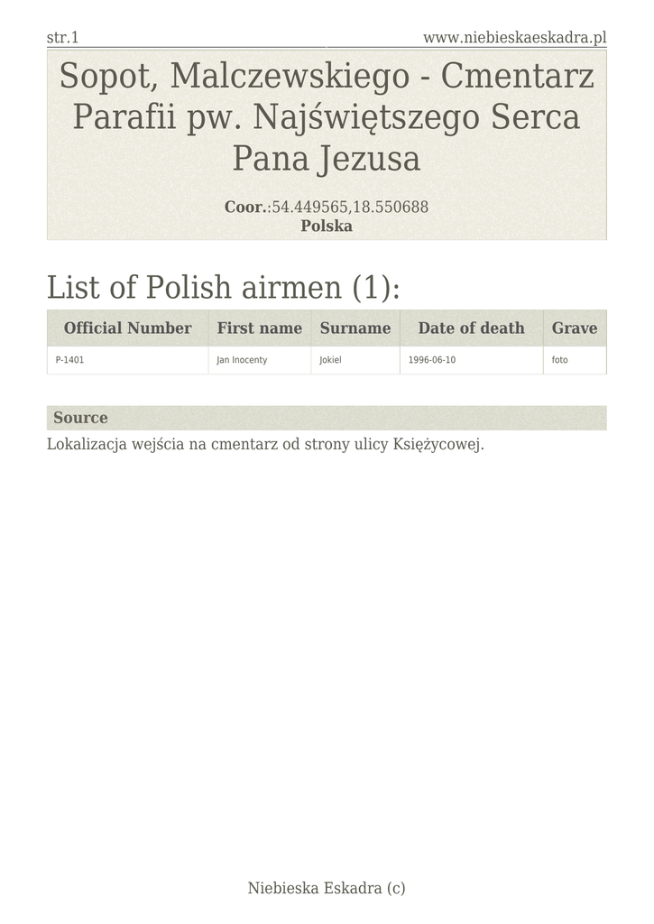 str.1 www.niebieskaeskadra.pl Sopot, Malczewskiego - Cmentarz Parafii pw. Najświętszego Serca Pana Jezusa Coor.:54.449565,18.550688 Polska List of Polish airmen (1): Official Number P-1401 First name Surname Jan Inocenty Jokiel Date of death 1996-06-10 Source Lokalizacja wejścia na cmentarz od strony ulicy Księżycowej. Niebieska Eskadra (c) Grave foto