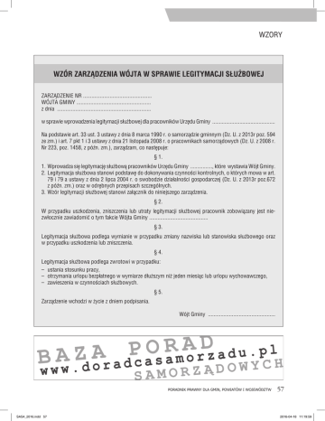 WZORY WZÓR ZARZĄDZENIA WÓJTA W SPRAWIE LEGITYMACJI SŁUŻBOWEJ ZARZĄDZENIE NR ................................................. WÓJTA GMINY ..................................................... z dnia ................................................................... w sprawie wprowadzenia legitymacji służbowej dla pracowników Urzędu Gminy .............................................. Na podstawie art. 33 ust. 3 ustawy z dnia 8 marca 1990 r. o samorządzie gminnym (Dz. U. z 2013r poz. 594 ze zm.) i art. 7 pkt 1 i 3 ustawy z dnia 21 listopada 2008 r. o pracownikach samorządowych (Dz. U. z 2008 r. Nr 223, poz. 1458, z późn. zm.), zarządzam, co następuje: § 1. 1.Wprowadza się legitymację służbową pracowników Urzędu Gminy ................, które wystawia Wójt Gminy. 2.Legitymacja służbowa stanowi podstawę do dokonywania czynności kontrolnych, o których mowa w art. 79 i 79 a ustawy z dnia 2 lipca 2004 r. o swobodzie działalności gospodarczej (Dz. U. z 2013r poz.672 z późn. zm.) oraz w odrębnych przepisach szczególnych. 3.Wzór legitymacji służbowej stanowi załącznik do niniejszego zarządzenia. § 2. W przypadku uszkodzenia, zniszczenia lub utraty legitymacji służbowej pracownik zobowiązany jest niezwłocznie zawiadomić o tym fakcie Wójta Gminy .......................................... § 3. Legitymacja służbowa podlega wymianie w przypadku zmiany nazwiska lub stanowiska służbowego oraz w przypadku uszkodzenia lub zniszczenia. § 4. Legitymacja służbowa podlega zwrotowi w przypadku: – ustania stosunku pracy, – otrzymania urlopu bezpłatnego w wymiarze dłuższym niż jeden miesiąc lub urlopu wychowawczego, – zawieszenia w czynnościach służbowych. § 5. Zarządzenie wchodzi w życie z dniem podpisania. Wójt Gminy ................................................ Poradnik PRAWNY dla gmin, powiatów i województw SAS4_2016.indd 57 57 2016-04-18 11:19:59