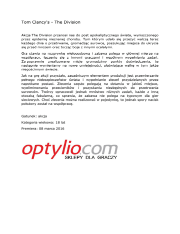 Tom Clancy's - The Division Akcja The Division przenosi nas do post apokaliptycznego świata, wyniszczonego przez epidemię nieznanej choroby. Tym którym udało się przeżyć walczą teraz każdego dnia o przetrwanie, gromadząc surowce, poszukując miejsca do ukrycia się przed mrozem oraz tocząc boje z innymi ocalałymi. Gra stawia na rozgrywkę wieloosobową i zabawa polega w głównej mierze na współpracy, łączeniu się z innymi graczami i wspólnym wypełnianiu zadań. Za poprawnie zrealizowane misje gromadzimy punkty doświadczenia, te następnie wymieniamy na nowe umiejętności, ułatwiające walkę w tym jakże niegościnnym świecie. Jak na grę akcji przystało, zasadniczym elementem produkcji jest przemierzanie pełnego niebezpieczeństw świata i wypełnianie zleceń przydzielanych przez napotkane postaci. Zlecenia często polegają na dotarciu w jakieś miejsce, wyeliminowaniu przeciwników i pozyskaniu niezbędnych do przetrwania surowców. Twórcy opracowali jednak mnóstwo różnych zadań, każde z inną otoczką fabularną, co sprawia, że zabawa nie polega na typowym dla gier sieciowych. Choć zlecenia można realizować w pojedynkę, to jednak spory nacisk położony został na współpracę. Gatunek: akcja Kategoria wiekowa: 18 lat Premiera: 08 marca 2016