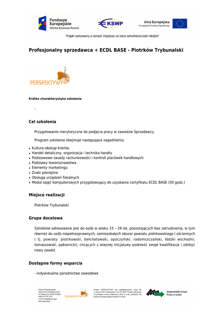Profesjonalny sprzedawca + ECDL BASE - Piotrków Trybunalski . Krótka charakterystyka szkolenia : Cel szkolenia Przygotowanie merytoryczne do podjęcia pracy w zawodzie Sprzedawcy. Program szkolenia obejmuje następujące zagadnienia: ● ● ● ● ● ● ● ● Kultura obsługi klienta. Handel detaliczny, organizacja i technika handlu Podstawowe zasady rachunkowości i kontroli placówek handlowych Podstawy towaroznawstwa Elementy marketingu Znaki pieniężne Obsługa urządzeń fiskalnych Moduł zajęć komputerowych przygotowujący do uzyskania certyfikatu ECDL BASE (50 godz.) Miejsce realizacji Piotrków Trybunalski Grupa docelowa Szkolenie adresowane jest do osób w wieku 15 – 29 lat, pozostających bez zatrudnienia, w tym również do osób niepełnosprawnych, zamieszkałych obszar powiatu piotrkowskiego i ościennych ( tj. powiaty: piotrkowski, bełchatowski, opoczyński, radomszczański, łódzki wschodni, tomaszowski, pabianicki), chcących z własnej inicjatywy podnieść swoje kwalifikacje i zdobyć nowy zawód. Dostępne formy wsparcia - indywidualne poradnictwo zawodowe - grupowe poradnictwo - szkolenie z w/w zakresu - staże zawodowe Zgłoszenia na szkolenie przyjmuje: Biuro Projektu w Piotrkowie Trybunalskim, ul. Sieradzka 10 Weronika Roszak – (44) 647-48-08 Biuro KSWP w Końskich, ul. Staszica 2A Małgorzata Ciaś – (41) 260-46-42 .
